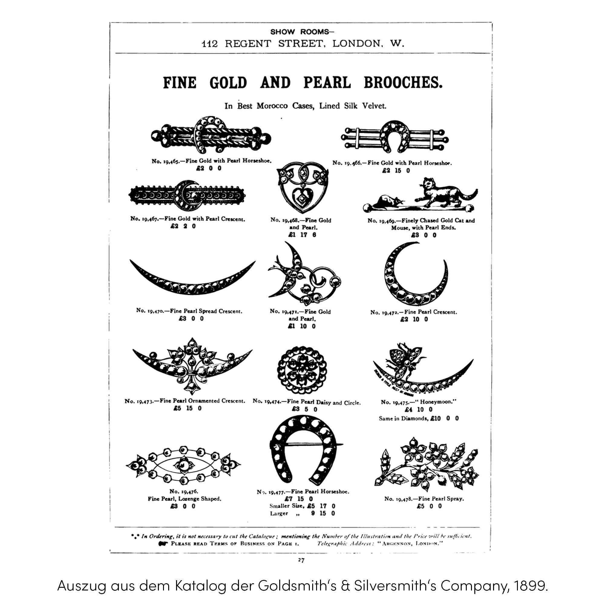 Die Goldsmith’s & Silversmith’s Company war damals einer der führenden Londoner Juweliere. Die Firma betrieb auf der noblen Londoner Regent Street ihren Showroom und verkaufte kleine und größere Kostbarkeiten nach neuestem Geschmack. Aber auch direkt aus dem Katalog konnte die geneigte Dame von Welt ihren Schmuck bestellen, ohne das Haus zu verlassen: Diese komfortable Art, Schmuck zu kaufen, war damals eine erst seit einigen Jahren bestehende Neuheit.