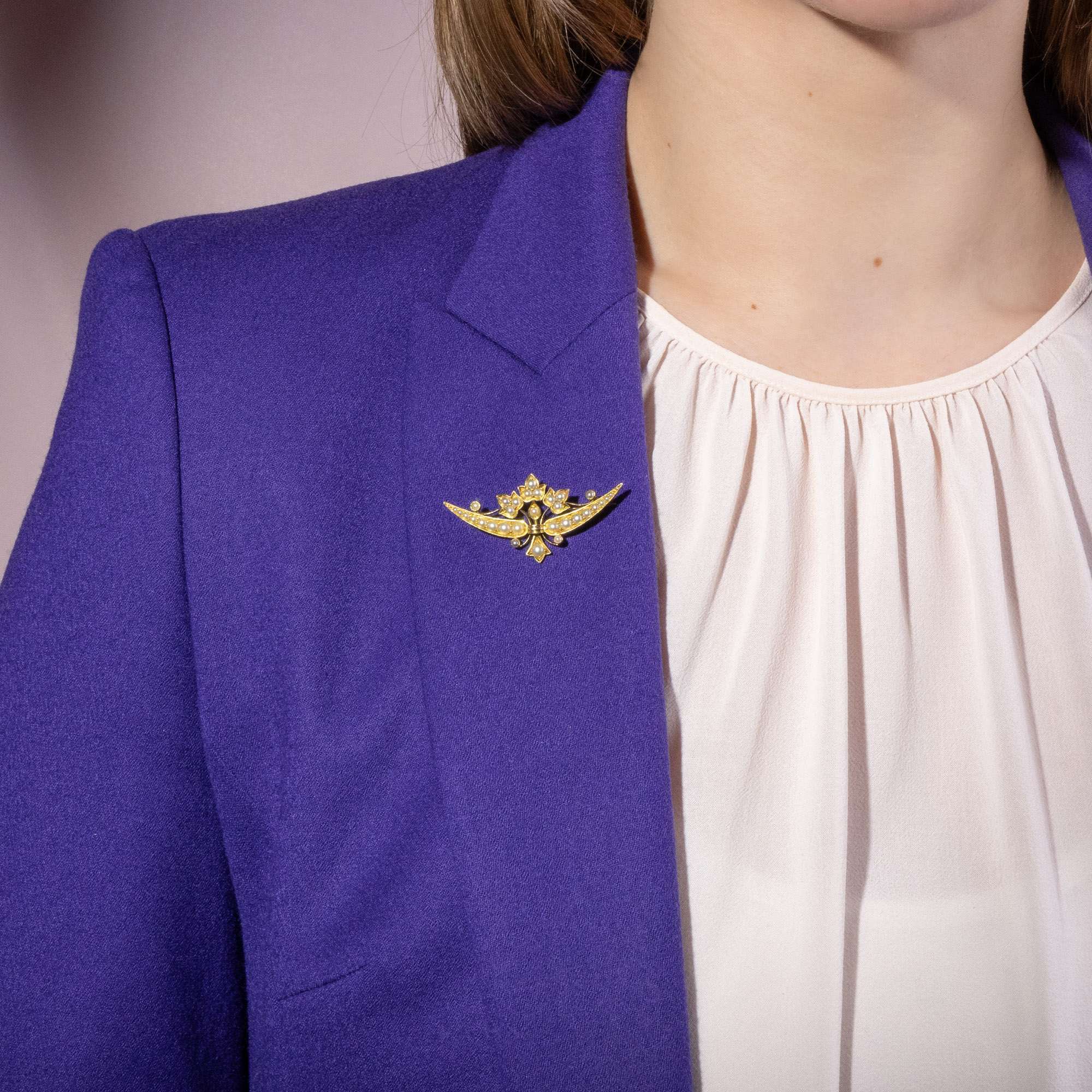 Antike Sichelmond-Brosche mit Naturperlen in Gold, London um 1899