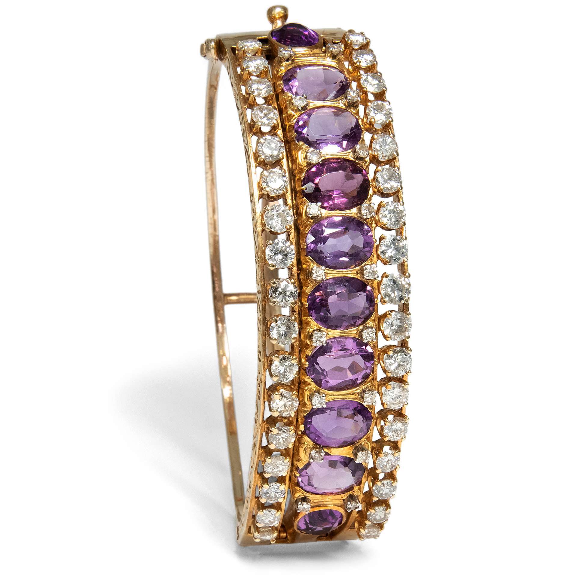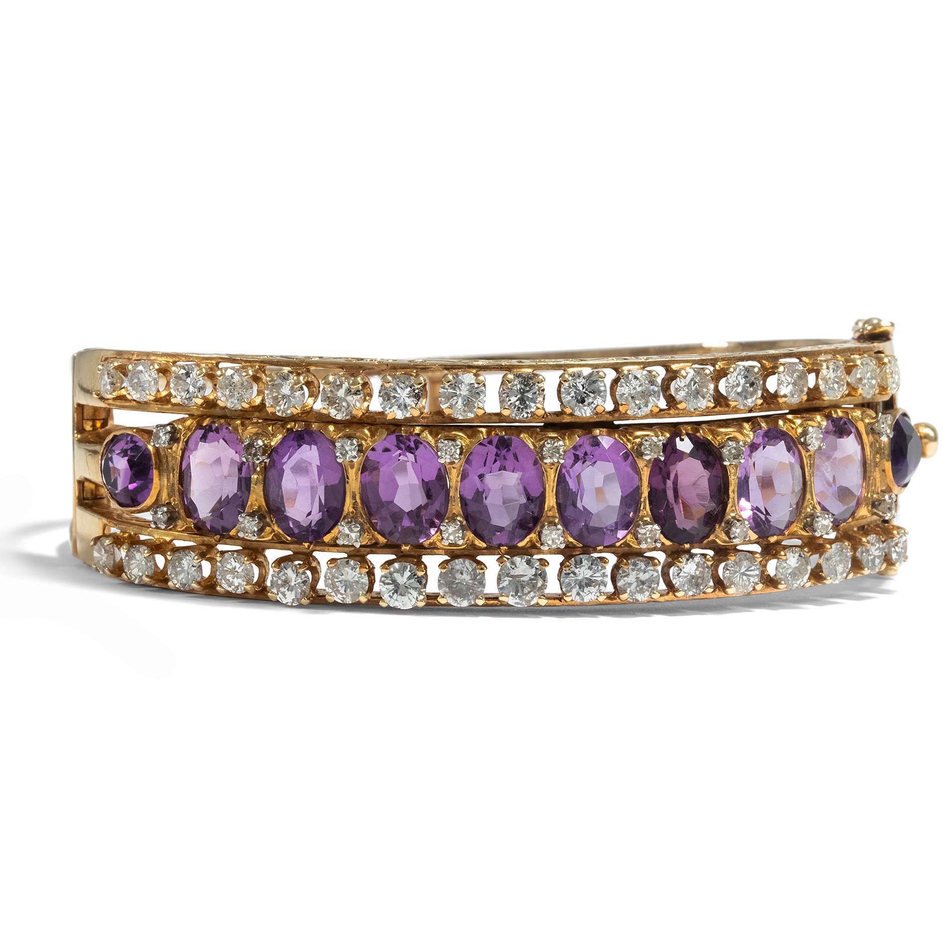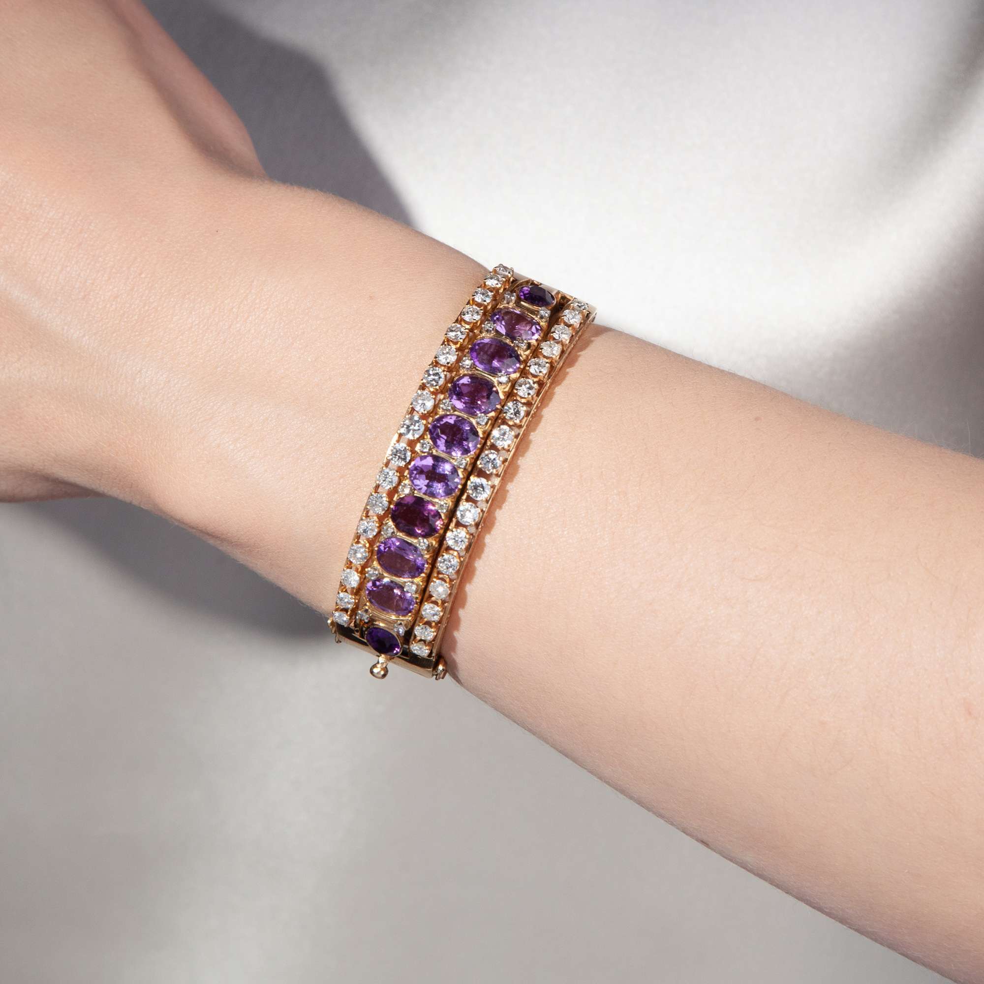Der hier vorliegende Armreif ist da keine Ausnahme. In leicht rötliches, warm glänzendes Gold sind zehn Amethyste und Diamanten in drei parallelen Reihen gefasst. Größere Brillanten außen, die oval facettierten Amethyste in der Mitte. Weitere, kleinere Diamanten begleiten die Amethyste in den Zwickeln zwischen den Steinen. Insgesamt sind hier rund drei Karat Diamanten zusammen mit den violetten Halbedelsteinen präsentiert.