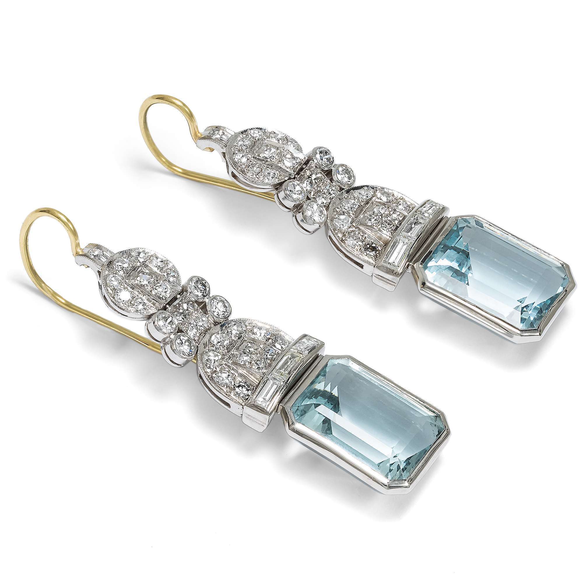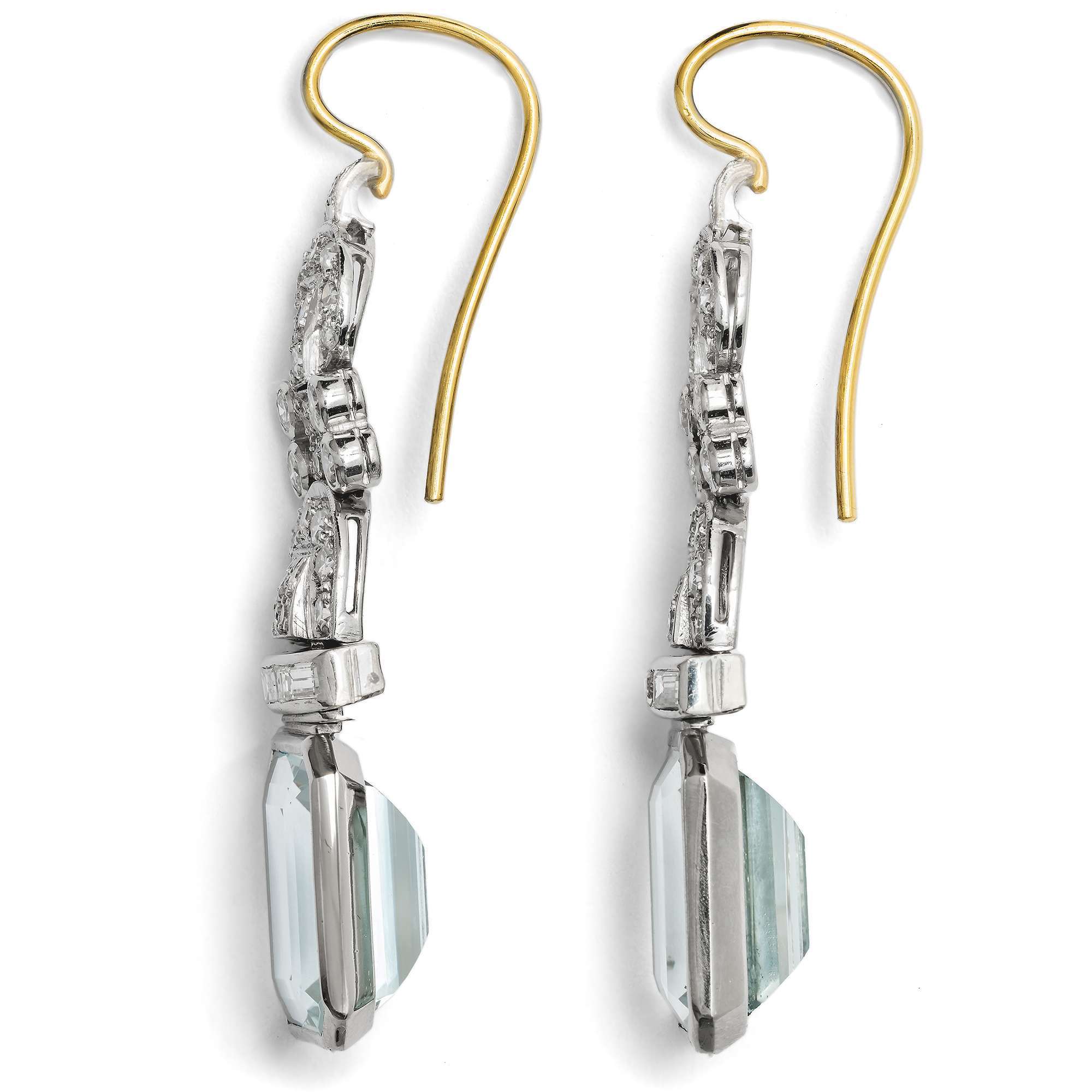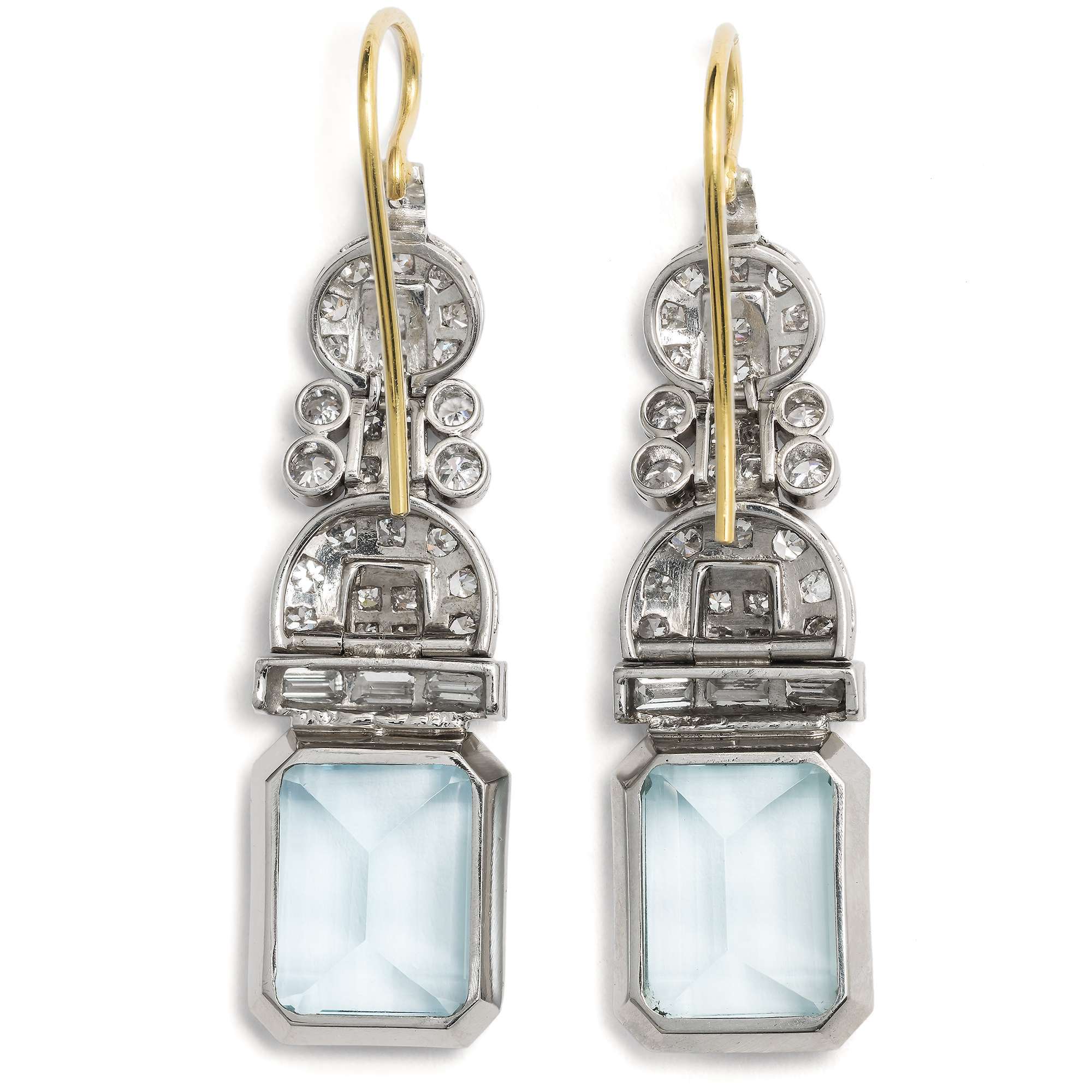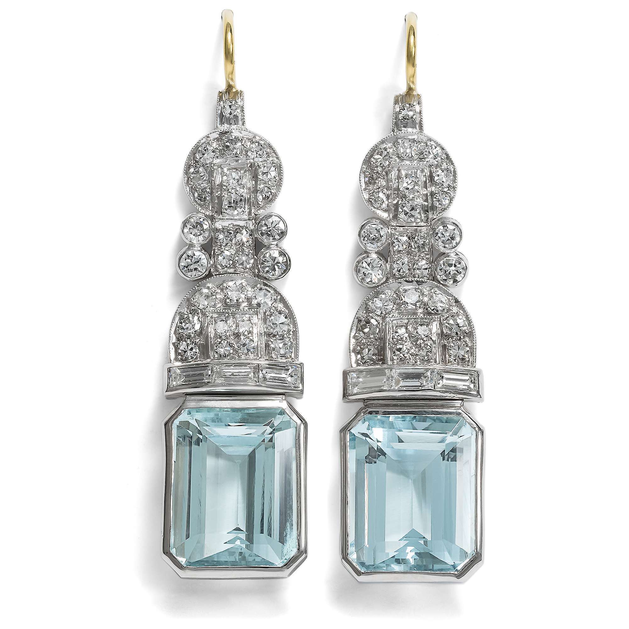 Die diamantbesetzten Elemente aus Platin entstammen einem Uhrenarmband des Art Déco der Jahre um 1930, dem Band einer jener Uhren mit winzigem Zifferblatt, welche heute kaum noch getragen werden. Unser Goldschmied hat die Aquamarine mit ihren Fassungen und die Ohrbügel zu den Elementen ergänzt und so im Geiste des Art Déco diese Ohrringe geschaffen. Durch die Bewegung des Lichts in den Edelsteinen entsteht getragen unablässig ein neues Spiel der Reflexionen. Eine unbedingte Empfehlung für alle Liebhaberinnen aufregender Ohrringe!
