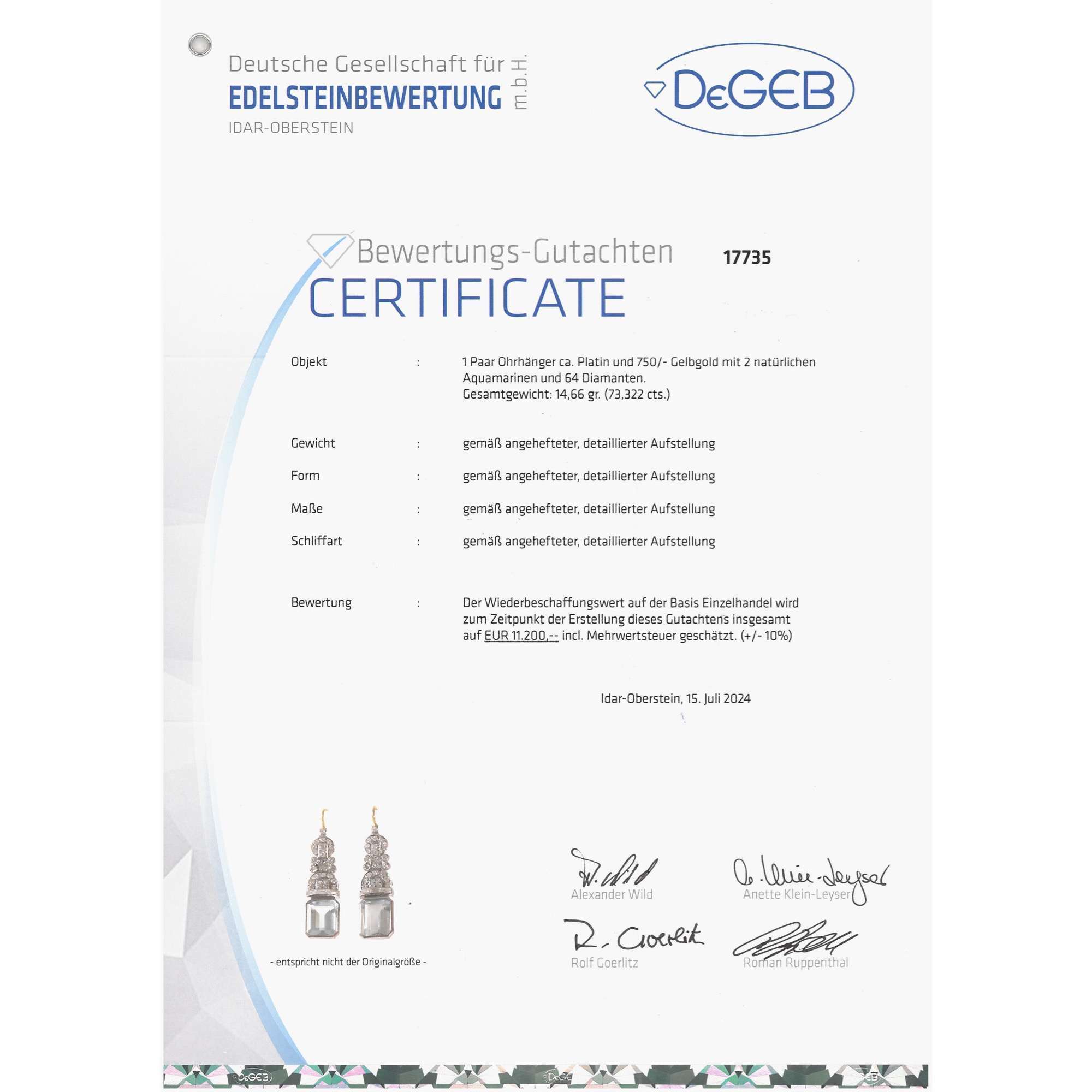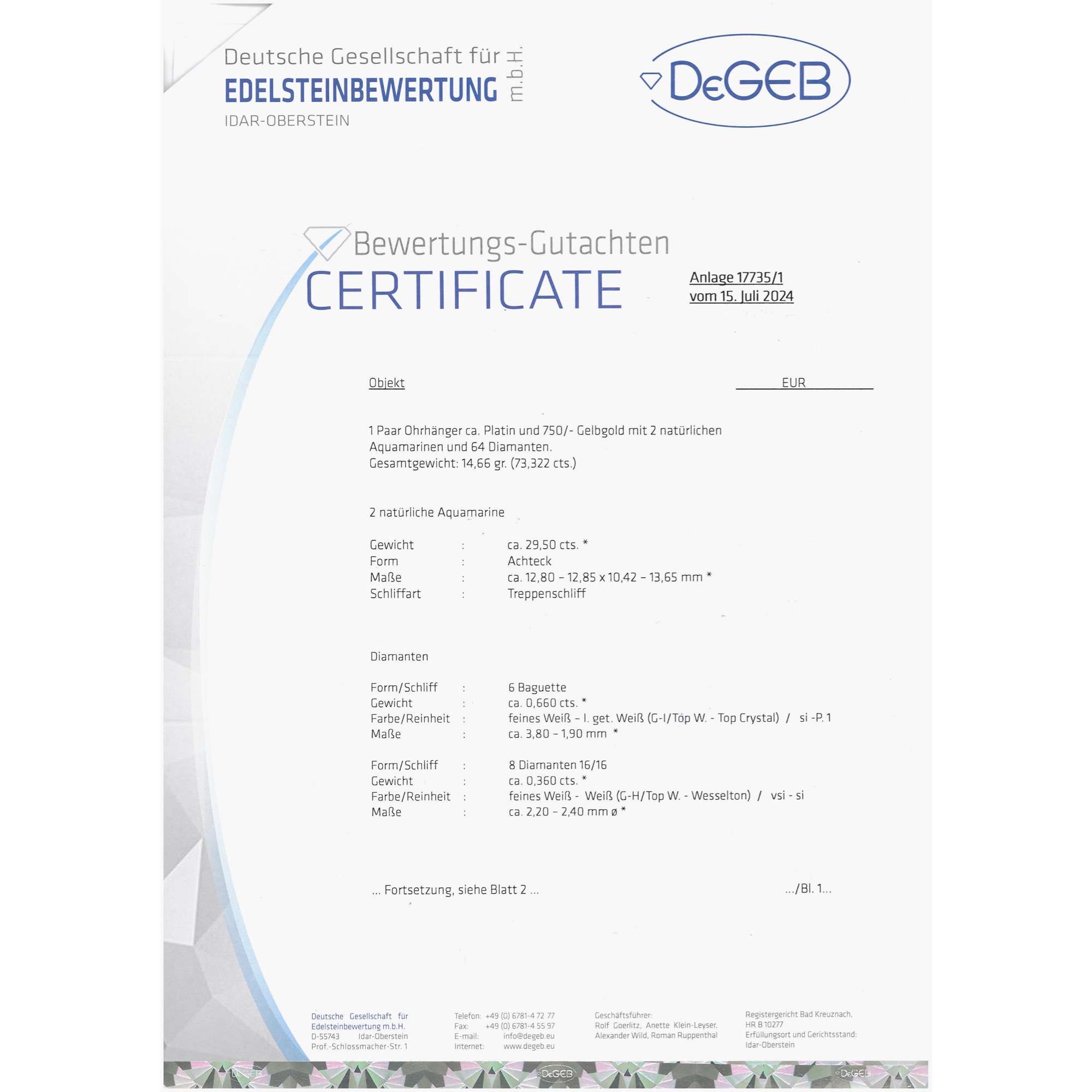 Material: Zwei natürliche Aquamarine im Treppenschliff, zus. ca. 29,50 ct, je etwa 12,8 x 10,4 mm 56 Diamanten im Baguette-, 16/16 und 8/8 Schliff, zus. ca. 2,16 ct, Feines Weiß (Top Wesselton, G) – Leicht getöntes Weiß+ (Top Crystal, I), vsi–pi Ohrbügel Gold 750/000, entspricht 18 Karat Platin