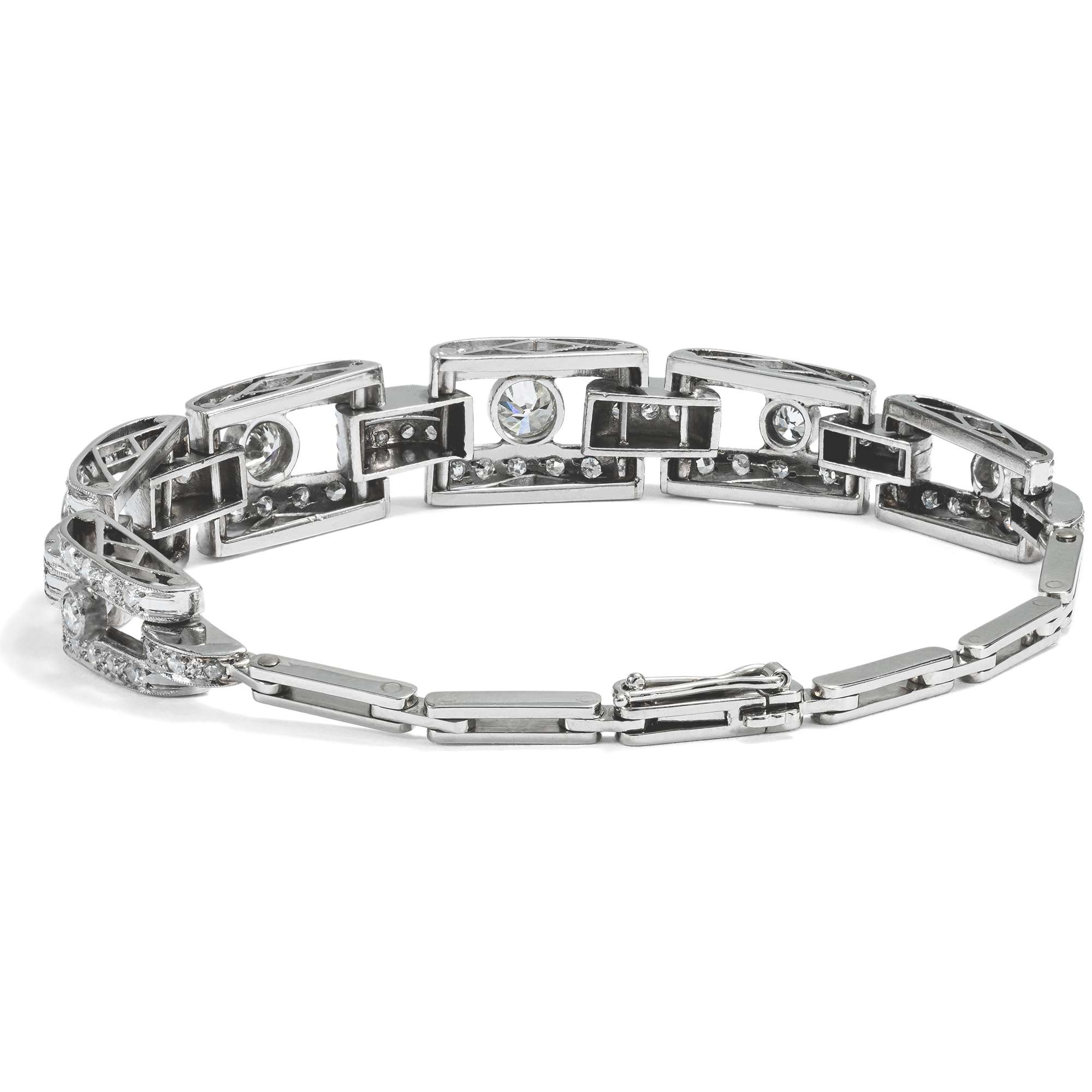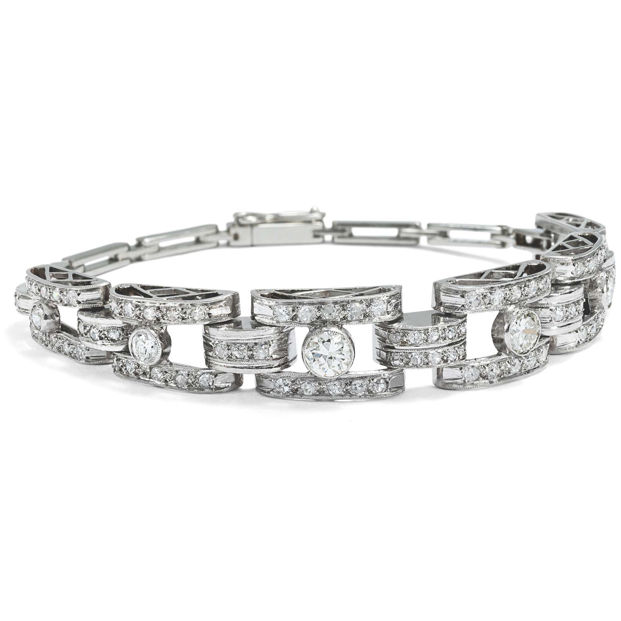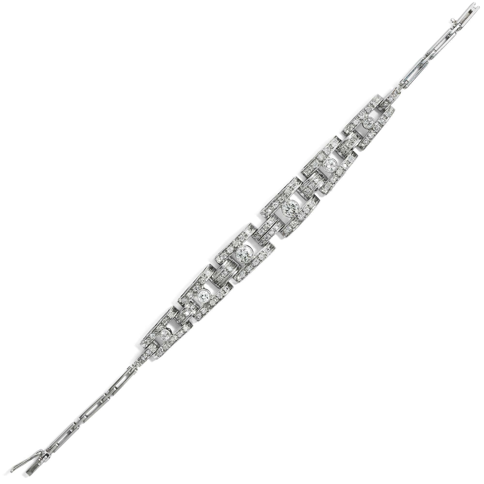 Das hier vorliegende Armband verdeutlicht die glamouröse Ausstrahlung dieser Schmuckgattung besonders gut. Es leuchtet im kühlen Glanz von 92 Diamanten im Alt-und Achtkantschliff und von zusammen etwa 1,80 Karat. Die Edelsteine sind aus Bogenformen aus Platin gesetzt, die von schmalen Weißgoldgliedern gehalten werden.