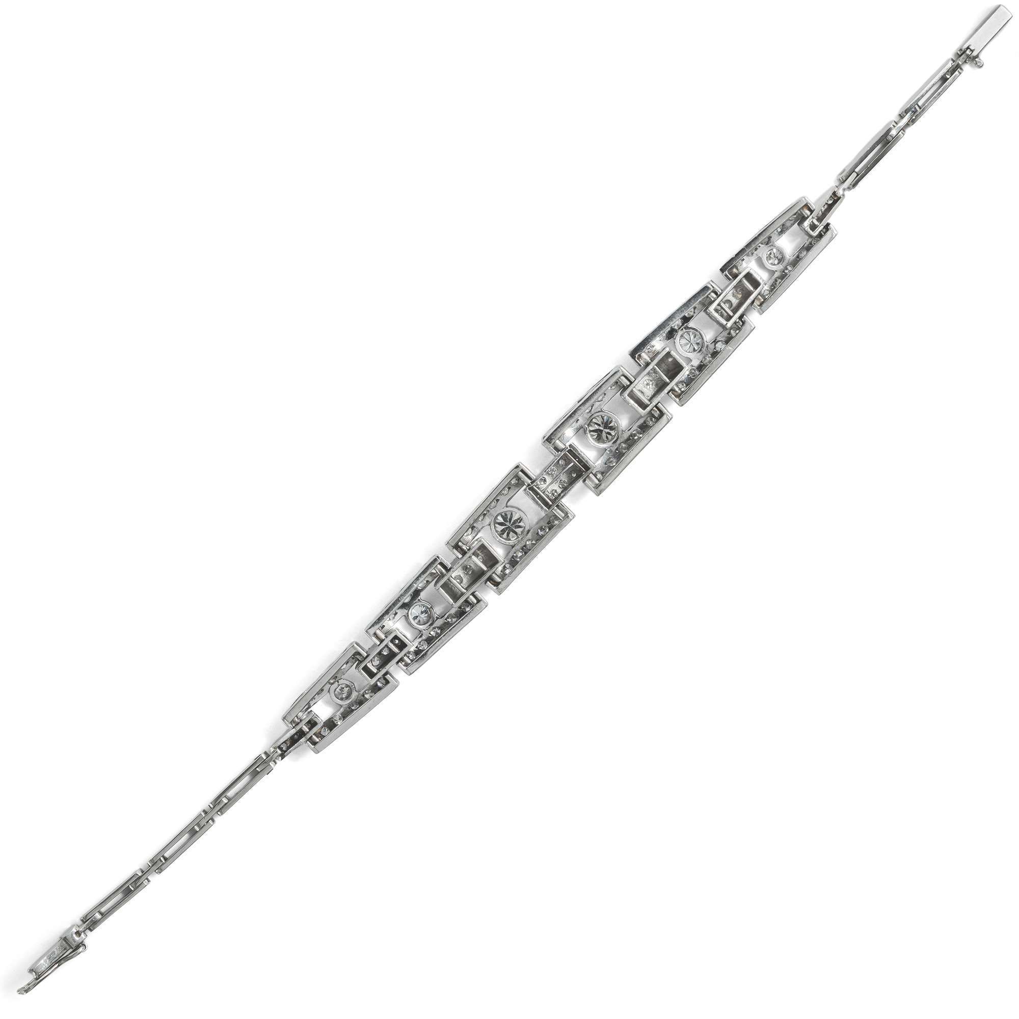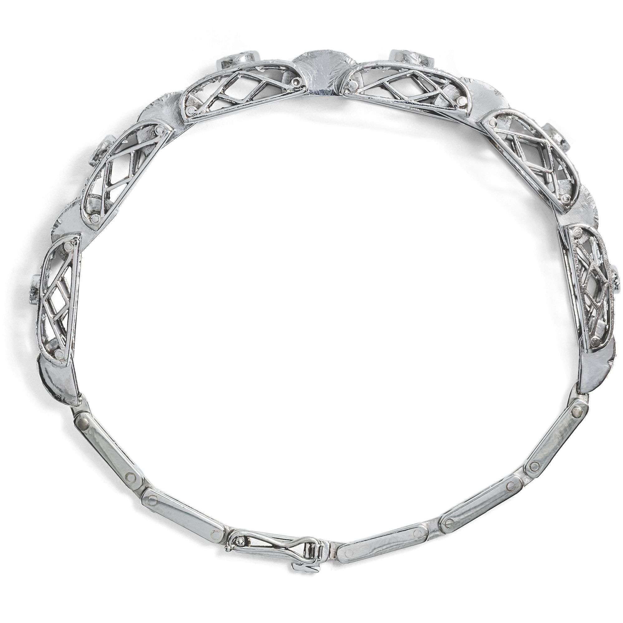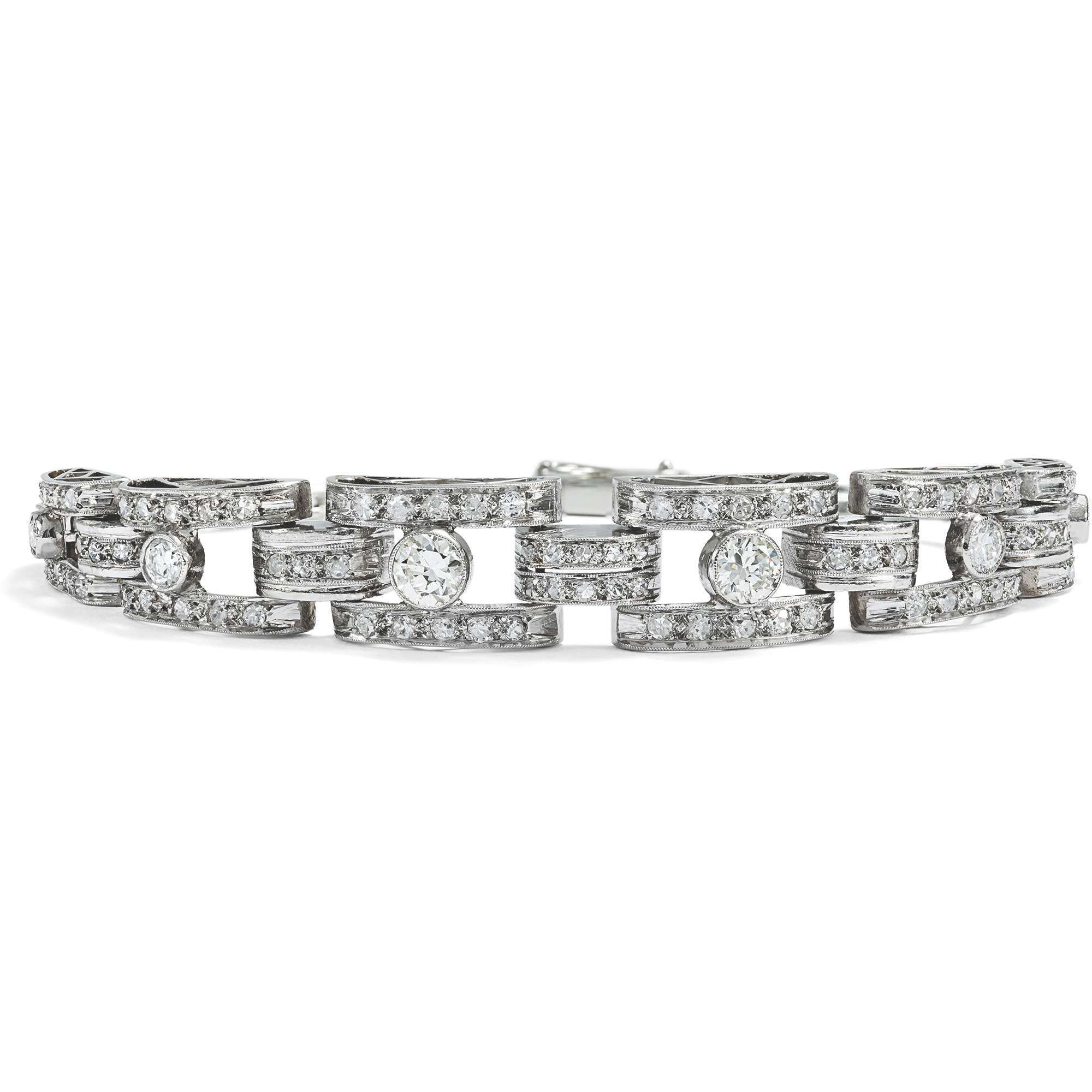 Das hier vorliegende Armband verdeutlicht die glamouröse Ausstrahlung dieser Schmuckgattung besonders gut. Es leuchtet im kühlen Glanz von 92 Diamanten im Alt-und Achtkantschliff und von zusammen etwa 1,80 Karat. Die Edelsteine sind aus Bogenformen aus Platin gesetzt, die von schmalen Weißgoldgliedern gehalten werden.