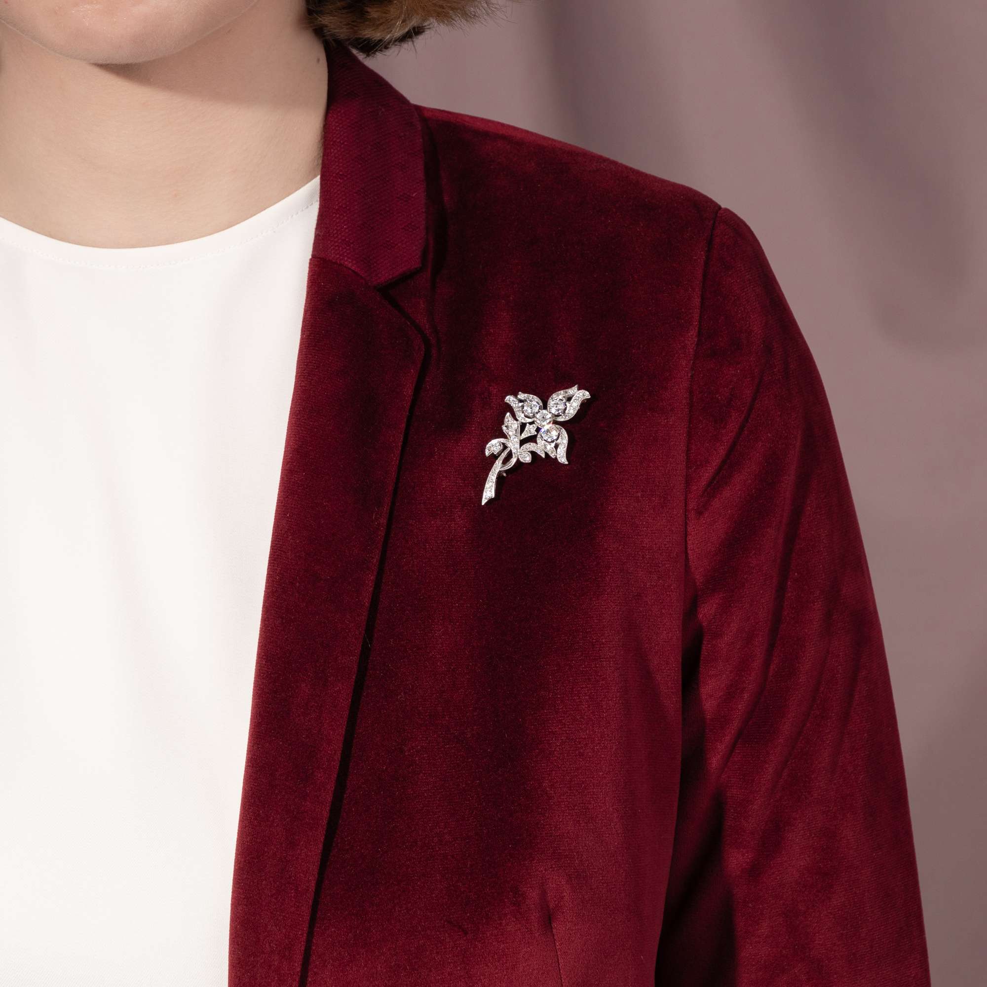 Diese Geschichte erzählen auch die Diamanten selbst weiter, die von unterschiedlicher Qualität und in verschiedenen historischen Schliffen geformt sind: Wer während der Kriegsjahre ein neues Schmuckstück anfertigen ließ, griff hierzu oft zu Diamanten aus Erbstücken, denn die Handelsrouten waren unterbrochen. So leuchten insgesamt etwa 3,35 ct Diamanten in Schliffen, die von der Mitte des 19. bis in das frühe 20. Jahrhundert datieren.