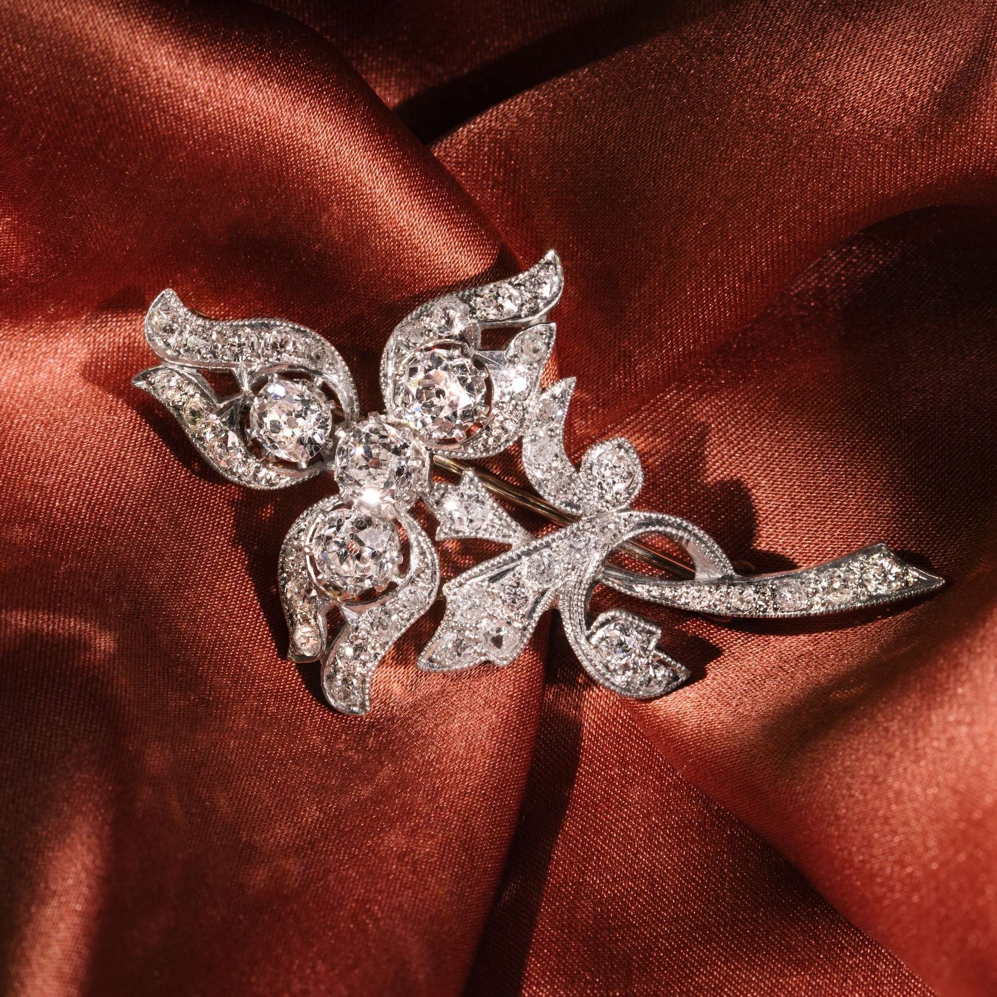 Wann ist ein Lichtblick kostbarer als in dunklen Zeiten? Im übertragenen Sinne war die hier vorliegende Brosche einst ein solcher Lichtblick – im wortwörtlichen ist sie es immer noch, denn sie strahlt weiß im brillanten Feuer feiner Altschliff-Diamanten. Entstanden ist sie in einer besonders dunklen Epoche der Weltgeschichte: Während des zweiten Weltkriegs.