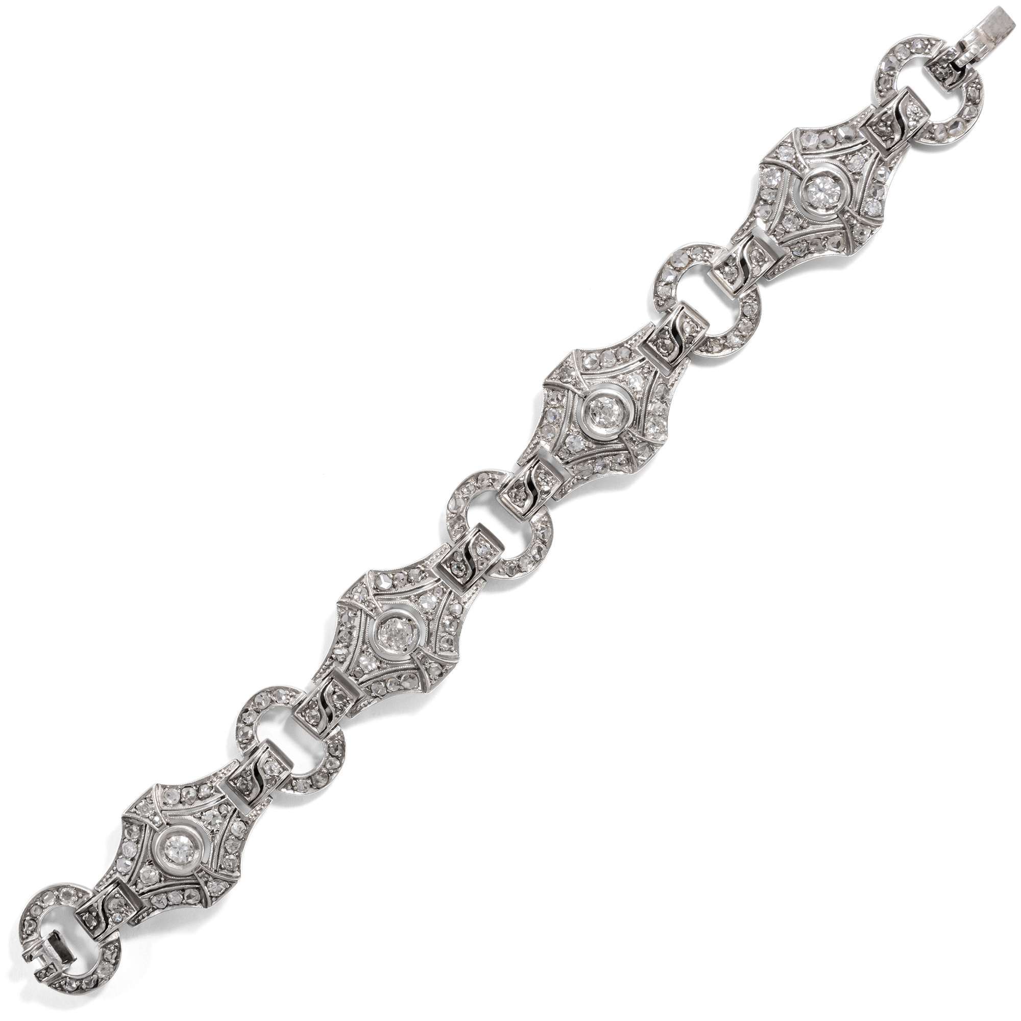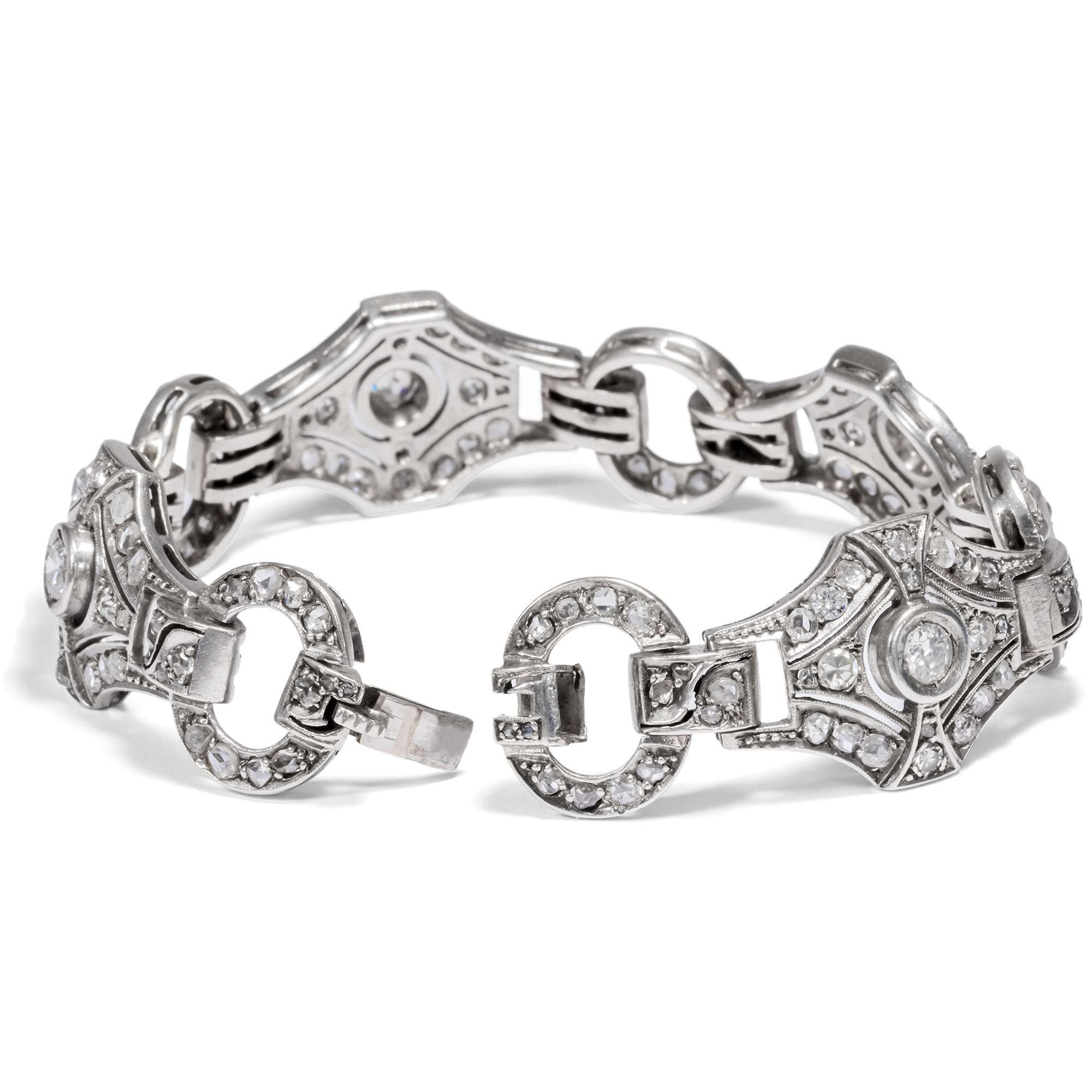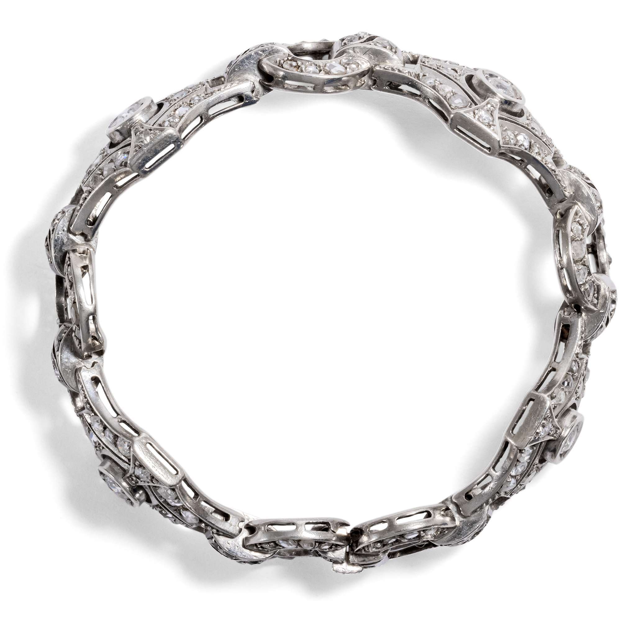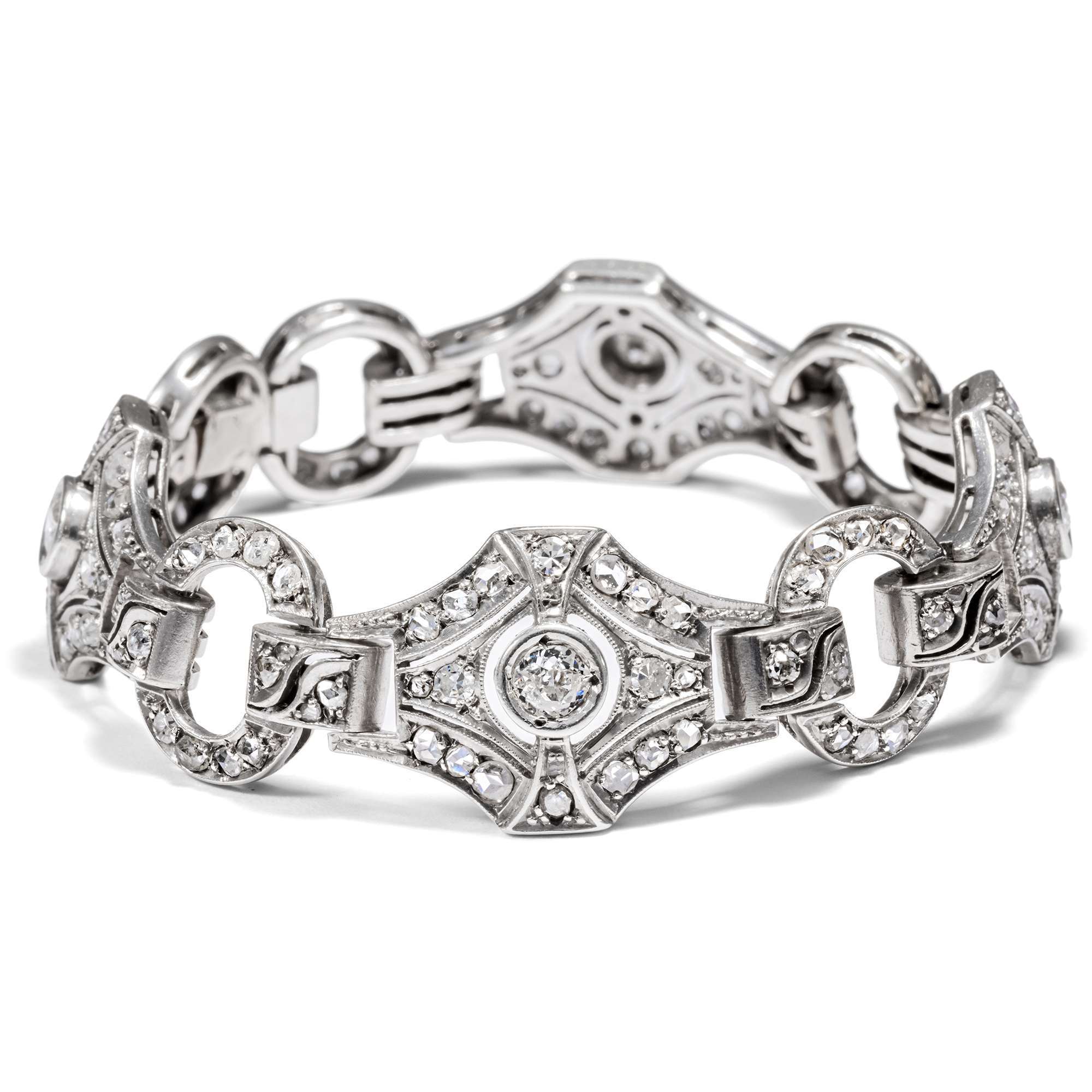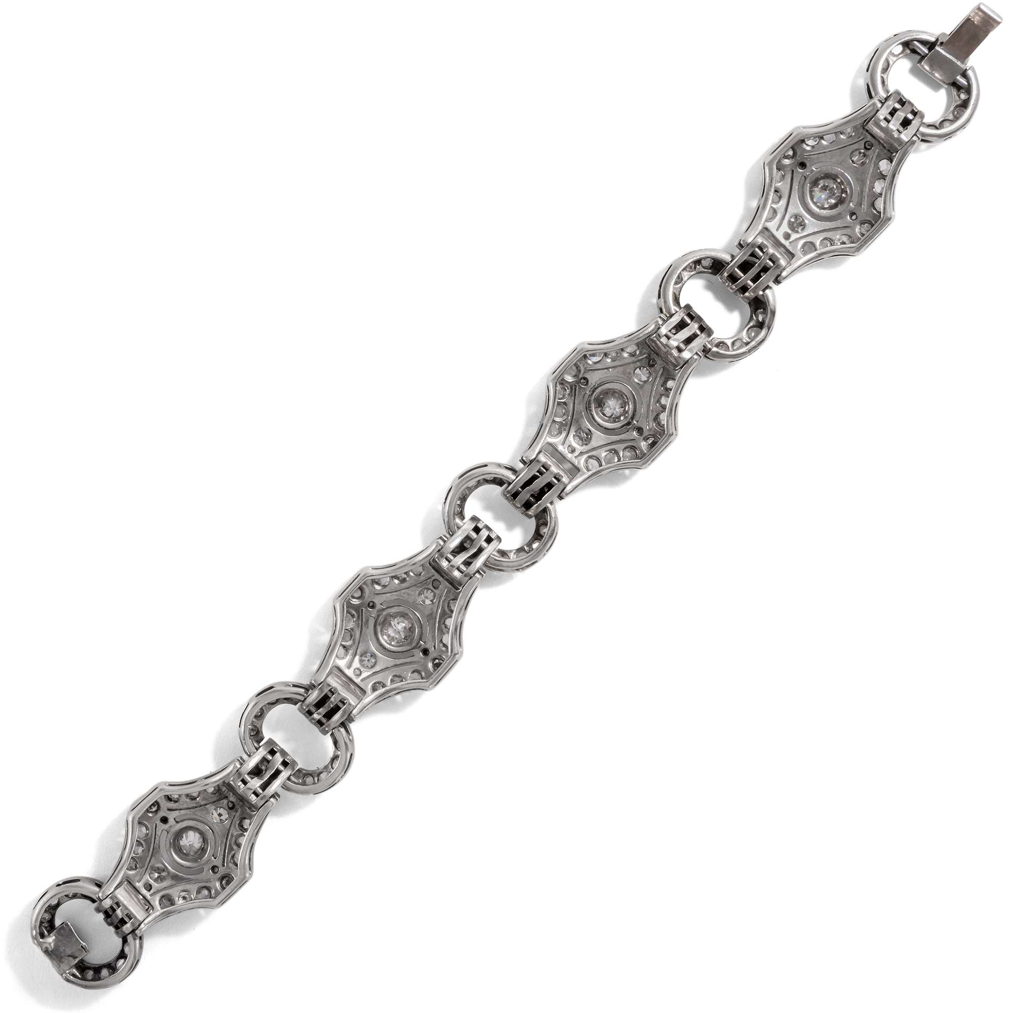Das hier vorliegende Armband veranschaulicht die glamouröse Ausstrahlung dieser Schmuckgattung besonders eindrucksvoll. Es leuchtet im kühlen Glanz von 161 Diamanten unterschiedlicher Schliffe mit einem Gesamtgewicht von etwa 4,31 Karat. Ein Rapport aus feinen Rautenformen, verbunden durch kleinere ovale Ringe als Zwischenglieder, bildet das elegante Schmuckstück.