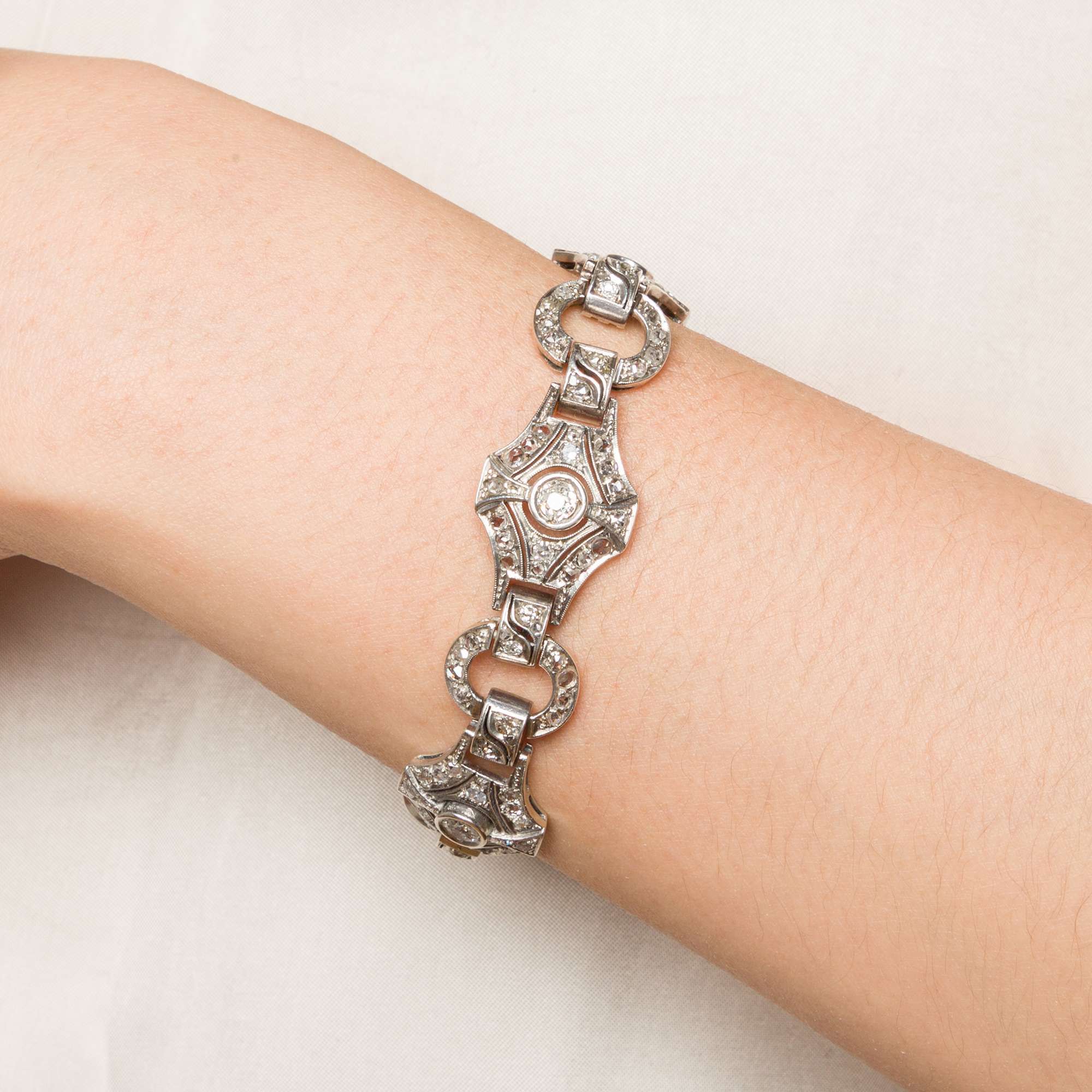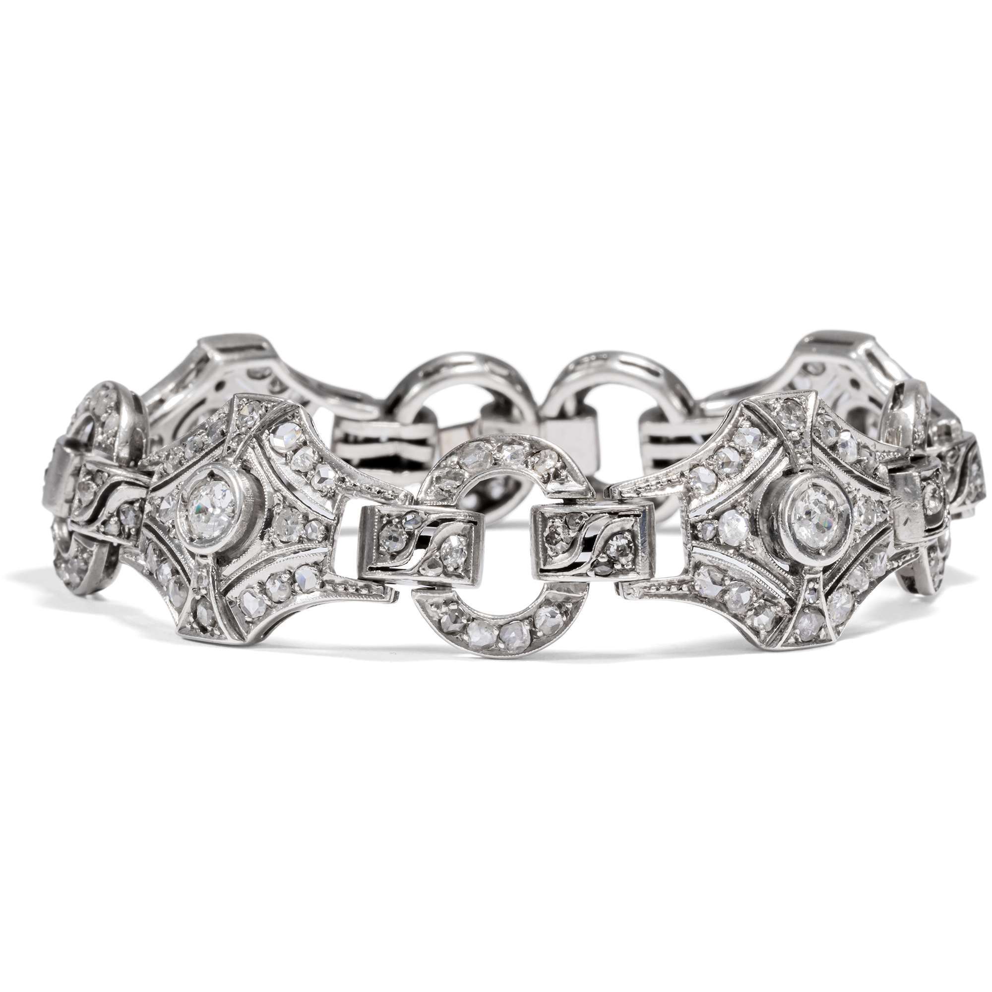Wir datieren das Armband in die Jahre um 1940 – eine Zeit, in der die Formen des Art Déco kräftiger wurden und sich vom allzu filigranen Stil der 1920er-Jahre weiterentwickelten. Zwei Umstände stützen diese Datierung: Zum einen besteht die Arbeit aus rhodiniertem Silber und nicht aus Platin oder Weißgold. Zum anderen stammen einige der Diamanten vermutlich aus älteren Schmuckstücken und wurden für dieses Band zweitverwendet. So finden sich historische Altschliffe neben modernen Übergangsschliffen.