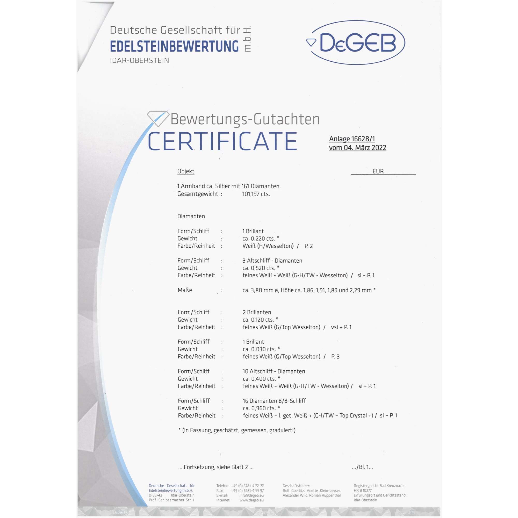 | Material: | 161 Diamanten im Brillant-, Alt- Rosen- & 8/8 Schliff, zus. etwa 4,31 ct, Feines Weiß (Top Wesselton, G) – Weiß (Wesselton, H), vsi – pi Silber |