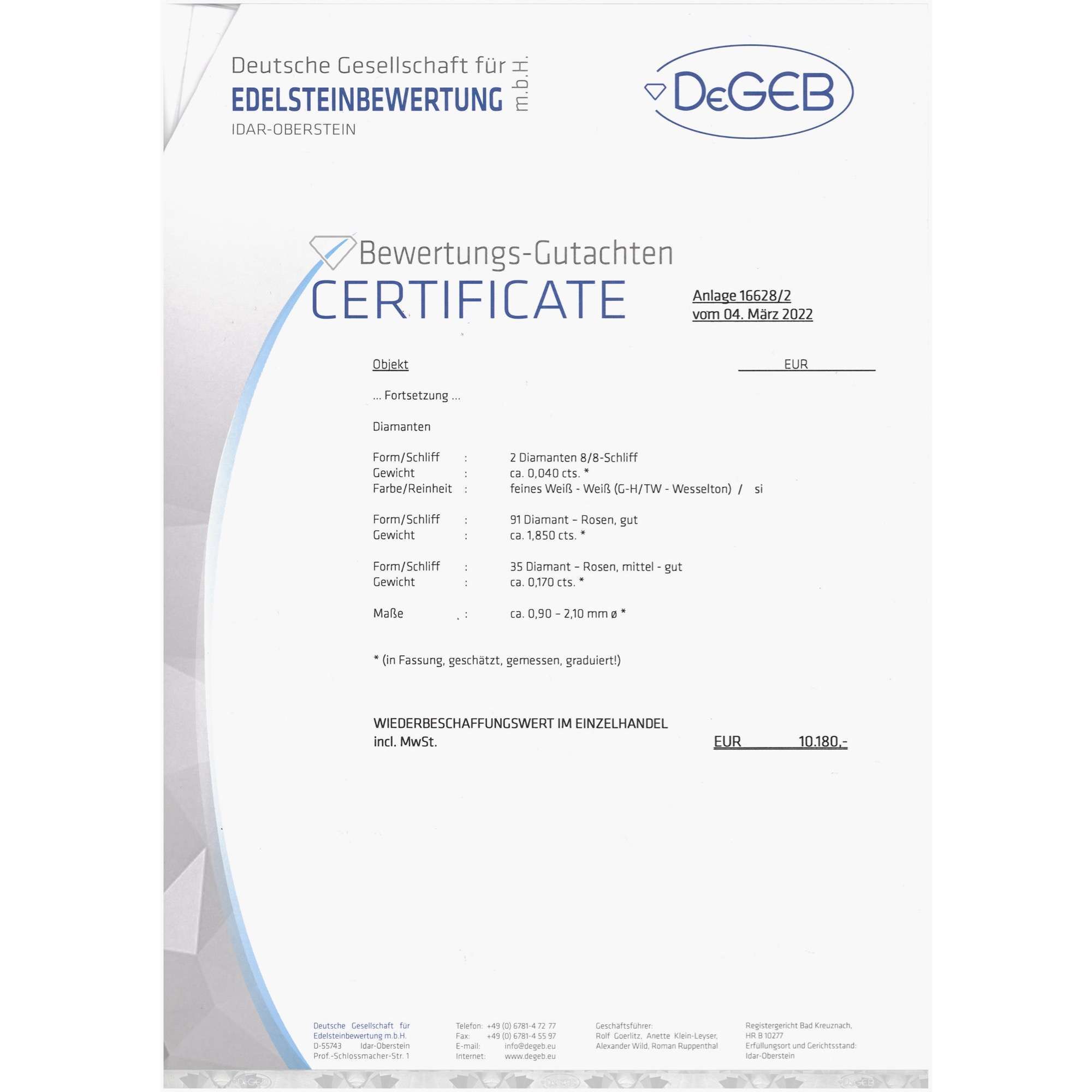 | Zertifikat: | Lieferung mit einem detaillierten Gutachten der Deutschen Gesellschaft für Edelsteinbewertung vom 04. März 2022. Festgestellter Wiederbeschaffungswert: 10.180,- Euro |