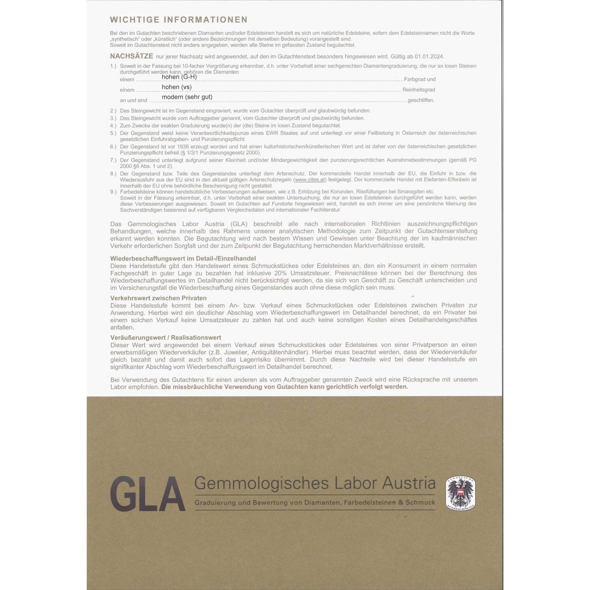 | Zertifikat: | Lieferung mit einem detaillierten Gutachten des Gemmologischen Labors Austria, Wien, vom 22. Mai 2025. Festgestellter Wiederbeschaffungswert: 9.500,- Euro. |
