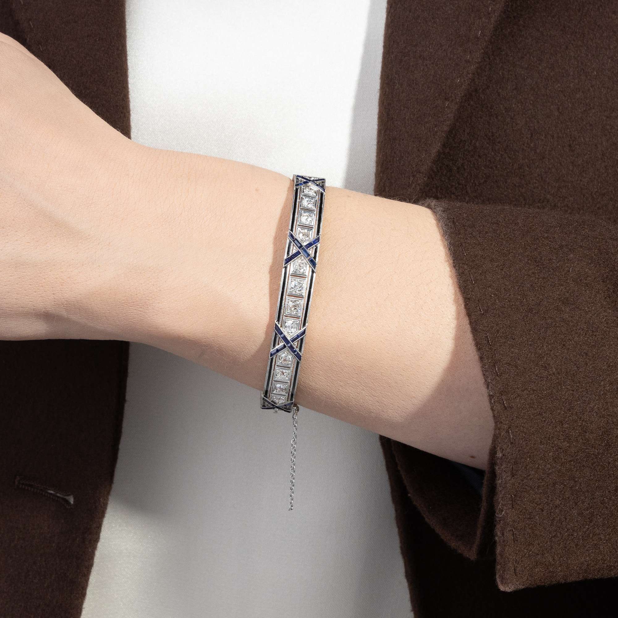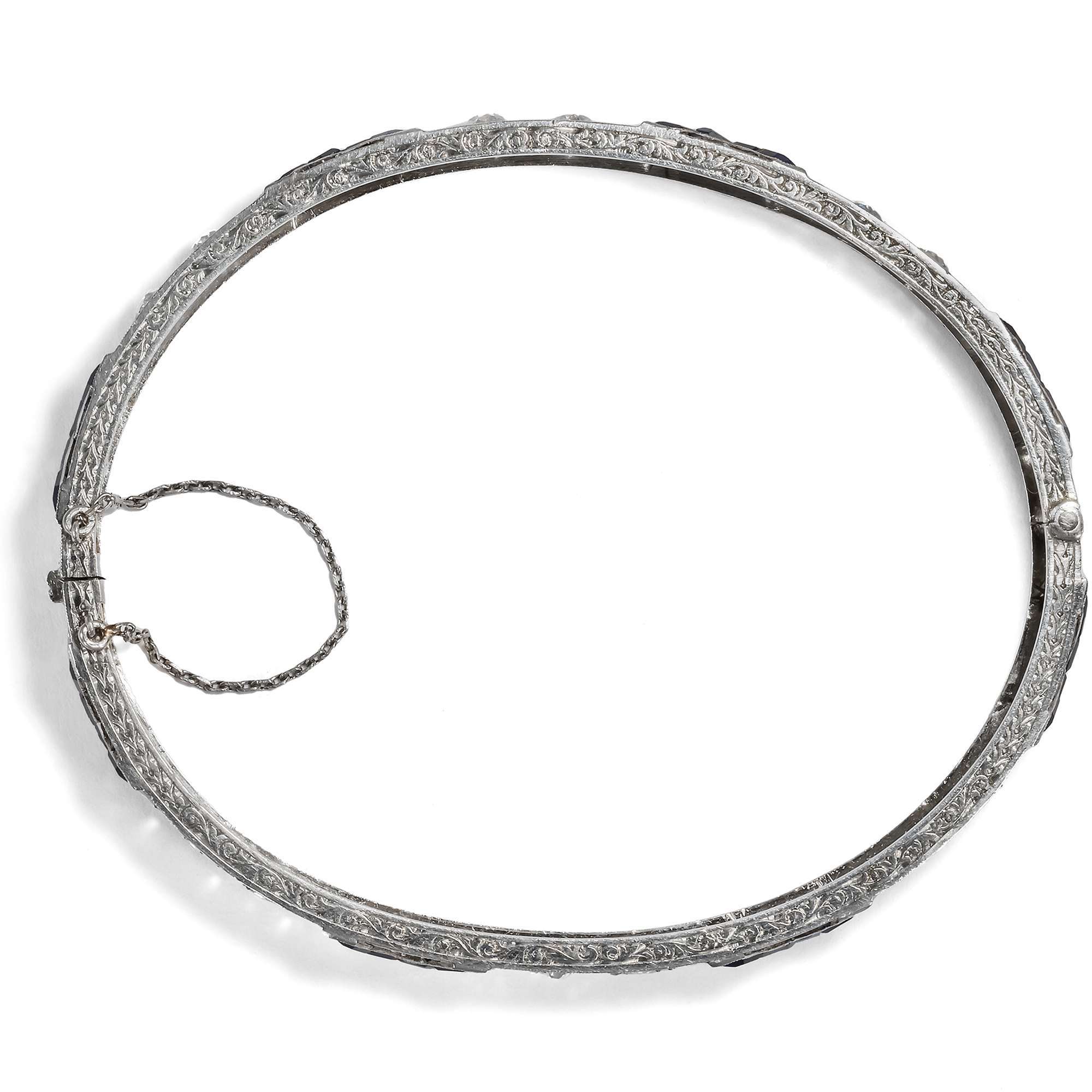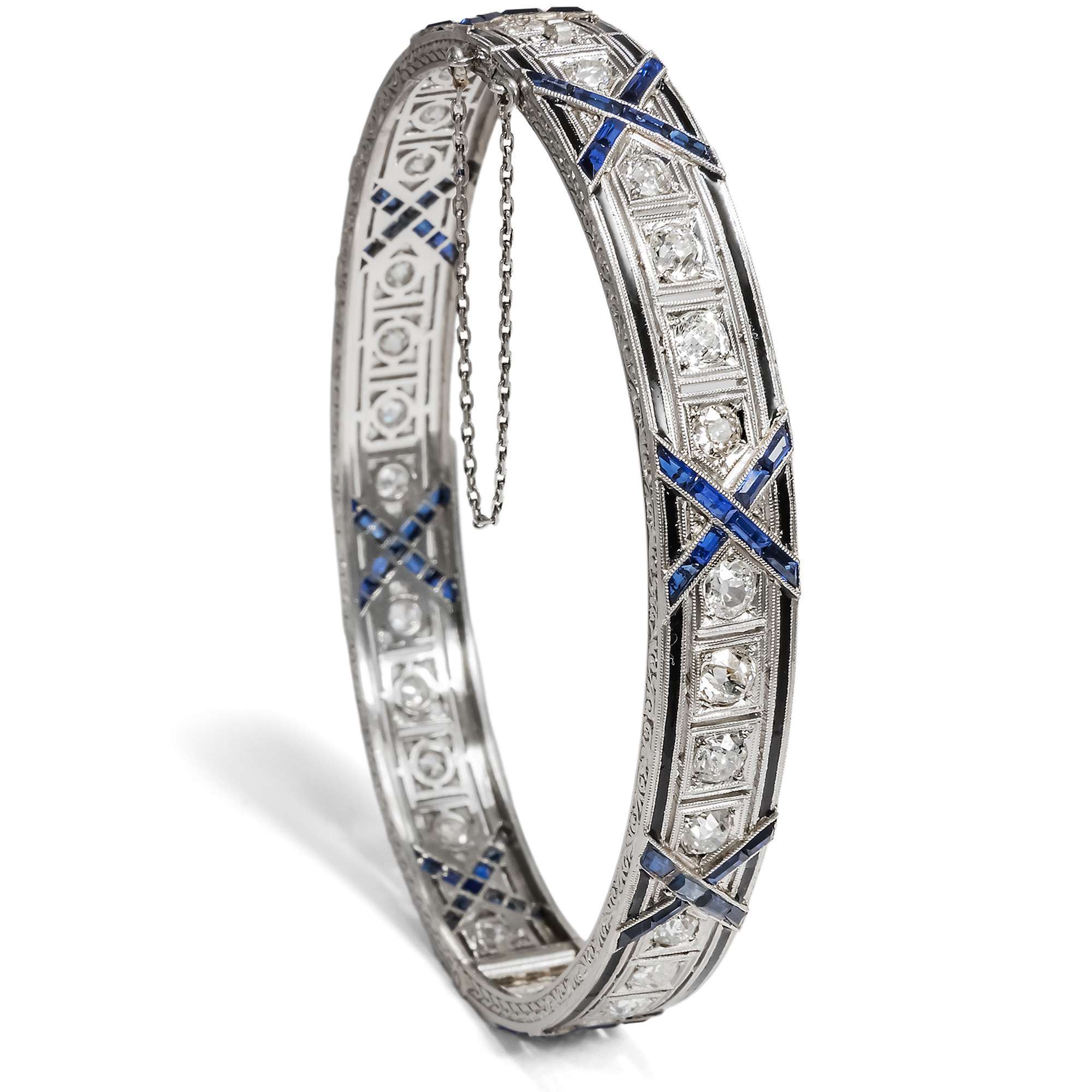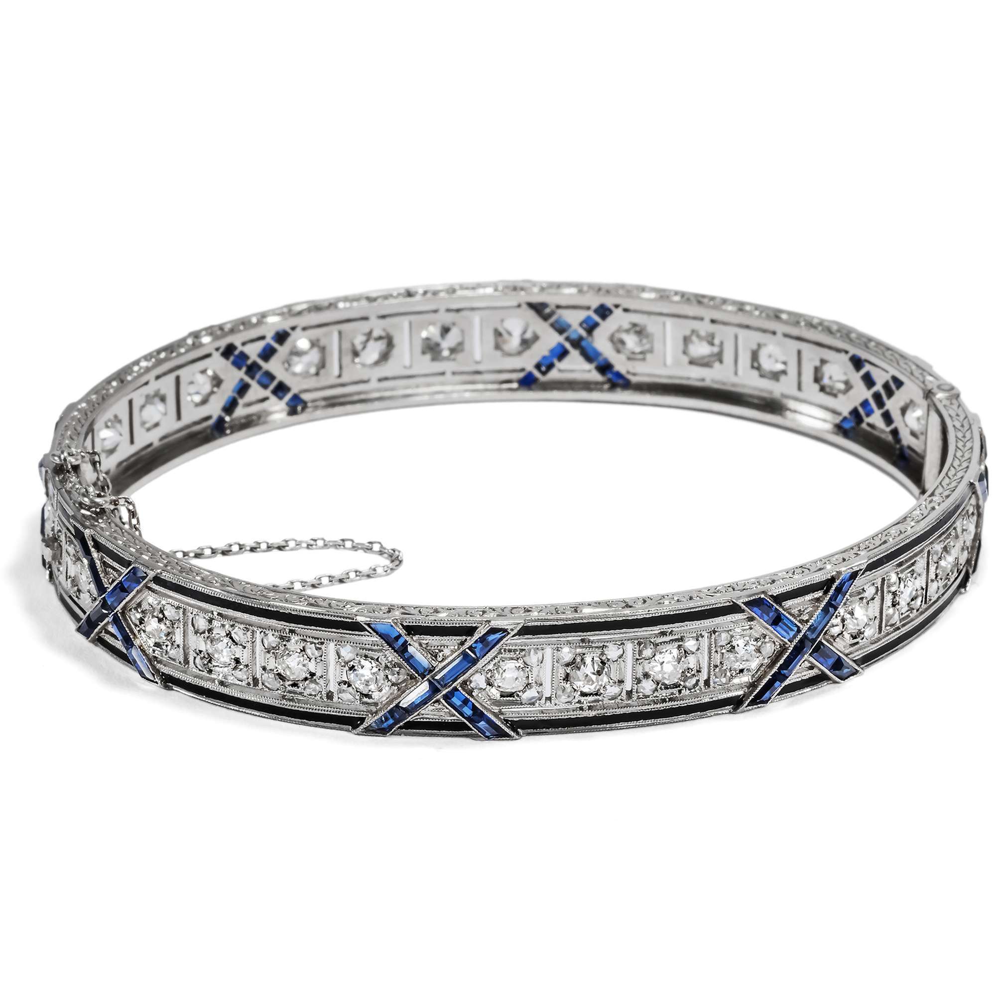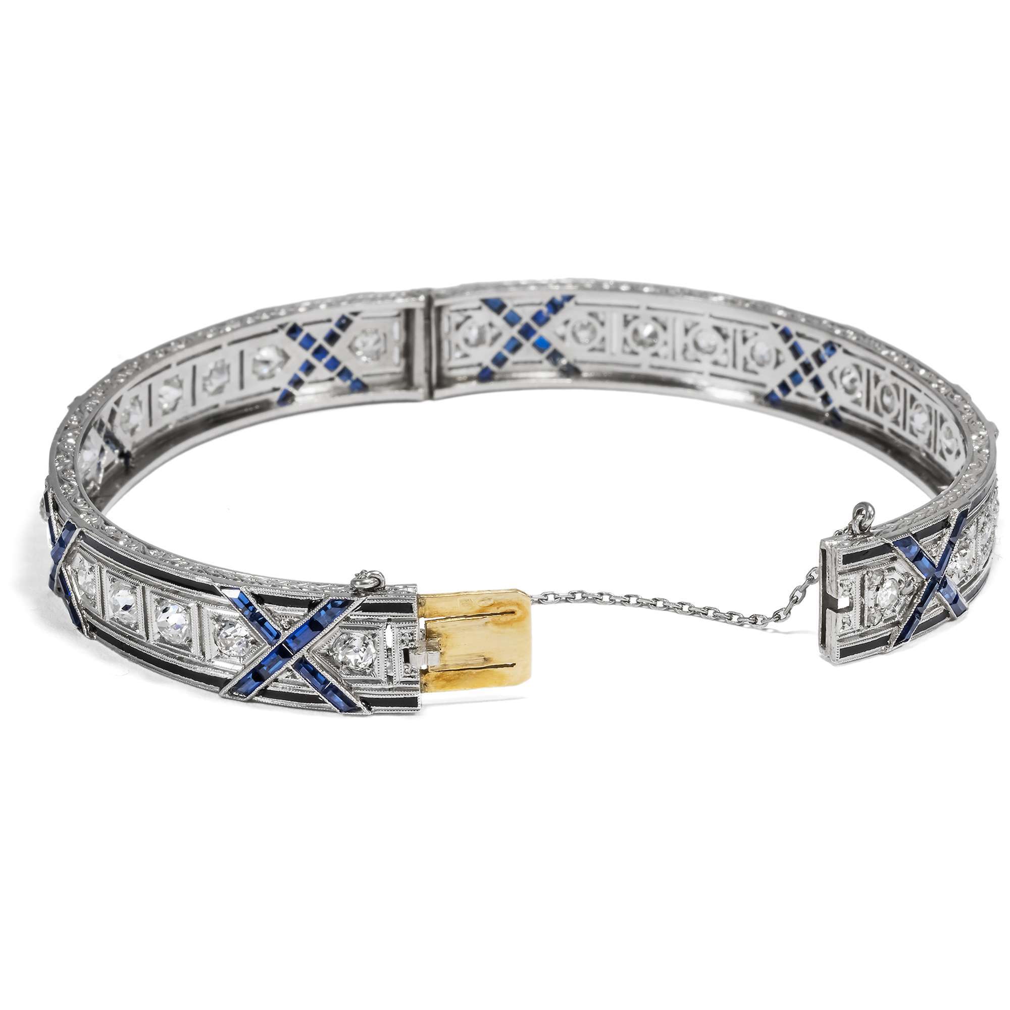 Von modernen Errungenschaften erzählen auch die Saphire, denn es handelt sich um Synthesen im Verneuil-Verfahren aus dem Labor – eine der größten Innovationen jener Zeit. 1902 kamen die ersten auf diese Weise durch Auguste Verneuil geschaffenen Saphire und Rubine in den Handel. Die so hergestellten Steine waren so klar und leuchtend wie die schönsten natürlichen Edelsteine, und auch die hier eingefassten Saphire leuchten in intensivem Blau. Ganz typisch für die 1910er Jahre ist es, diese Steine mit echten Diamanten zu kombinieren und kalibriert geschliffen, dicht an dicht nebeneinander zu setzen, um damit feine Linien zu bilden.