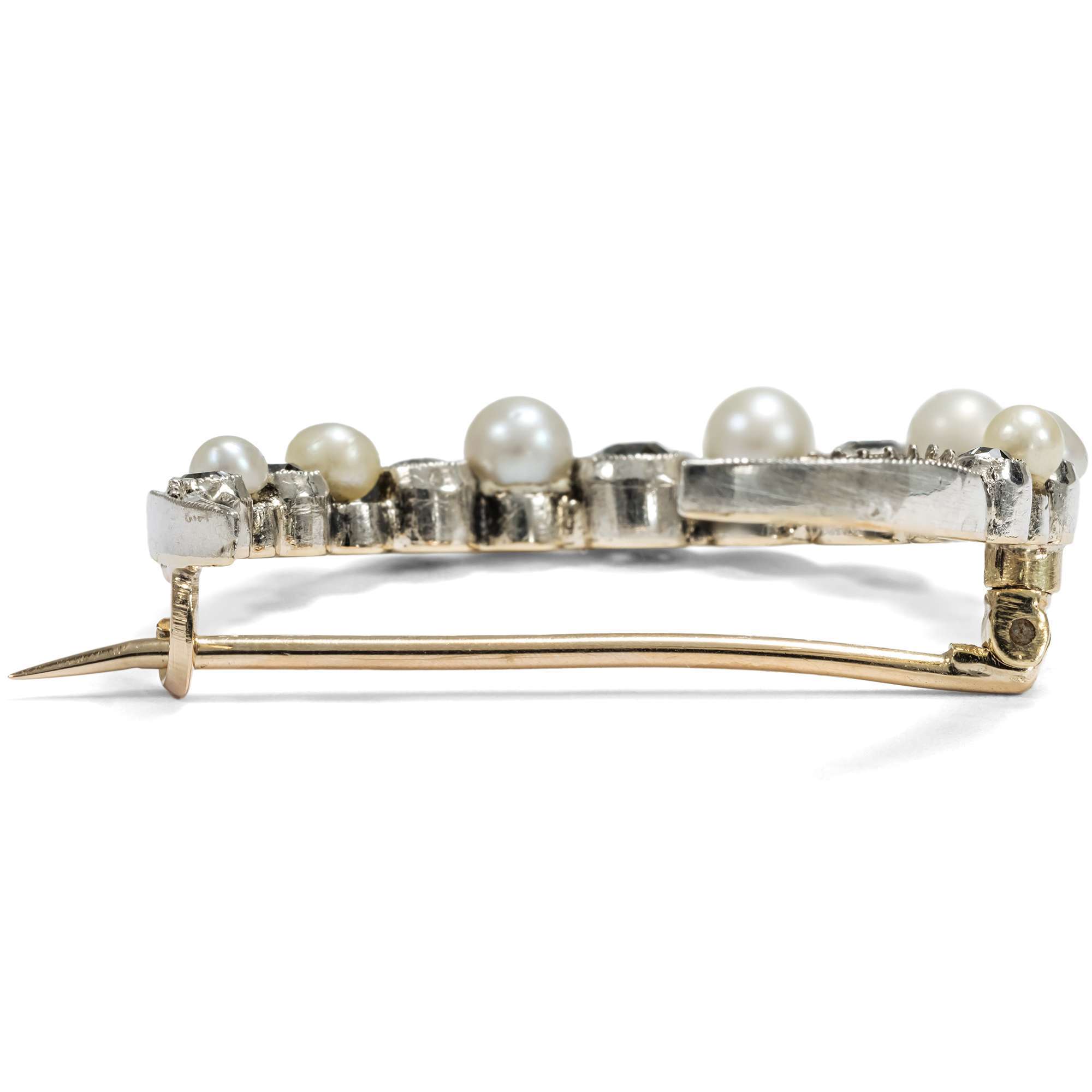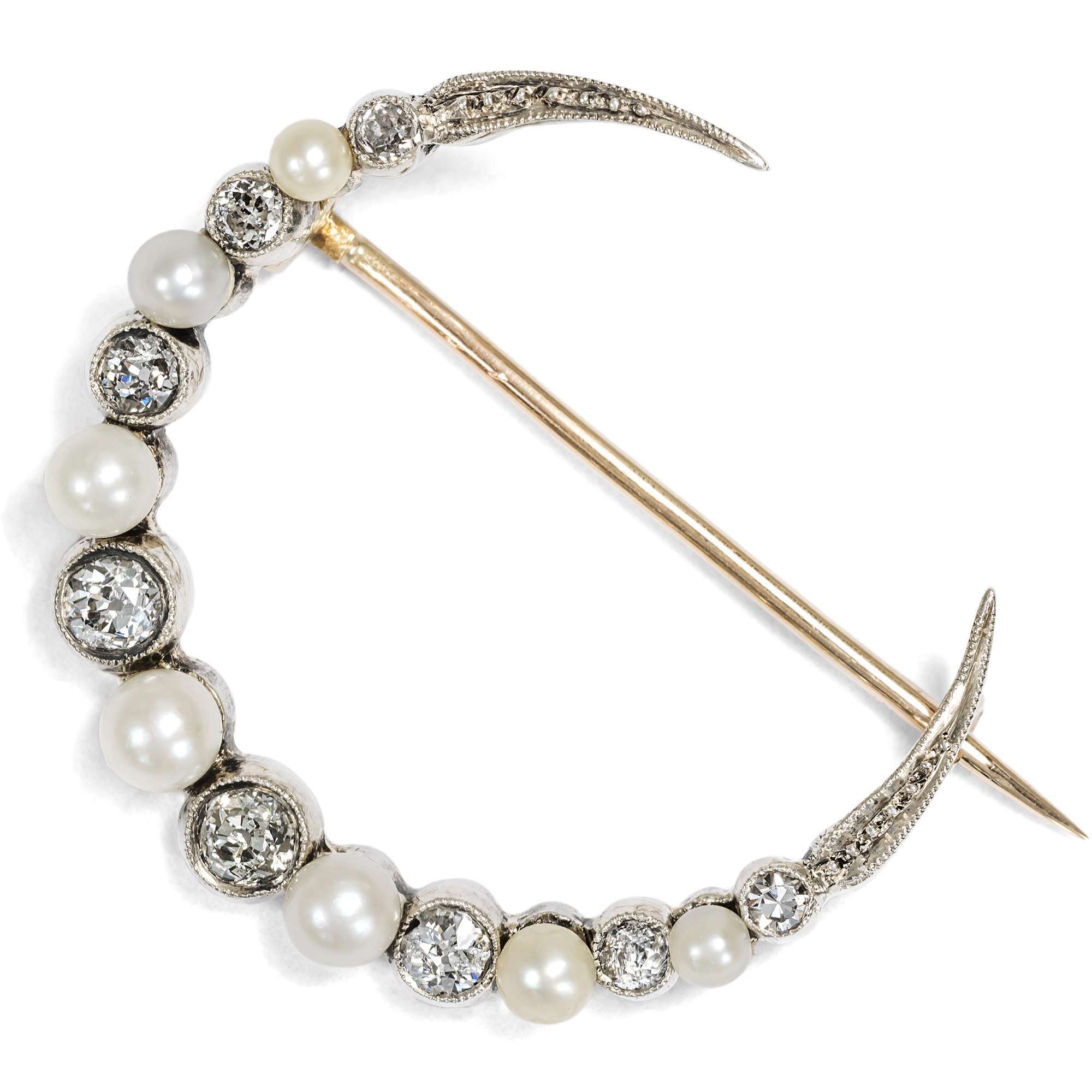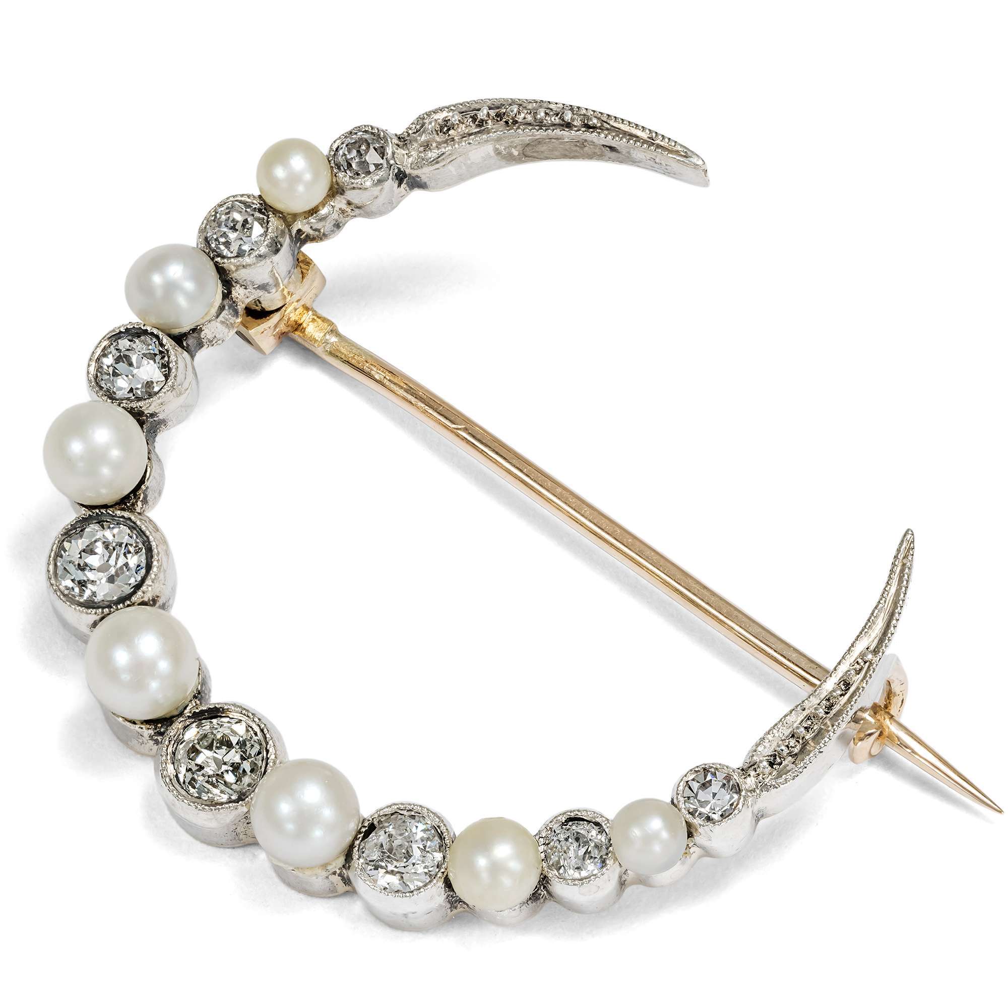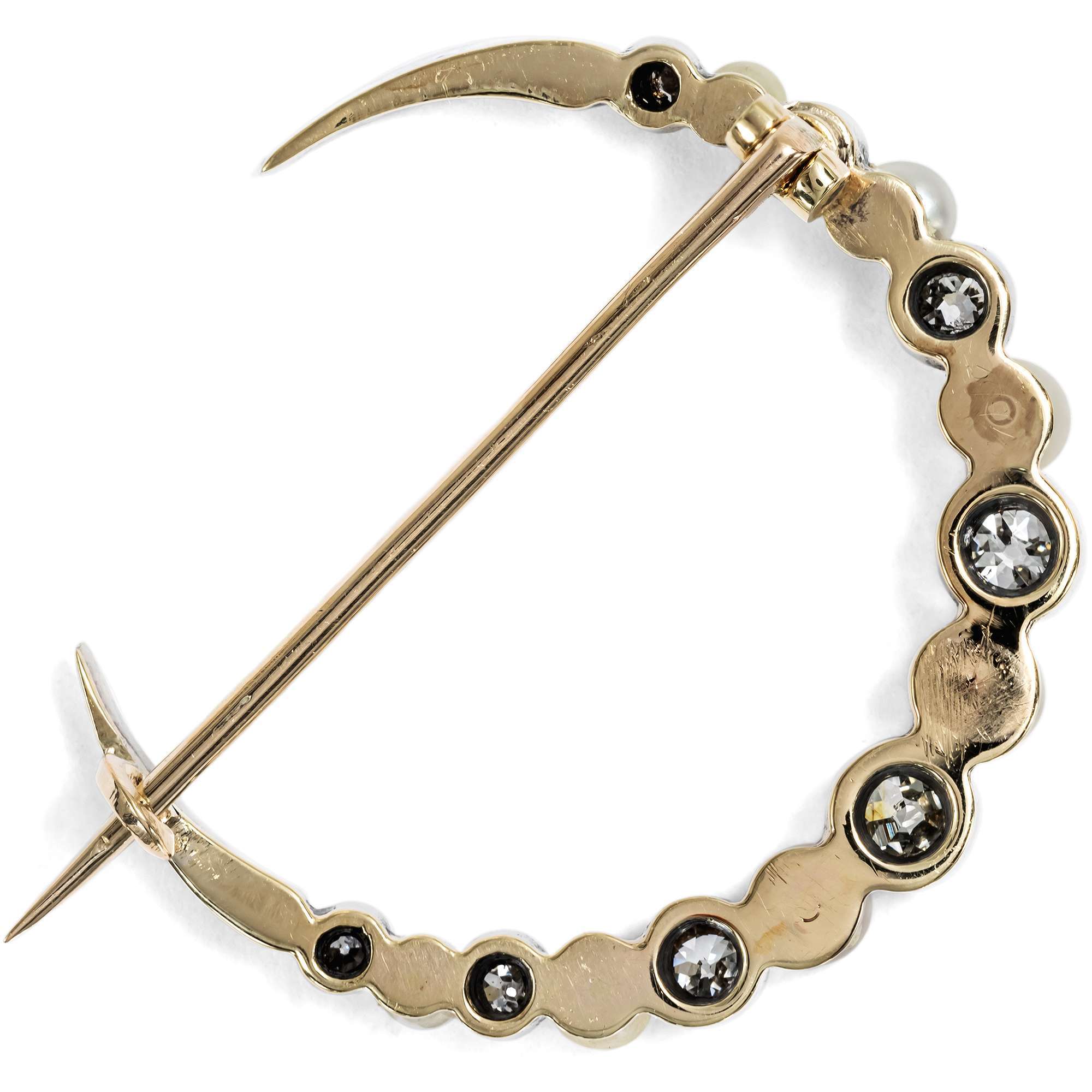 Schon lange wurde der Mond mit dem Silber in Verbindung gebracht. Auf Arbeiten deutscher Silberschmiede finden wir deshalb seit dem ausgehenden 19. Jahrhundert sogar eine mondförmige Punzierung, welche die Echtheit des Materials bestätigen soll. Und auch hier ist es eine Lage aus Silber, die dem Grundmaterial aus Gold aufliegt und dem vorliegenden, sichelförmigen Mond seine Farbe verleiht. Etwa 0,80 ct Diamanten und sieben Perlen vervollkommnen den ätherischen Glanz der Mondsichel.