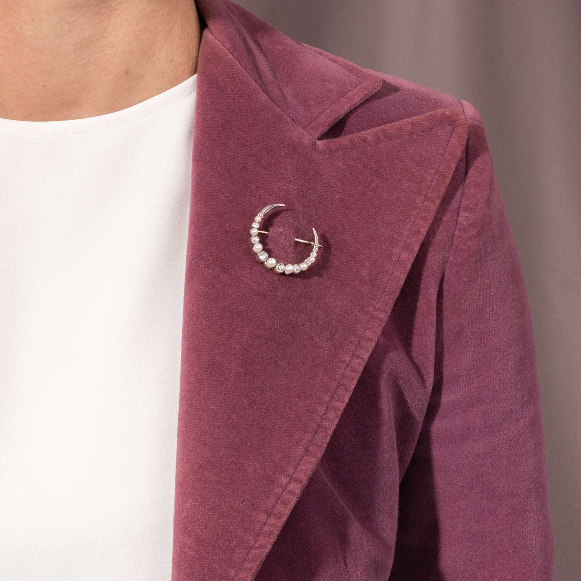 Die Brosche in Form eines Sichelmondes ist ein feines Schmuckstück der Belle Époque und entstand ausweislich ihrer bereits sehr feinen, filigranen Form zu Beginn des 20. Jahrhunderts. Sie ist ein typisches Stück dieser „schönen Epoche“ und fand aus dem Süden Englands zu uns.