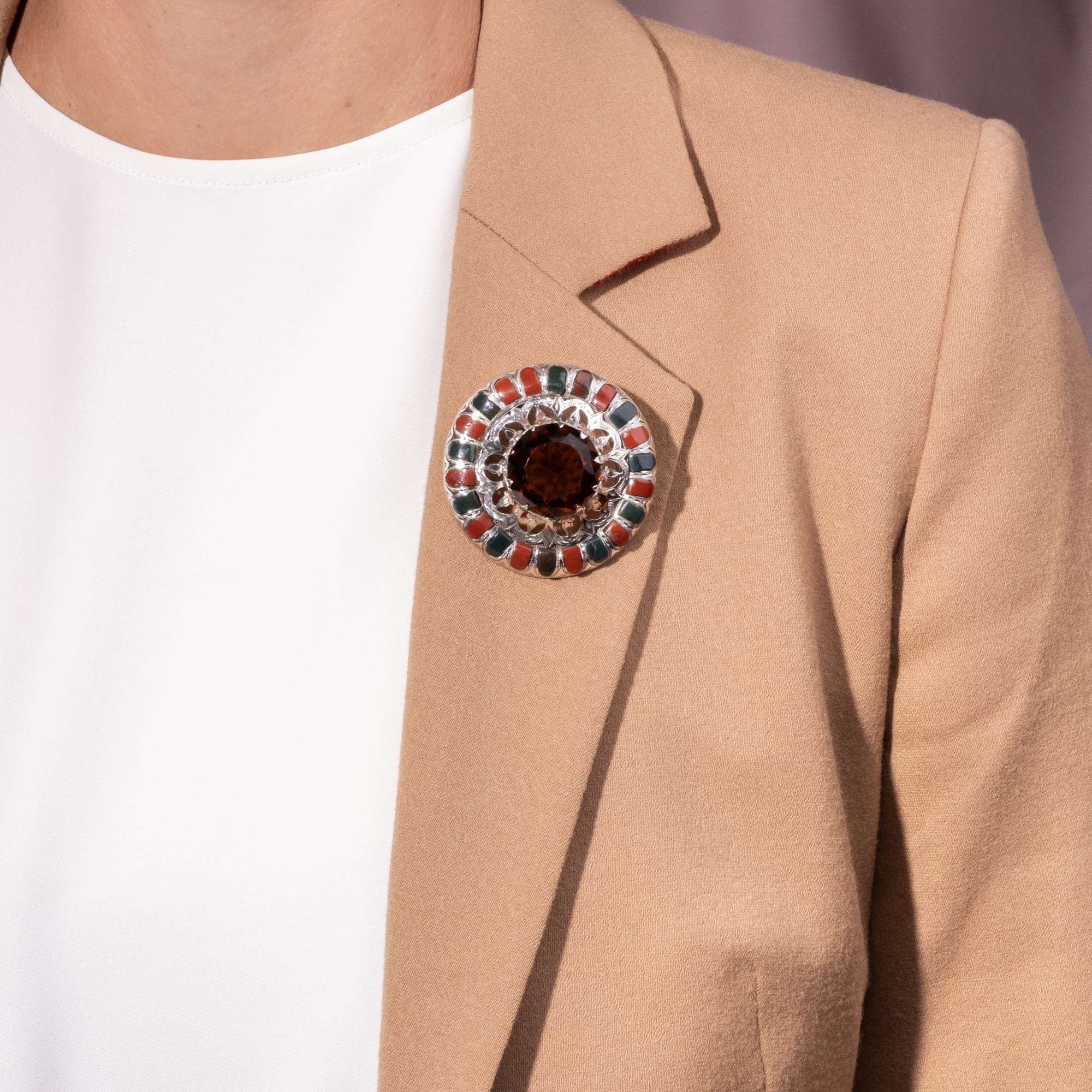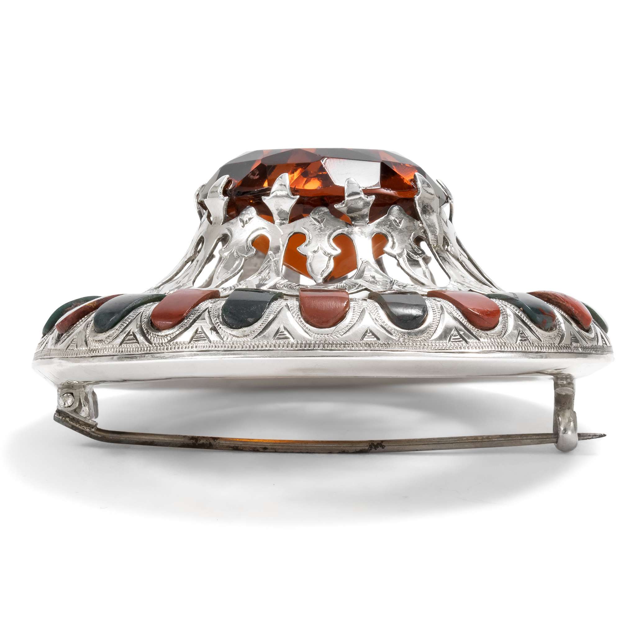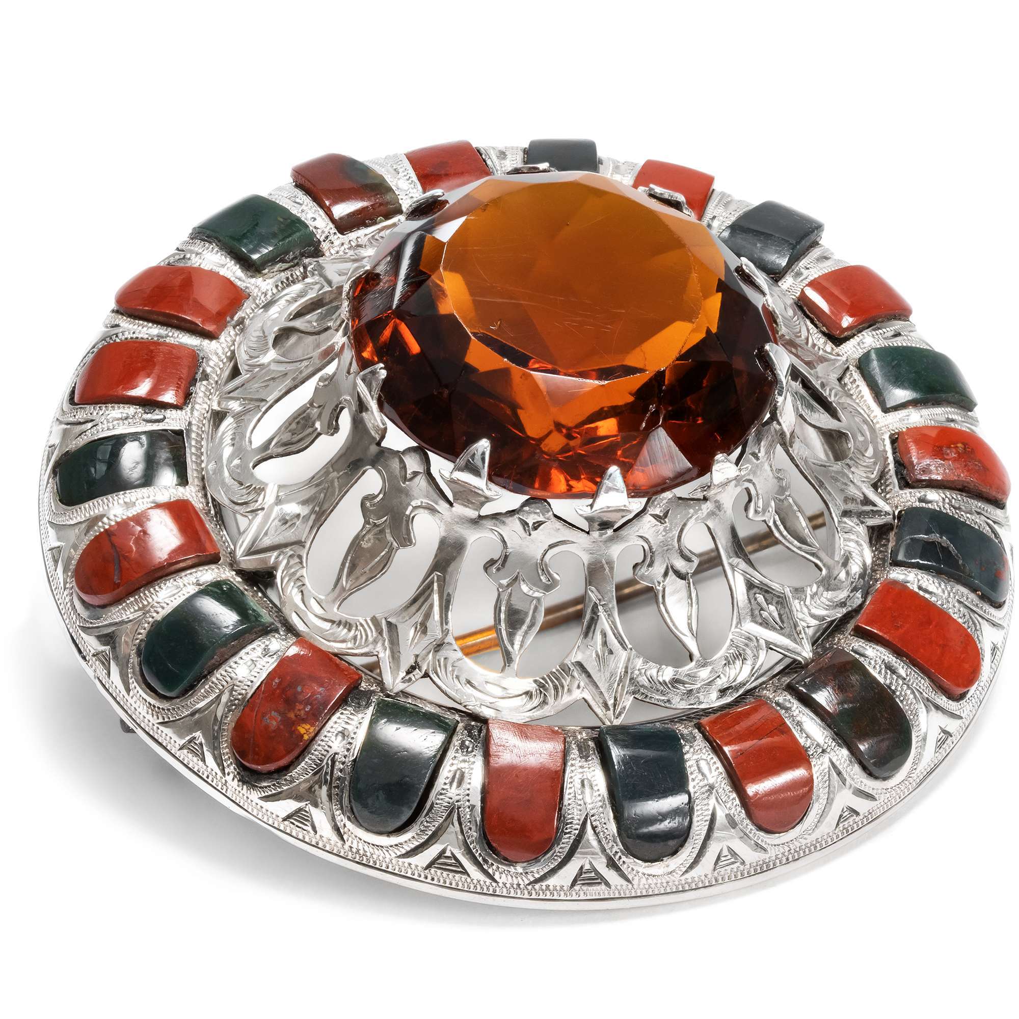 Ein schönes Zeugnis dieser Mode liegt mit dieser Brosche des späten 19. Jahrhunderts vor. Sie ist in runder Form entworfen und zeigt mittig eine durchbrochene Blüte. Der breite Rahmen ist mit Plättchen aus dunkelgrünem Heliotrop und rotem Jaspis belegt. Im Zentrum der Komposition leuchtet ein großes, facettiertes Glas in wunderschöner orange-brauner Farbe. Citrine dieser Farbe galten zur Entstehungszeit des Stücks als typisch schottische Steine. Als sog. „Cairngorms“ wurden sie in den Highlands gefunden. Es war bekannt, dass sich selbst Königin Victoria in der Umgebung von Schloss Balmoral gern auf die Suche nach diesen Steinen begab. Jedoch reichten die seltenen Funde nicht**,** um den wachsenden Bedarf an schottischem Schmuck zu decken, sodass man wie hier auch zu Ersatzmaterialien griff.