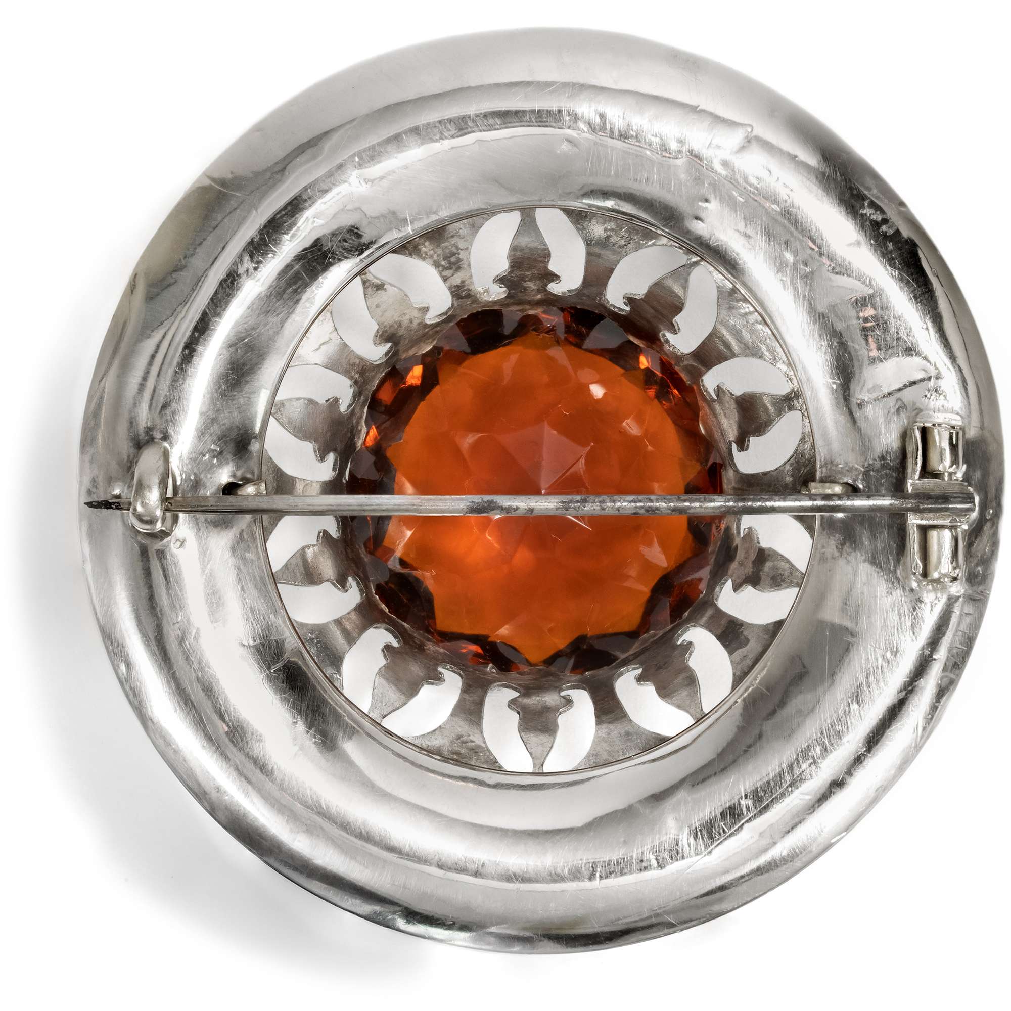 | Material: | Ein orangebraunes Glas, rund facettiert, ca. 22,2 mm Durchmesser Einlagen aus natürlichem Jaspis und Heliotrop Silber, der Rahmen mit Harz gefüllt Nadel aus Stahl |