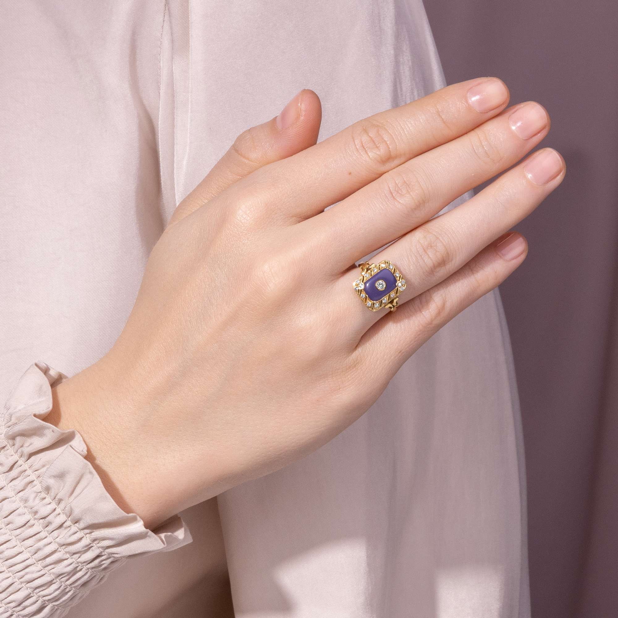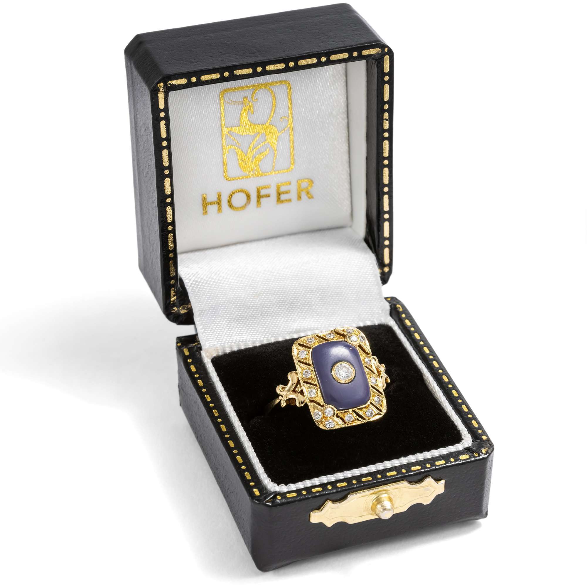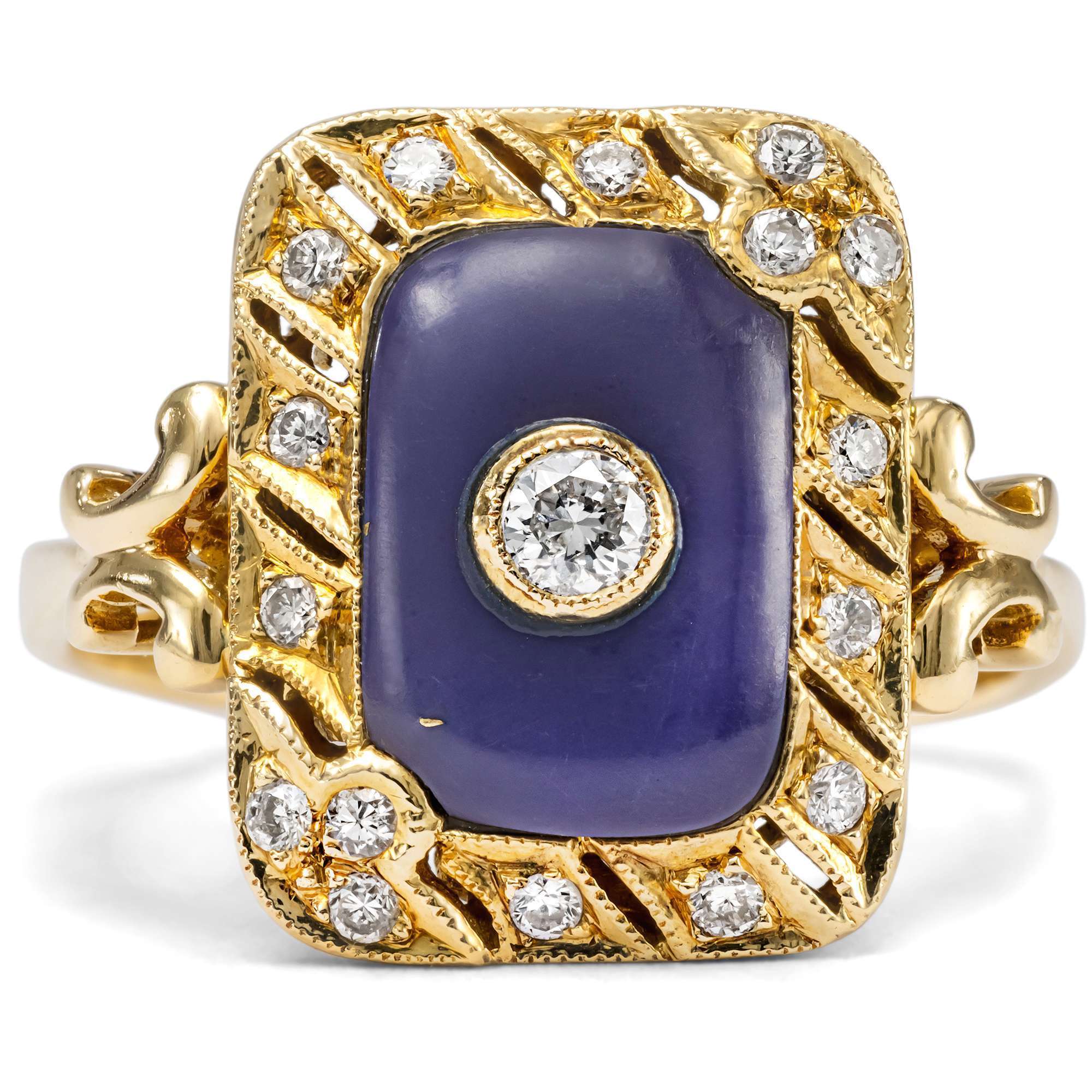 Dieser Ring ist wie ein ewiger Sommer. Das hochkarätige Gelbgold leuchtet warm, die funkelnden Diamanten setzen frische Lichtakzente. In der Mitte des quergestreiften Ringkopfes ist ein violetter Achat eingelassen, der an Heidelbeer-Eis erinnert.