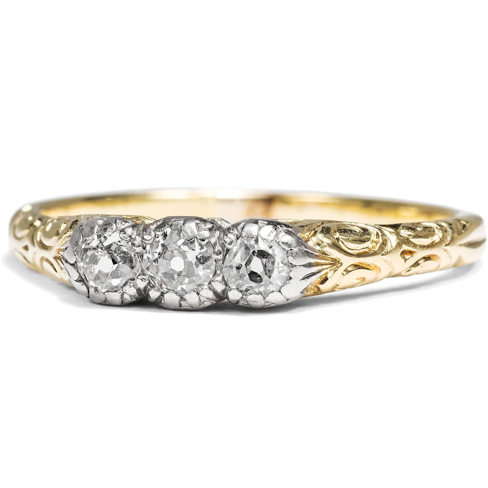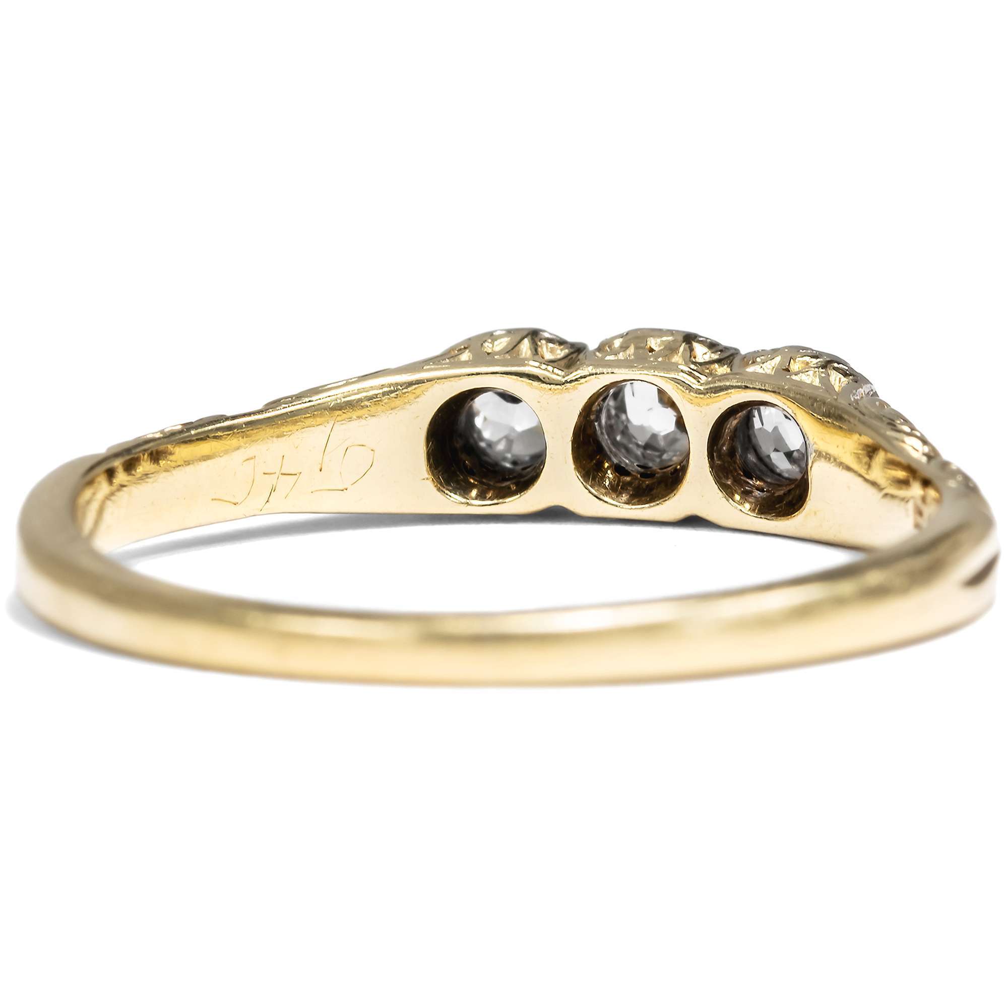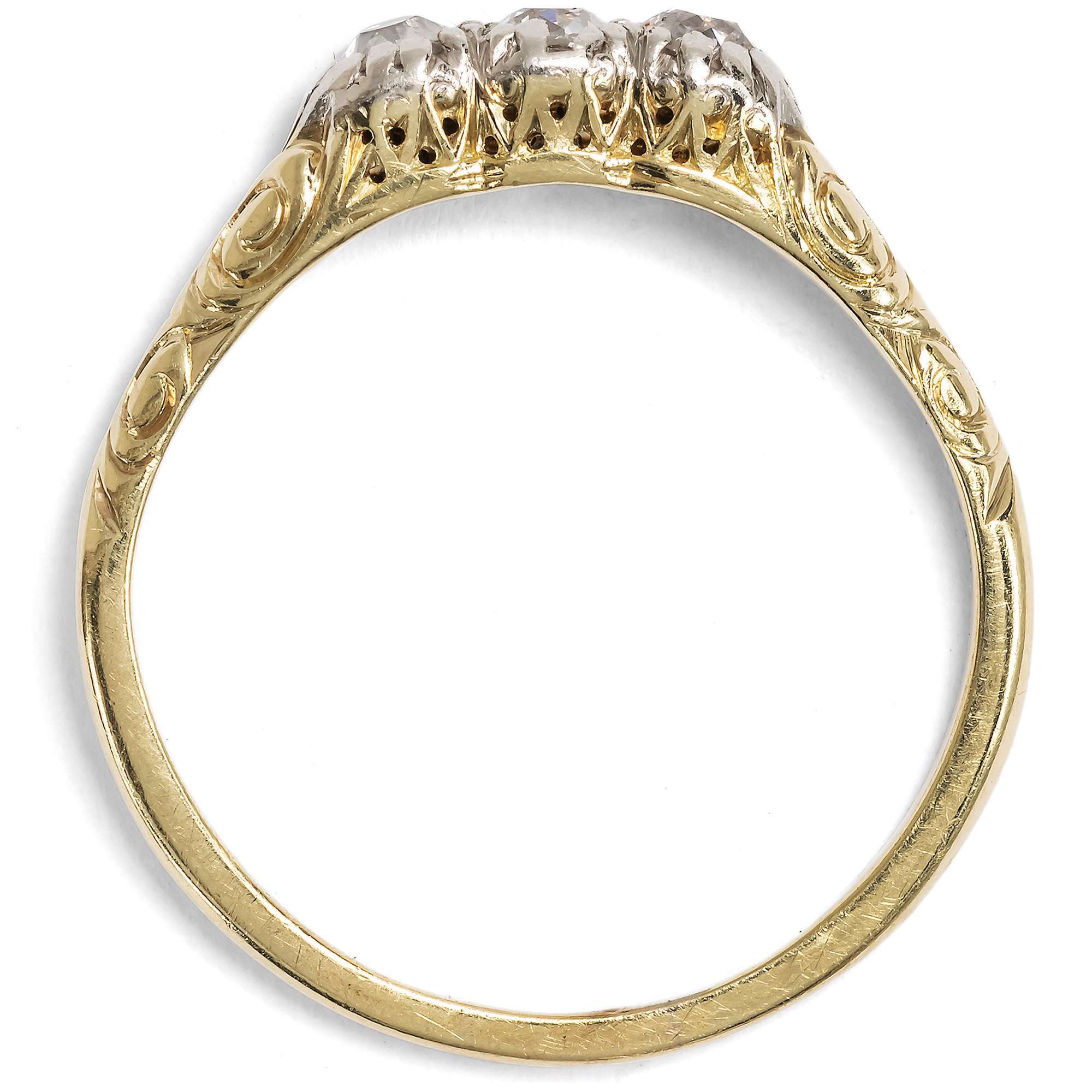 Drei Diamanten im Altschliff sind in einer Reihe entlang der Ringschiene angeordnet. Kleine, blättchenförmige Krappen aus Platin halten sie die Steine und geben ihnen einen hellen, weißen Rahmen. Der Ring selbst – aus warmem Gelbgold – ist mit gravierten Spiralen verziert.