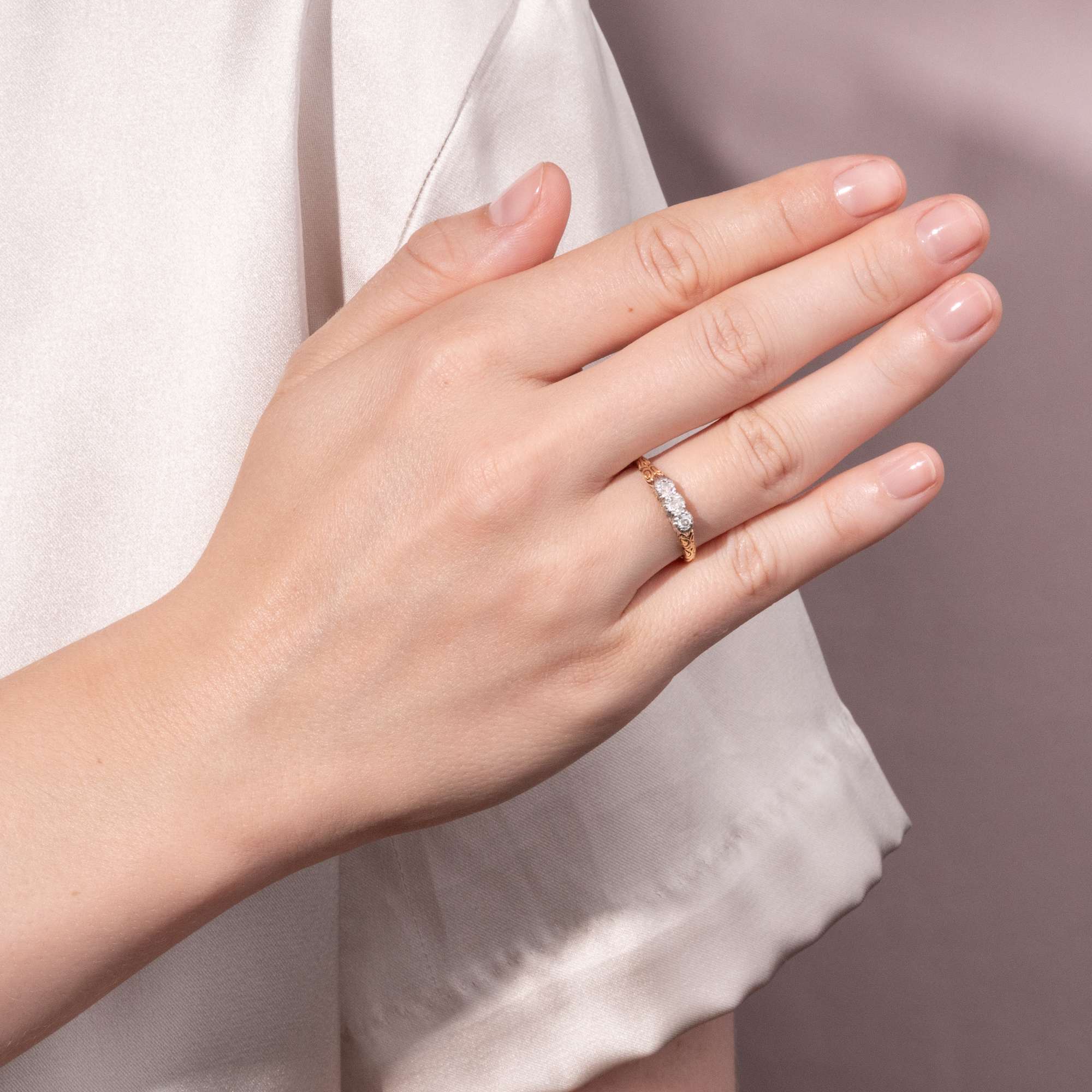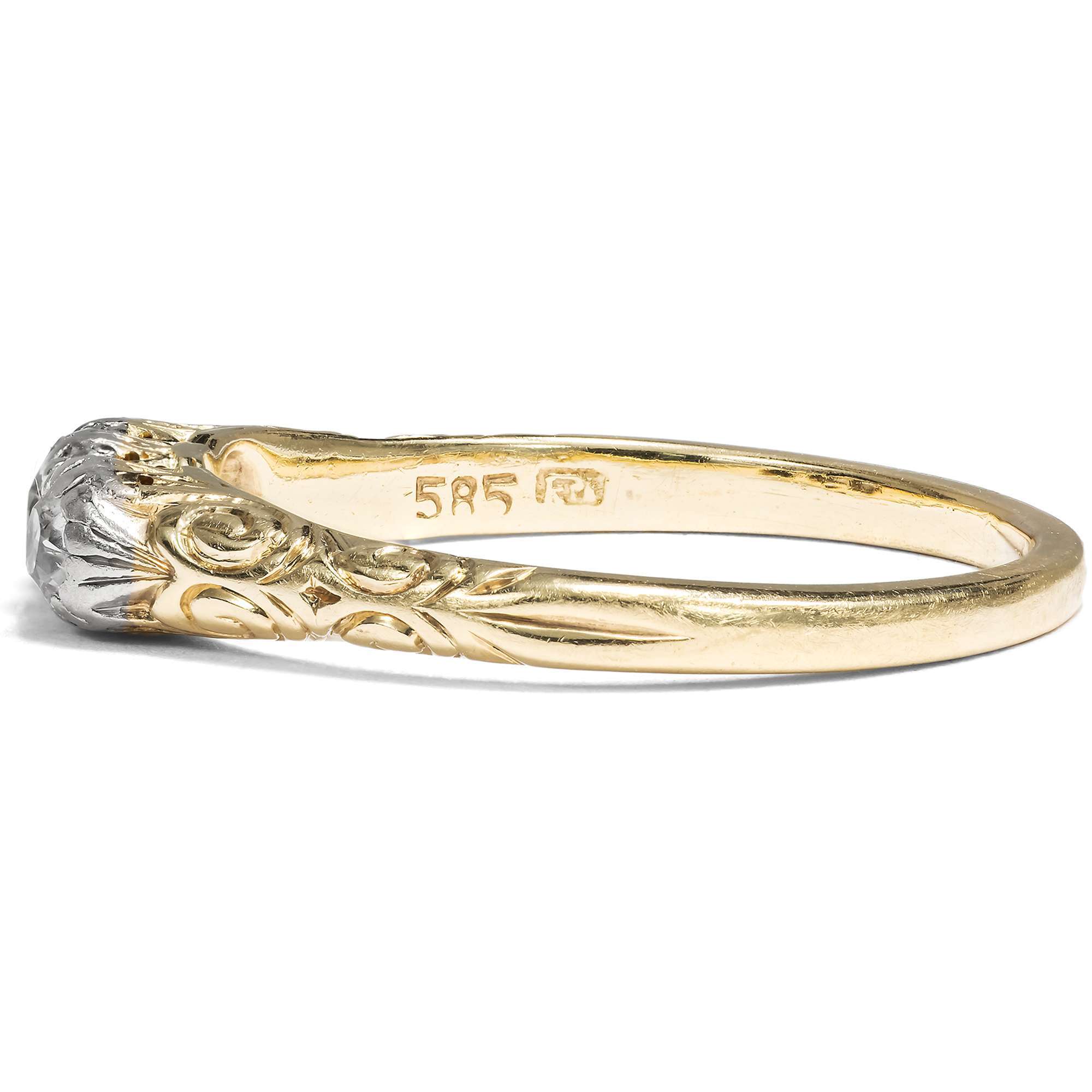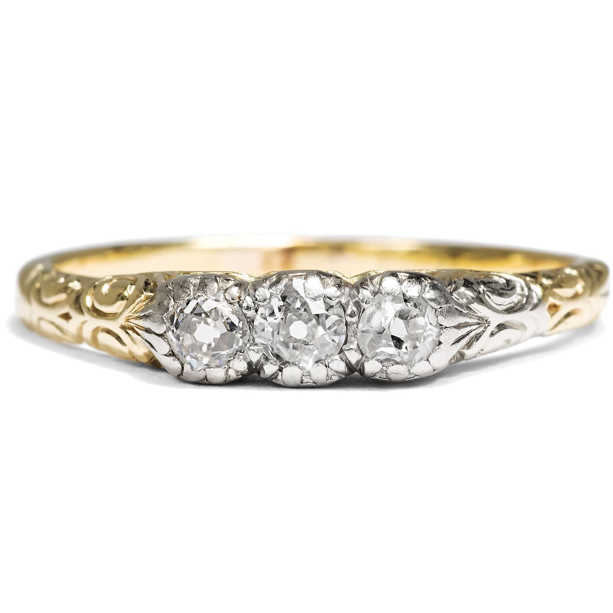 Drei Diamanten im Altschliff sind in einer Reihe entlang der Ringschiene angeordnet. Kleine, blättchenförmige Krappen aus Platin halten sie die Steine und geben ihnen einen hellen, weißen Rahmen. Der Ring selbst – aus warmem Gelbgold – ist mit gravierten Spiralen verziert.