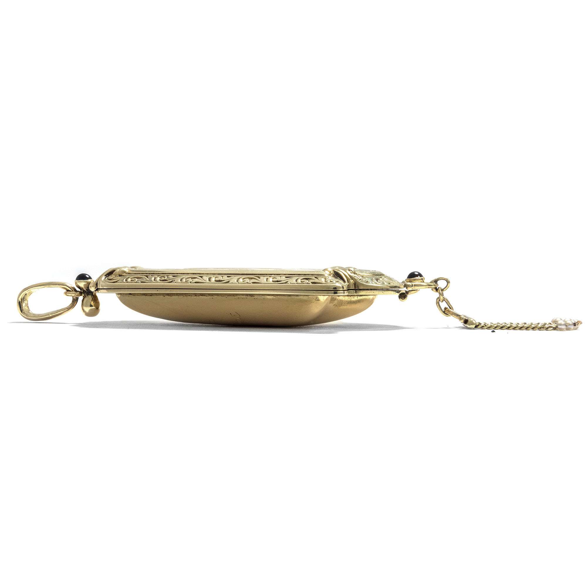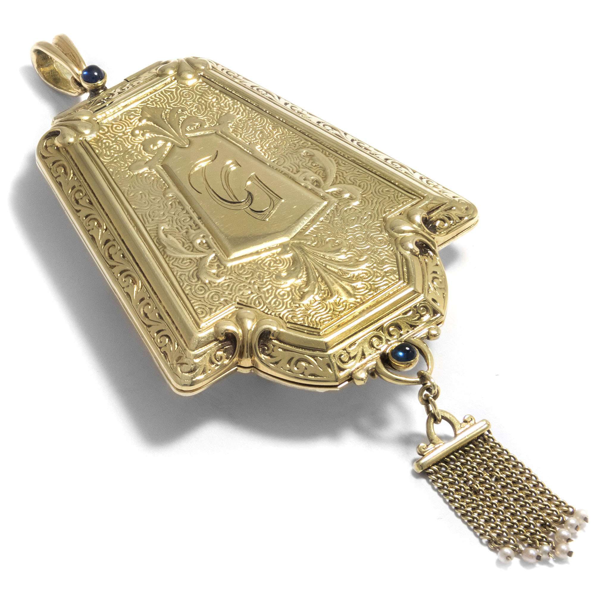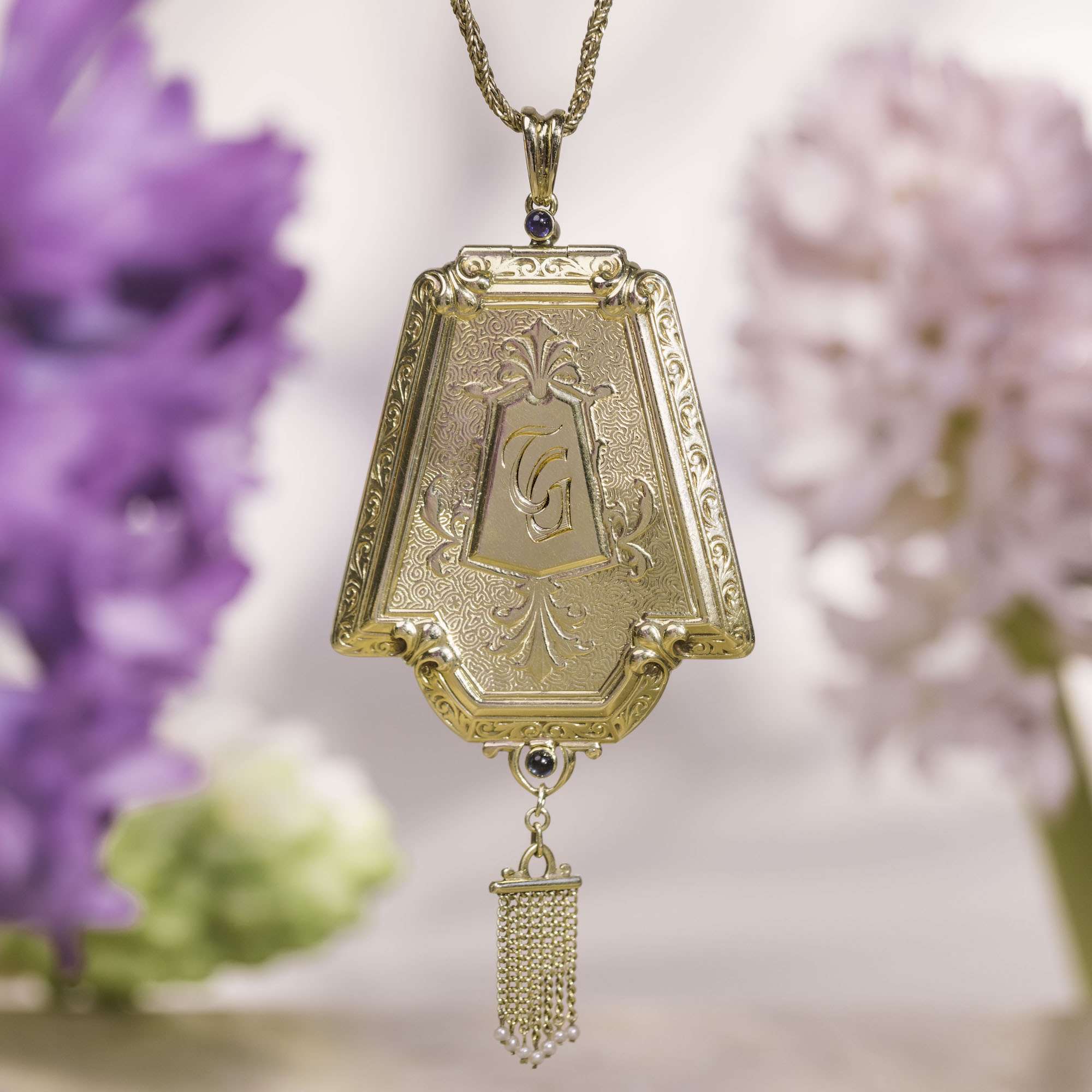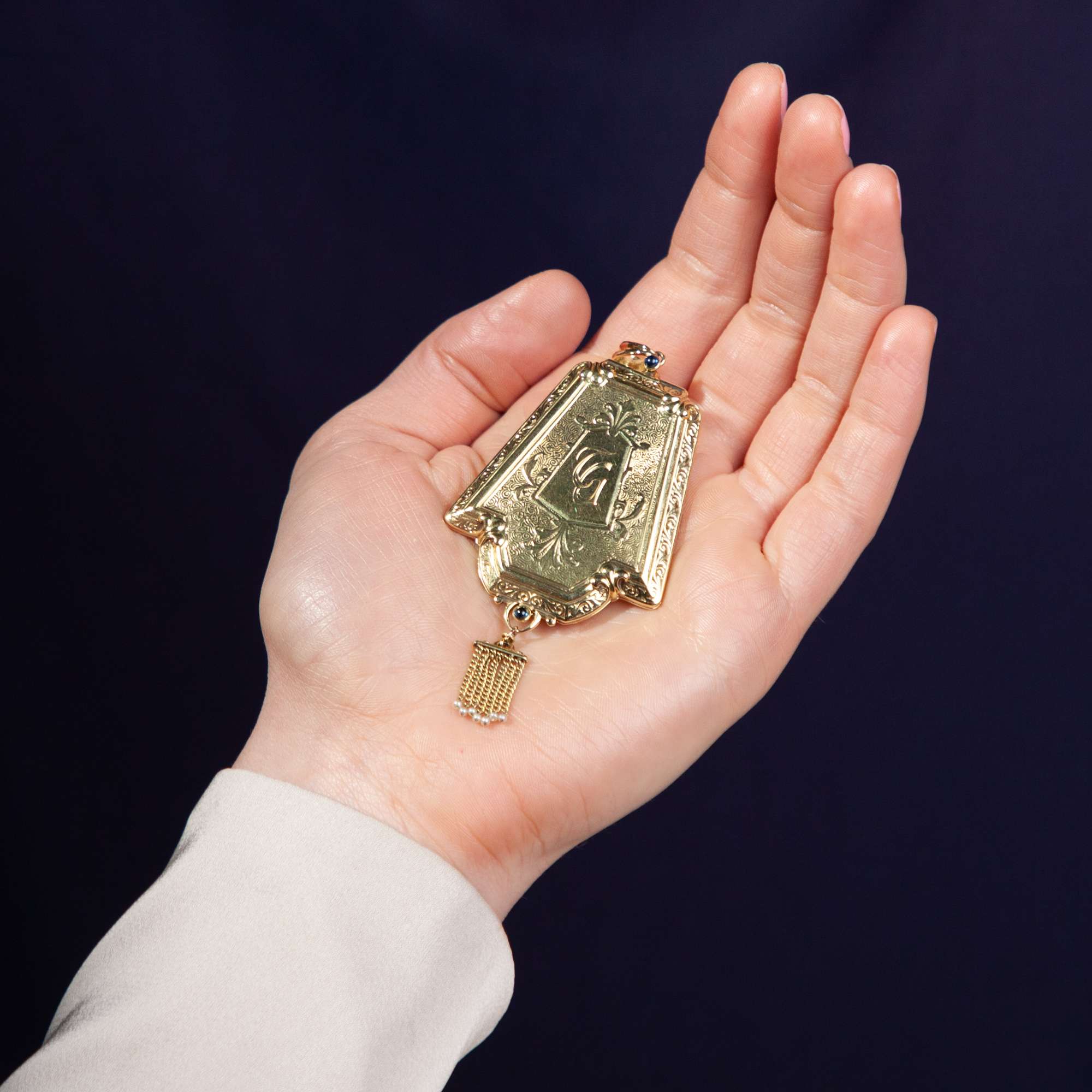 Schumann-Heink besaß zweifellos die finanziellen Mittel zu einem kostbaren Geschenk wie diesem. Auch selbst trug sie gern Schmuck, wie überlieferte Photographien beweisen. Das große Medaillon ist aus massivem Gold gearbeitet und mit reicher Ornamentik versehen. Zwei nachtblaue Saphircabochons und eine Quaste aus Goldkettchen und Perlen setzen Akzente. Innen verfügt das Medaillon über einen Spiegel und einen hohlen Innenraum, sodass sich hier ein Briefchen oder ein anderes Geheimnis verstecken ließe.
