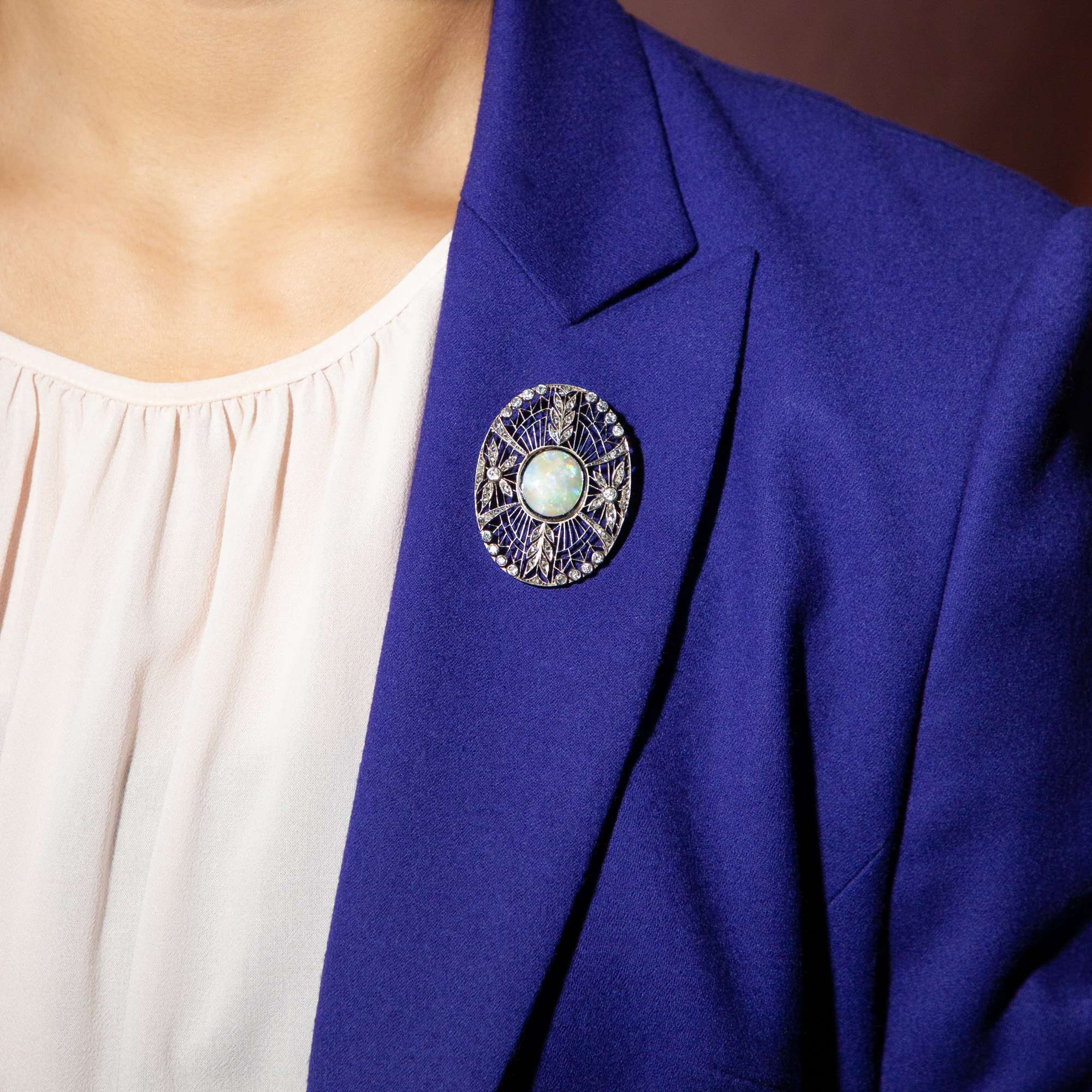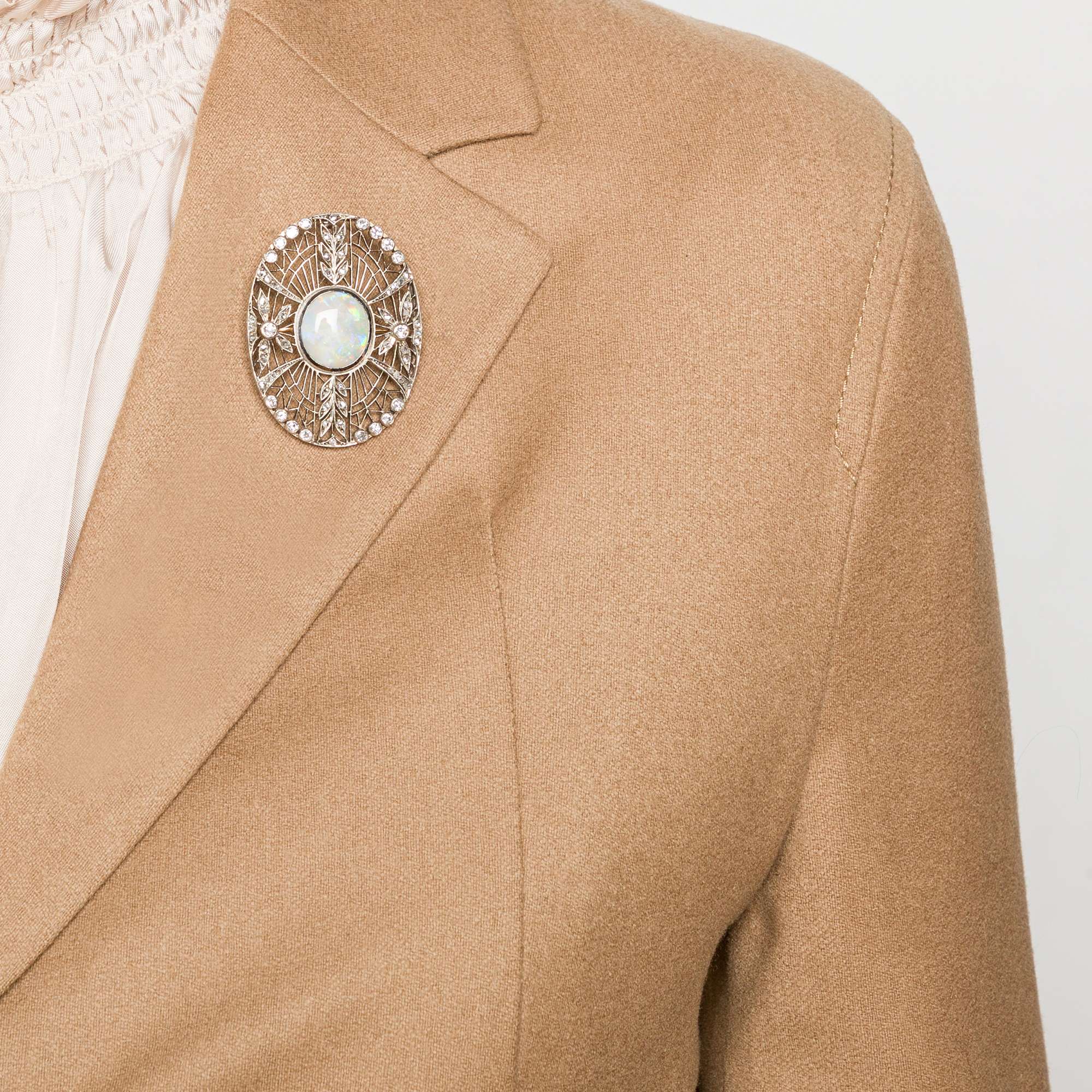 Das hier vorliegende Schmuckstück ist ein schönes Beispiel dieses Stils. Die große, ovale Arbeit ist in ein feines Netz aus zarten Stegen aufgelöst, auf dem Blüten und Ranken aus Diamanten liegen. Ein Kranz aus größeren Diamanten im Altschliff schließt den Entwurf nach außen ab. Während in der Mitte der Komposition ein großer, wunderbarer Opal schimmert.