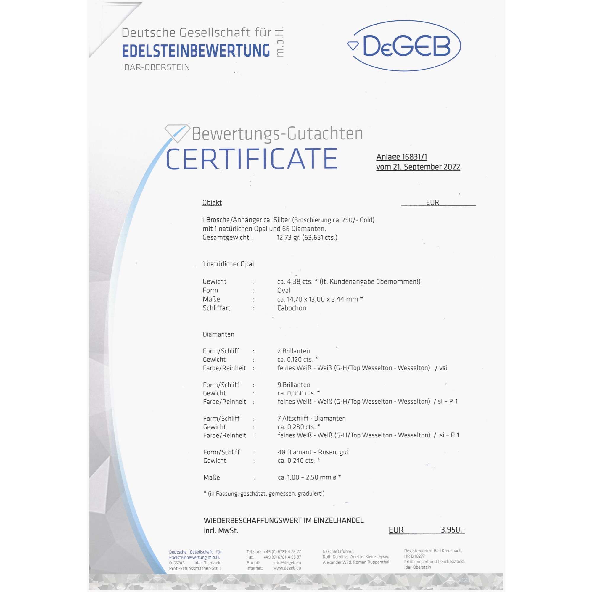 Zertifikat: Lieferung mit detailliertem Gutachten der Deutschen Gesellschaft für Edelsteinbewertung Idar-Oberstein vom 21. September 2022. Festgestellter Wiederbeschaffungswert: 3.950.- Euro