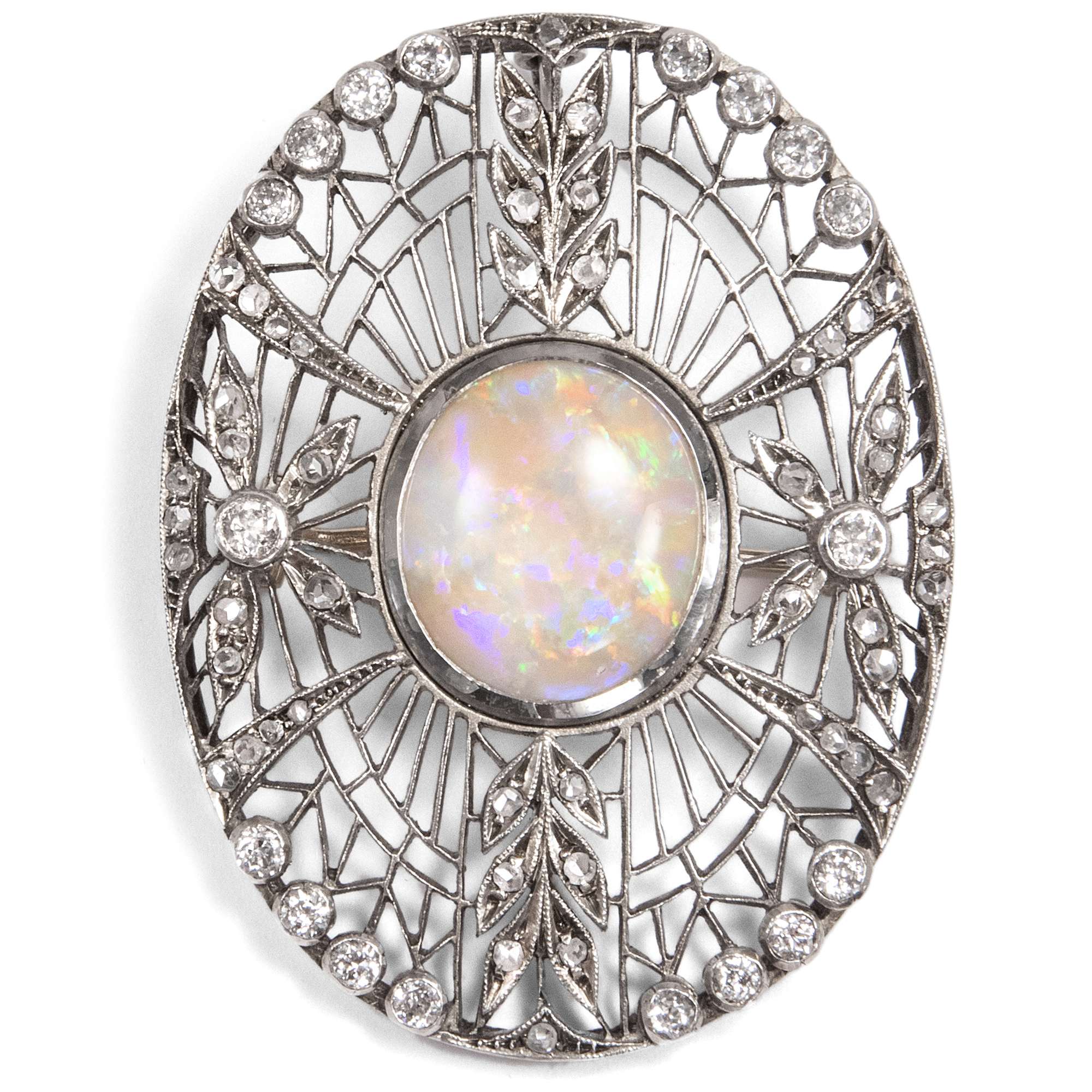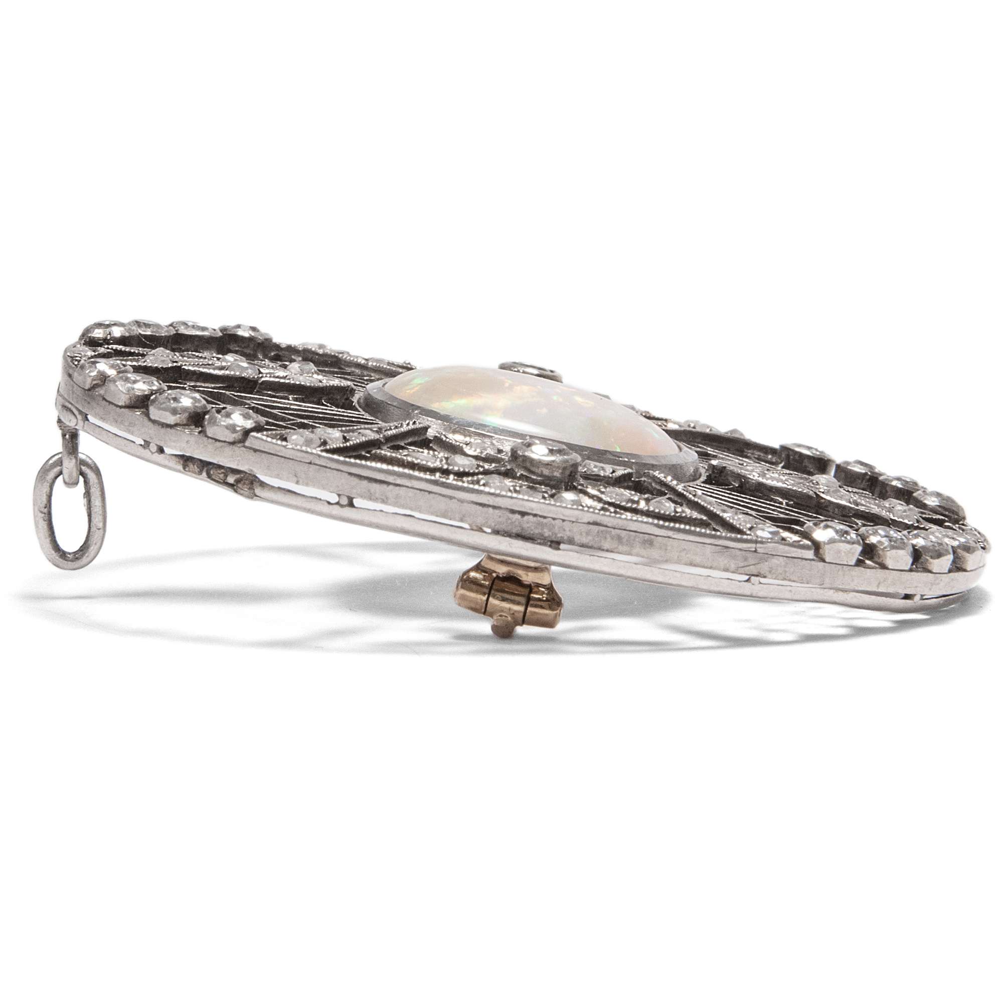 Material: Ein australischer Vollopal als Cabochon, ca. 4,38 ct, 14,70 x 13,00 x 3,44 mm 18 Diamanten im Altschliff, zus. ca. 0,76 ct, Feines Weiß (Top Wesselton, G) – Weiß (Wesselton, H), si – pi 48 Diamanten im Rosenschliff, zus. ca. 0,240 ct, ca. 1,00 – 2,50 mm Durchmesser Gold 750/000, entspricht 18 Karat, rhodiniert Silber 835/000