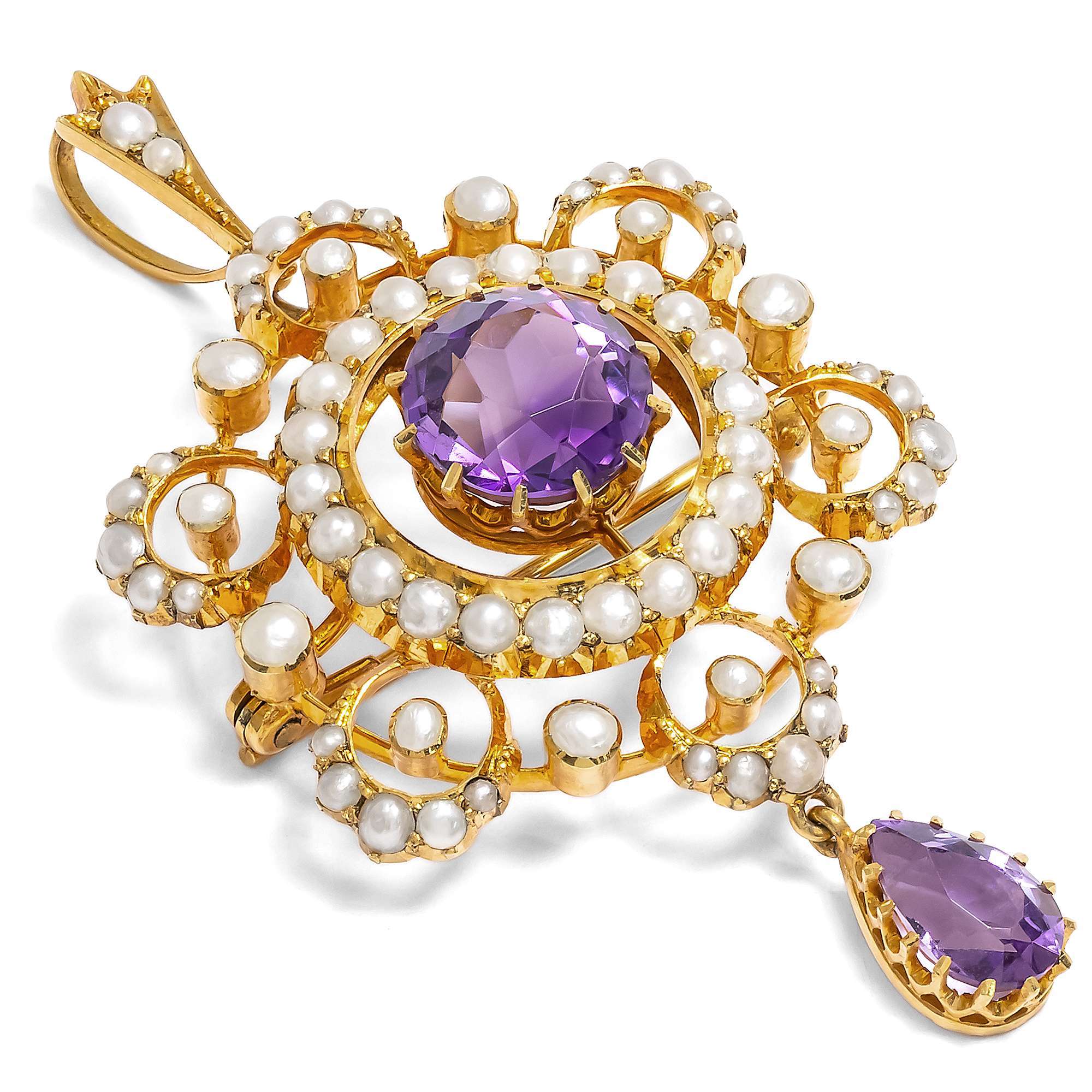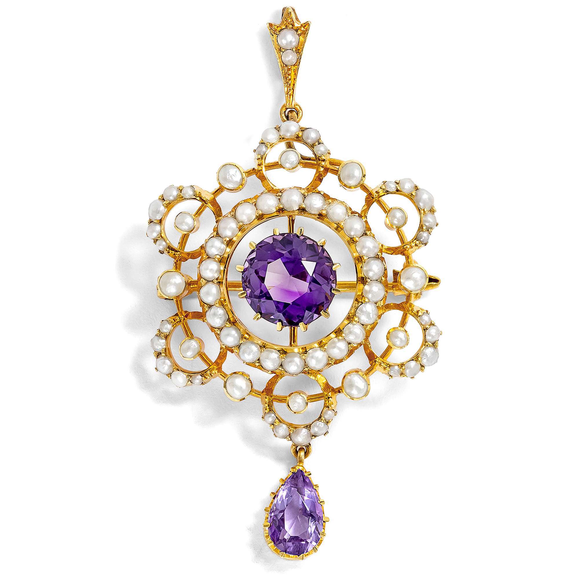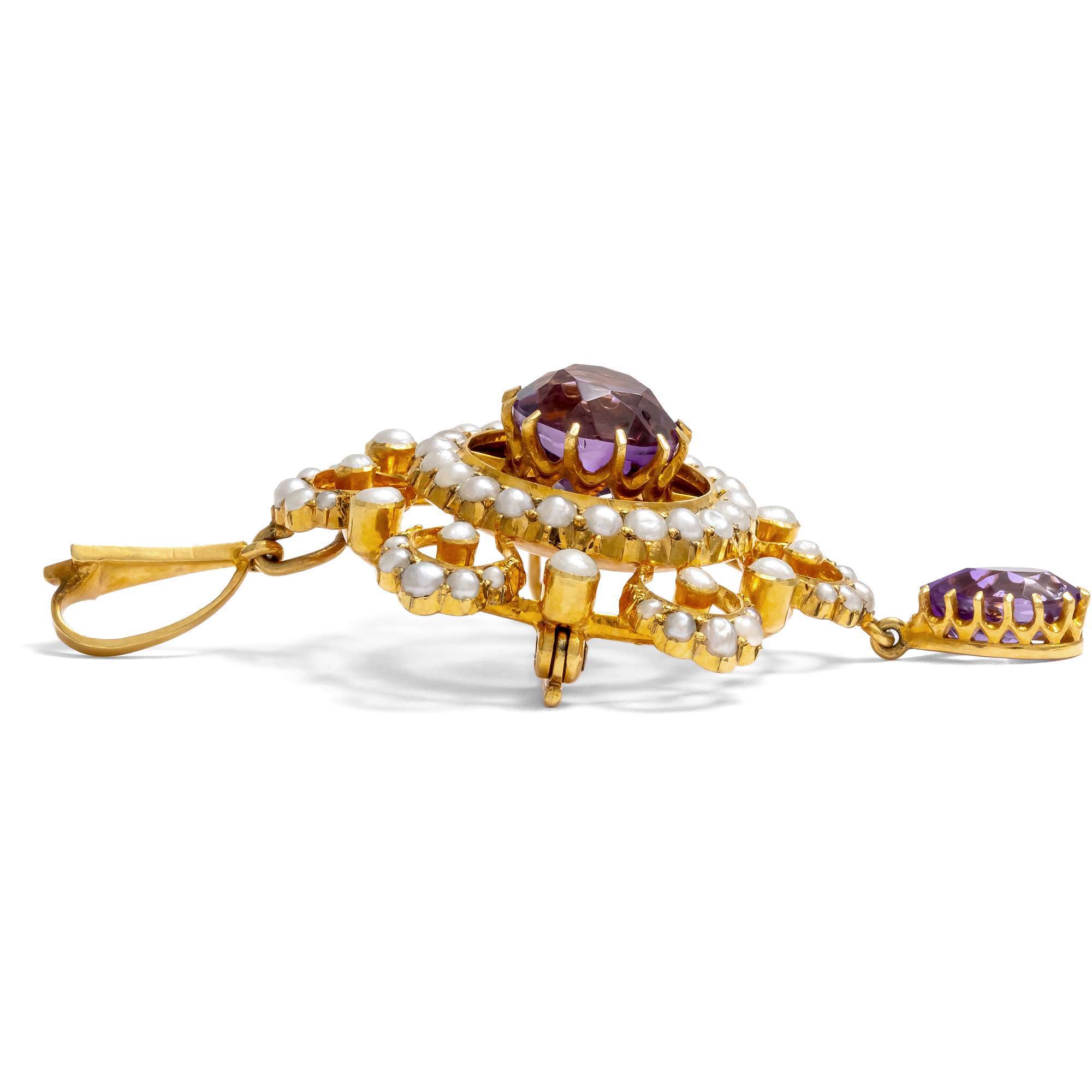 Prächtige Anhänger-Brosche mit Amethyst & Perlen in Gold, Großbritannien um 1900