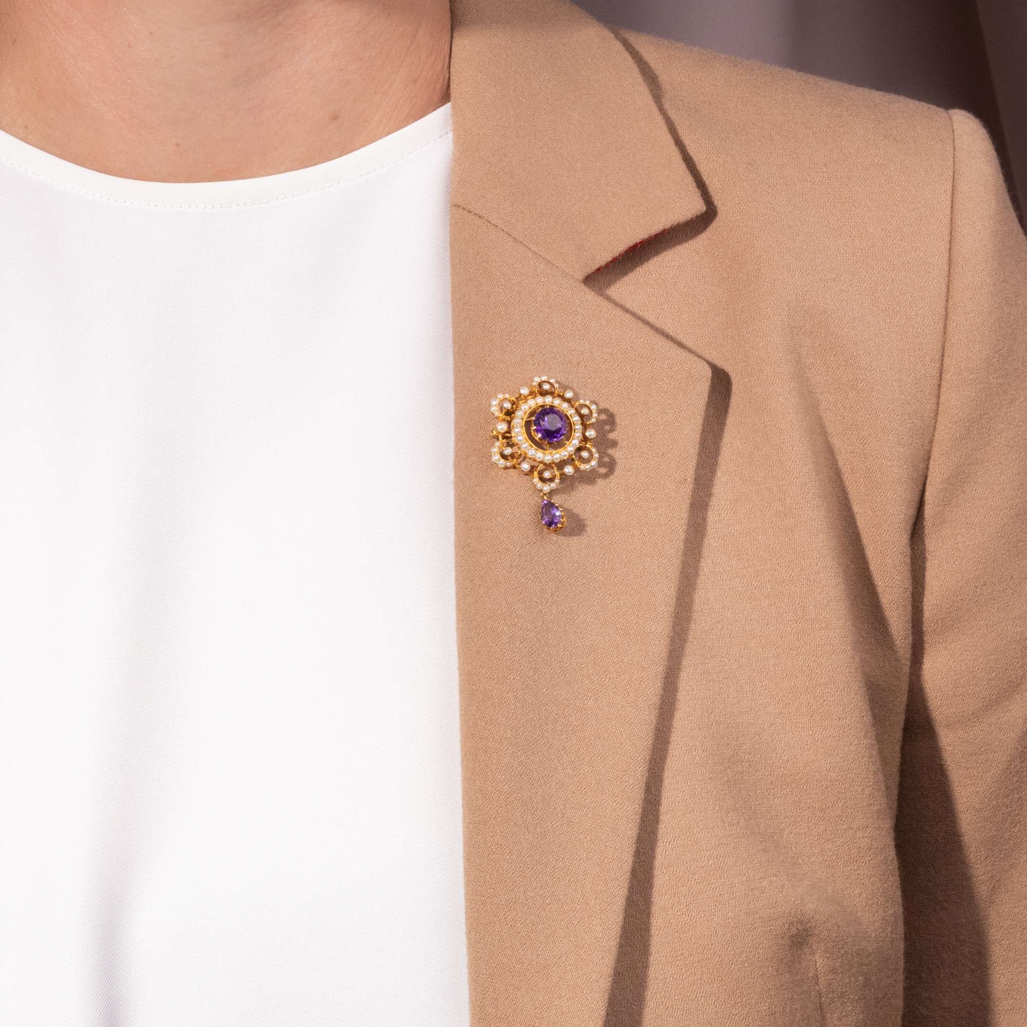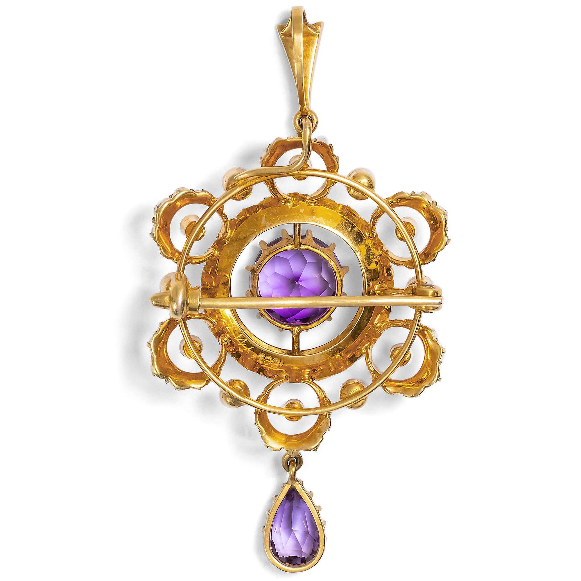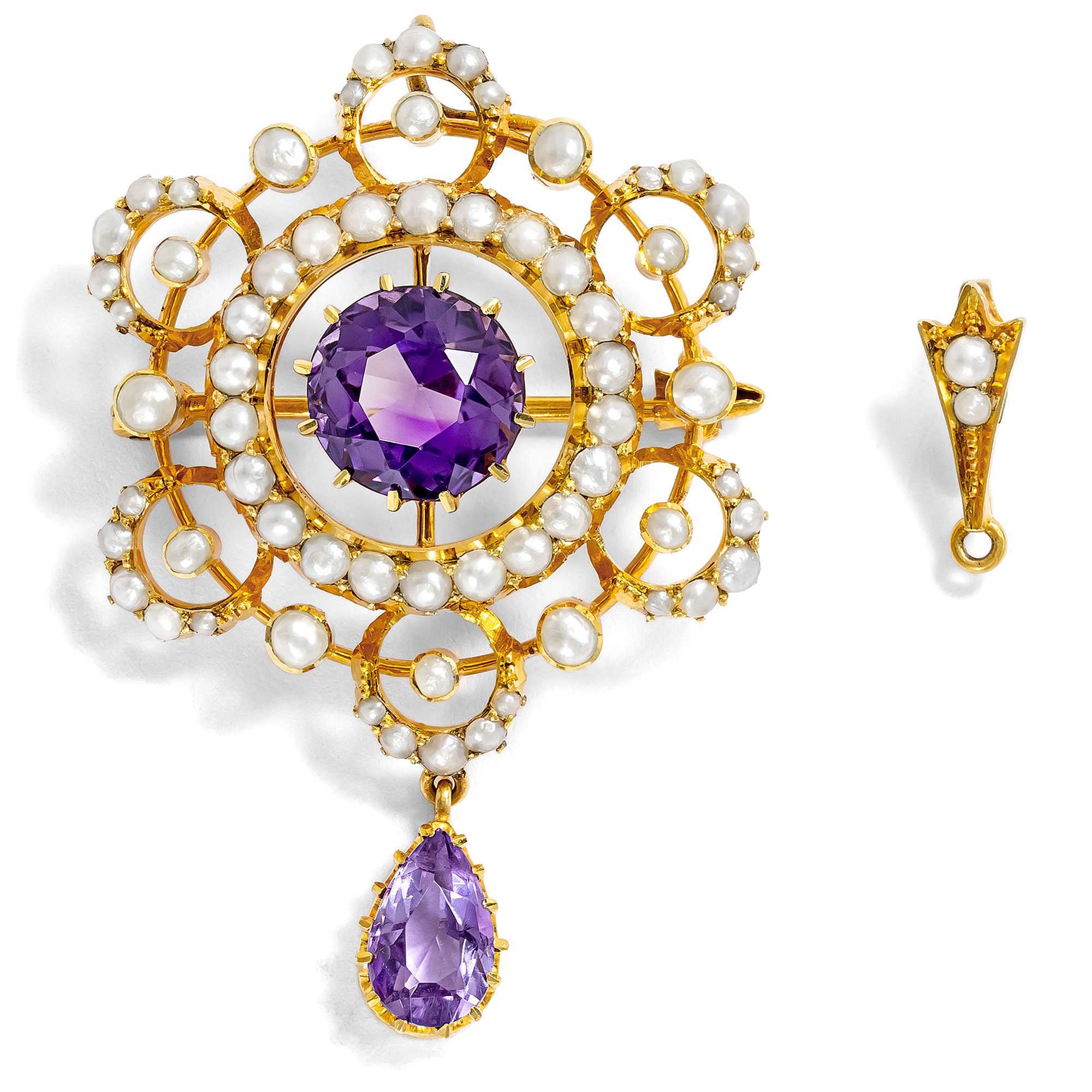 Prächtige Anhänger-Brosche mit Amethyst & Perlen in Gold, Großbritannien um 1900