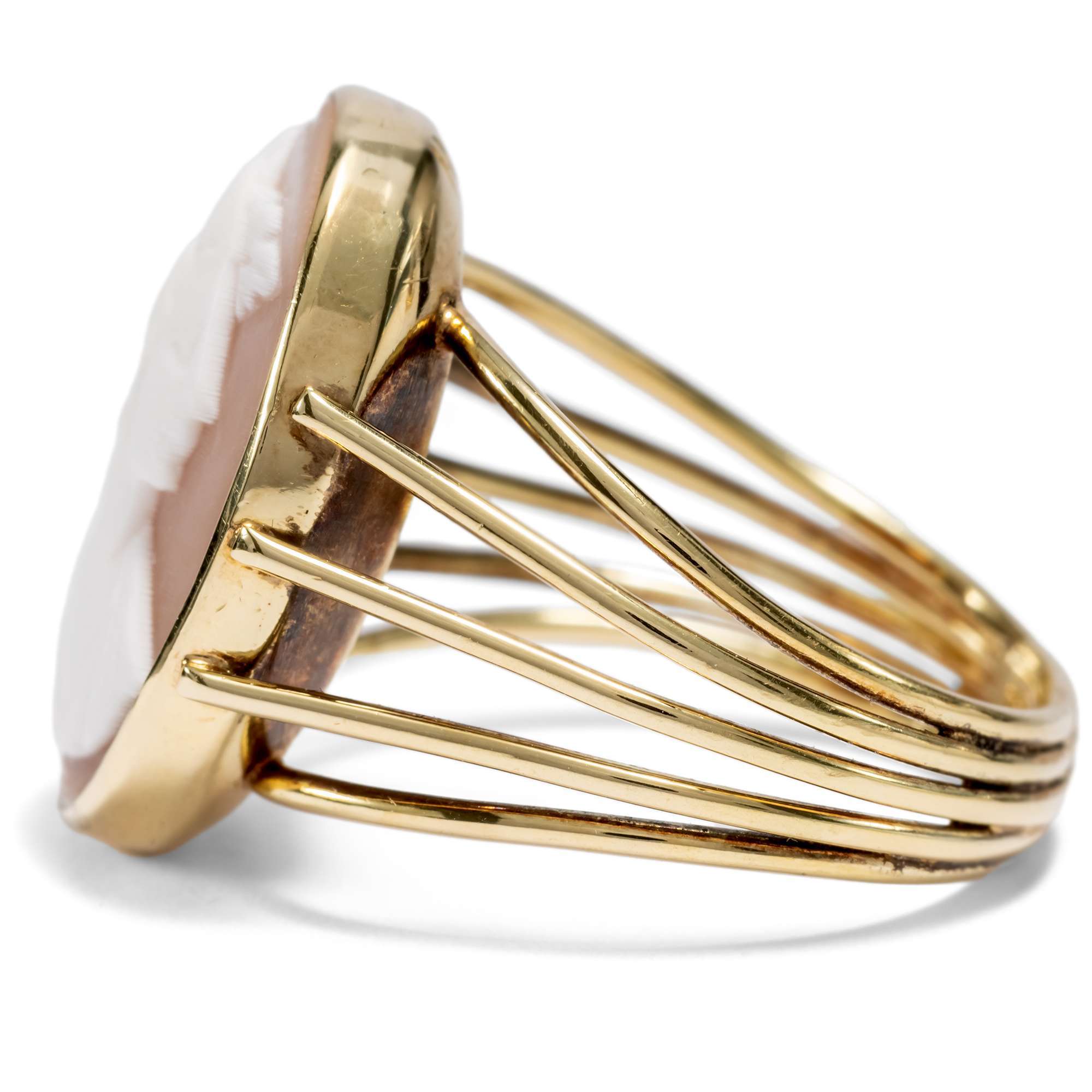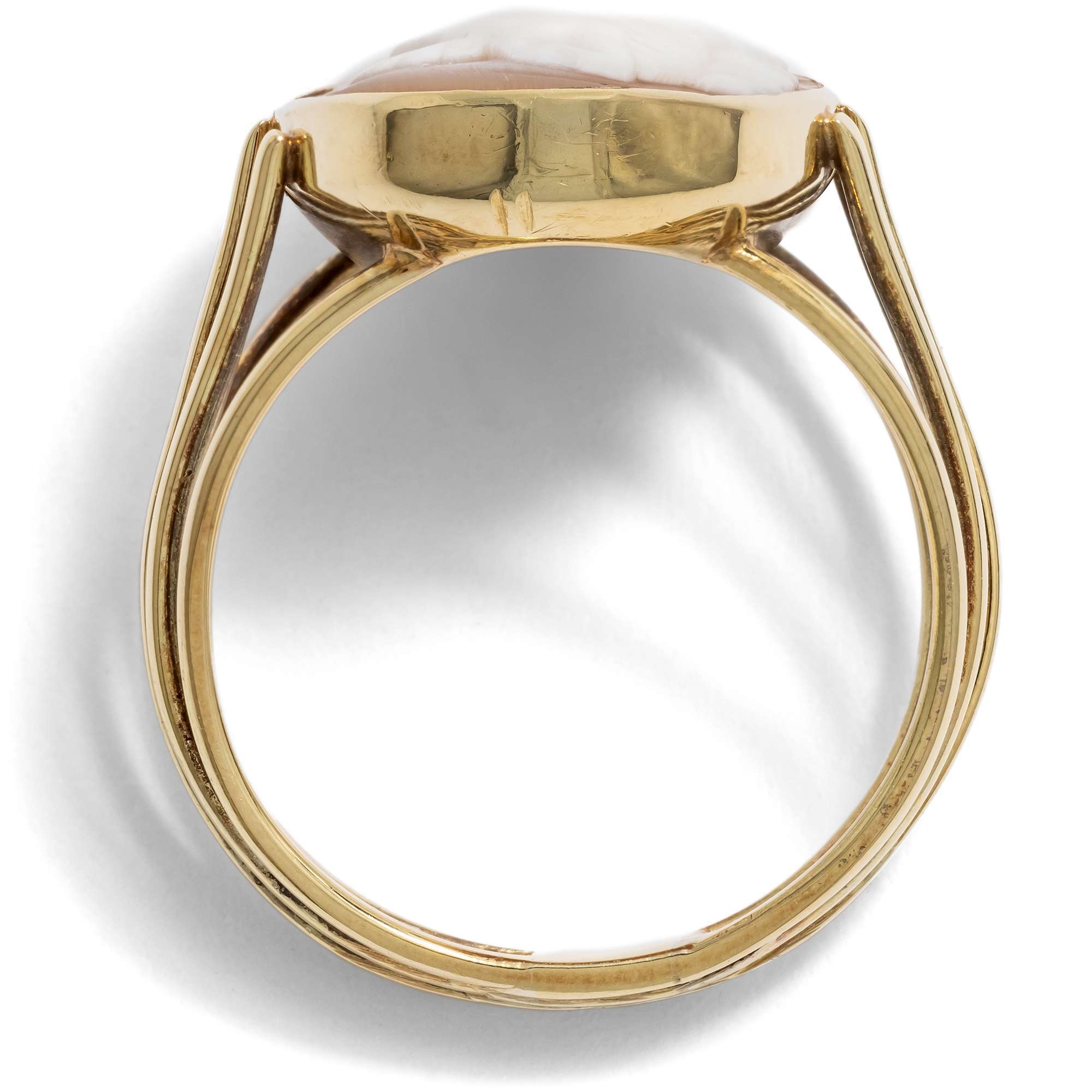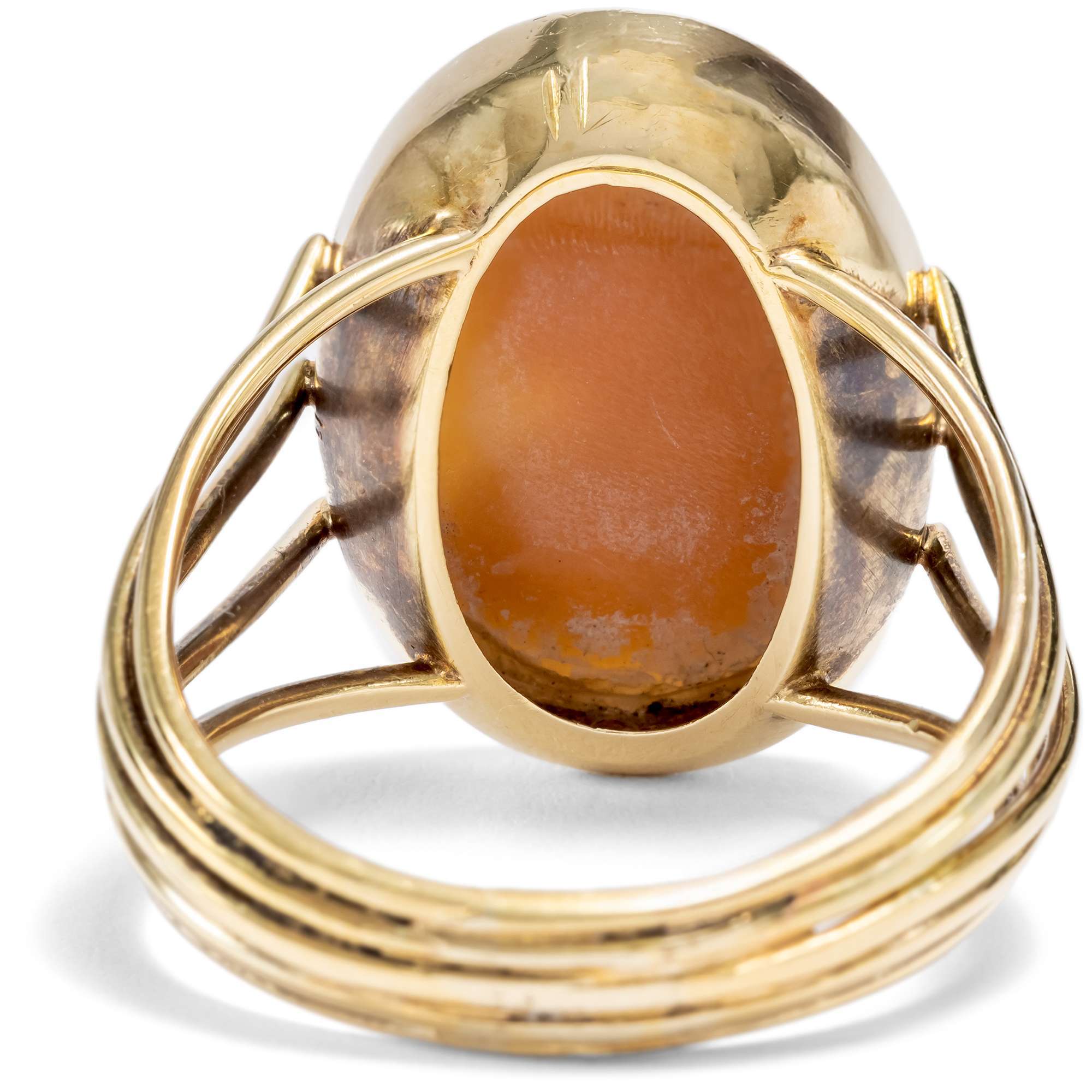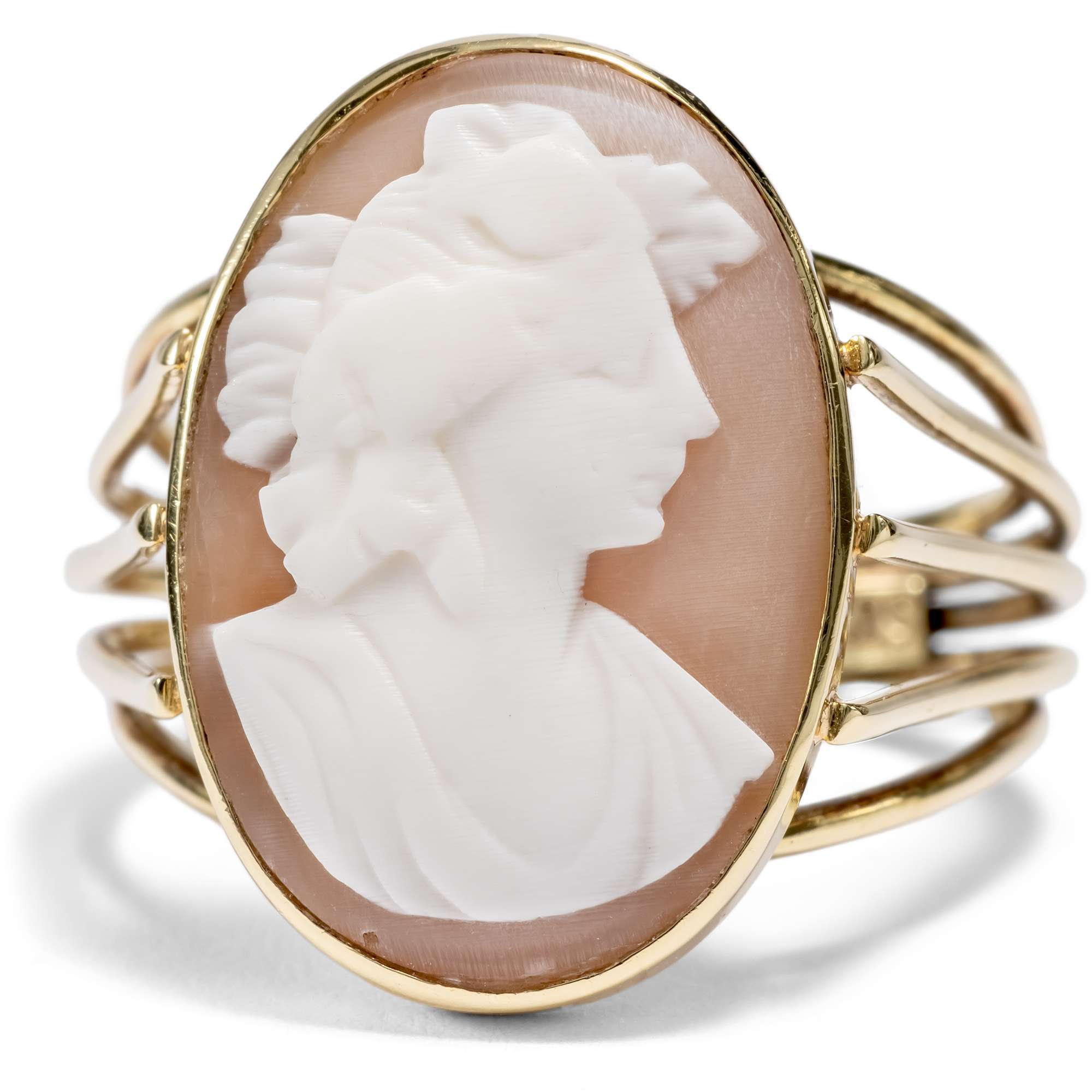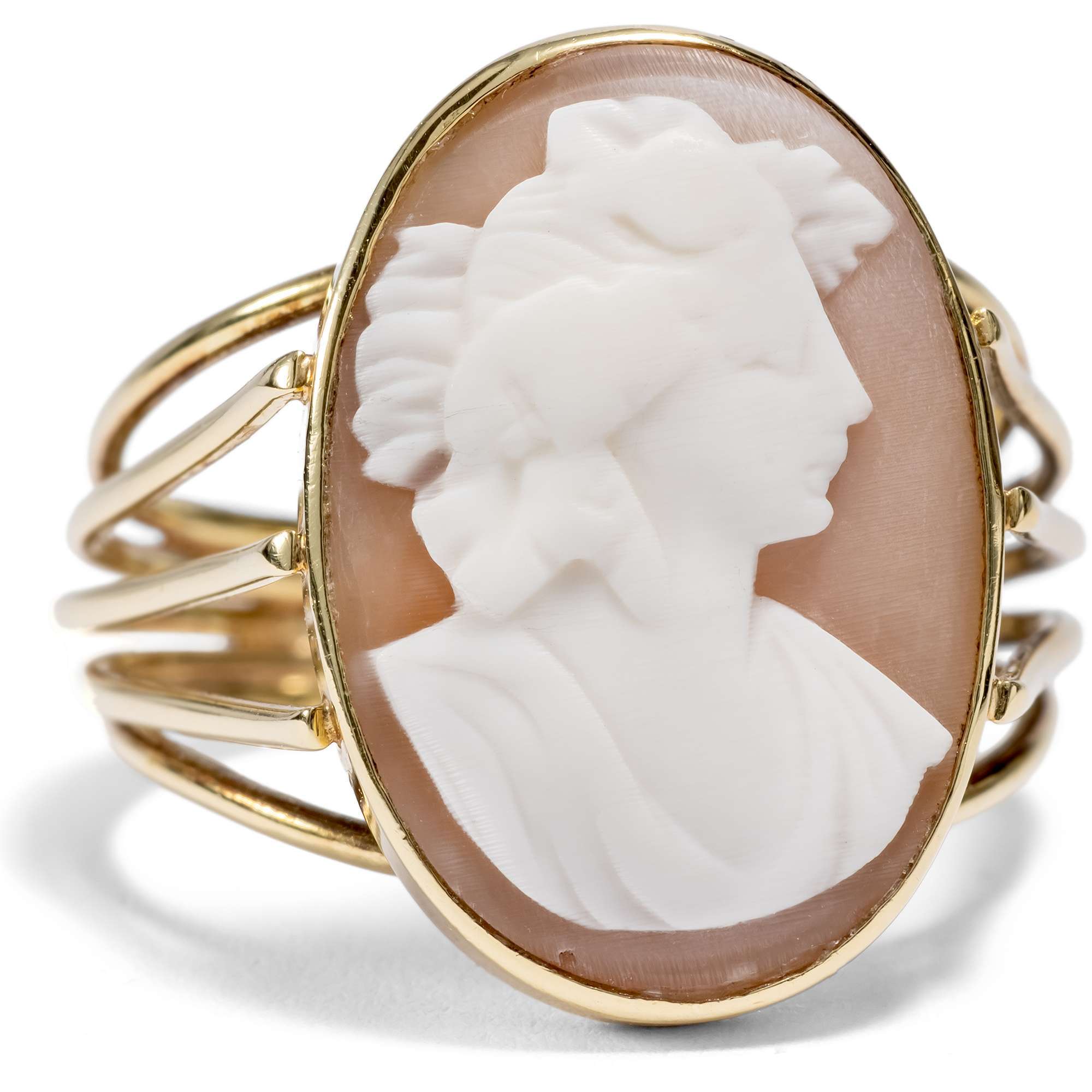 Eine Muschelgemme des ausgehenden 19. Jahrhunderts präsentiert der hier vorliegende Vintage-Ring, den wir in die Jahre um 1960 datieren. Im Profil dargestellt sehen wir eine junge Dame mit wallendem Haar, geschmückt mit einem reichen Kranz aus Weinblättern.
