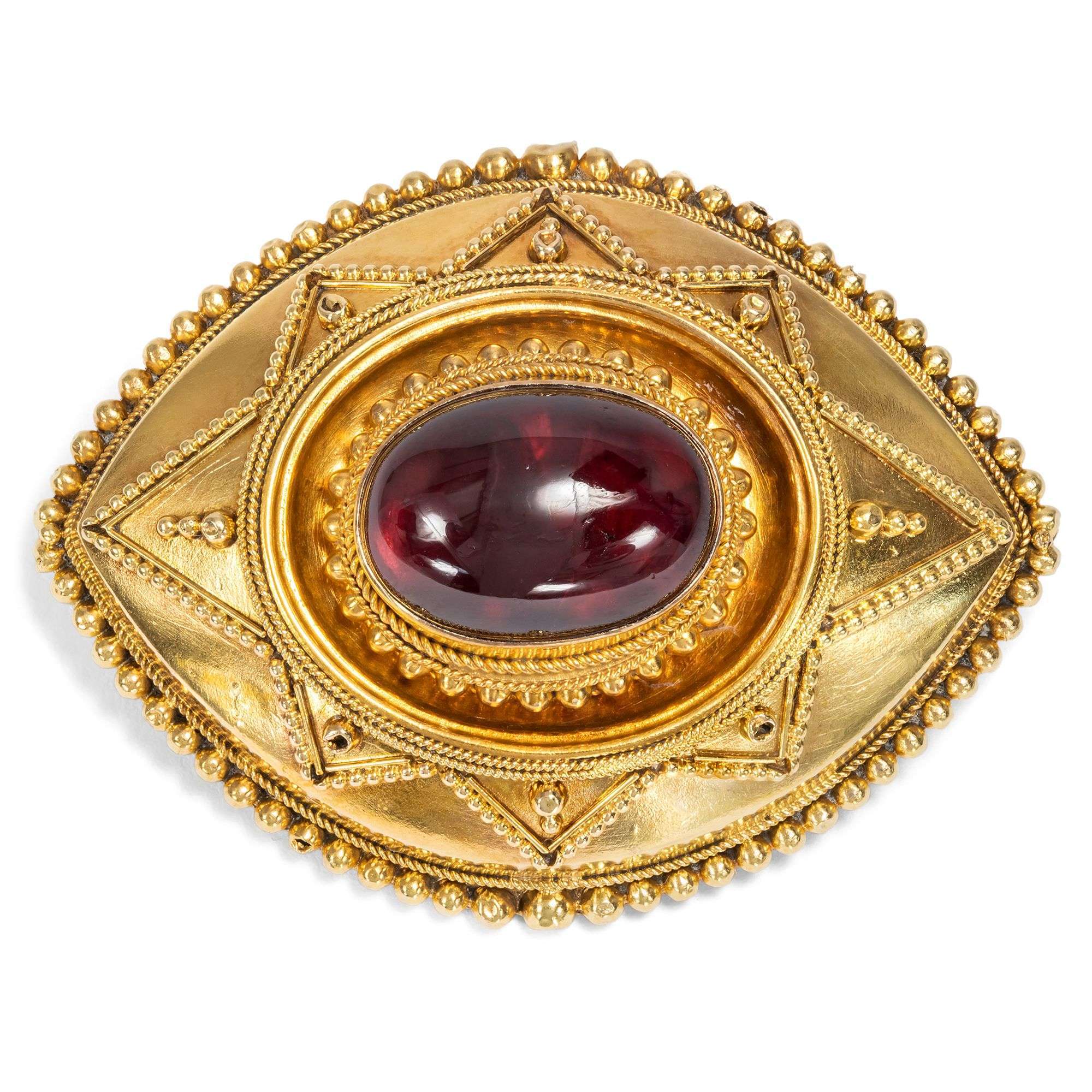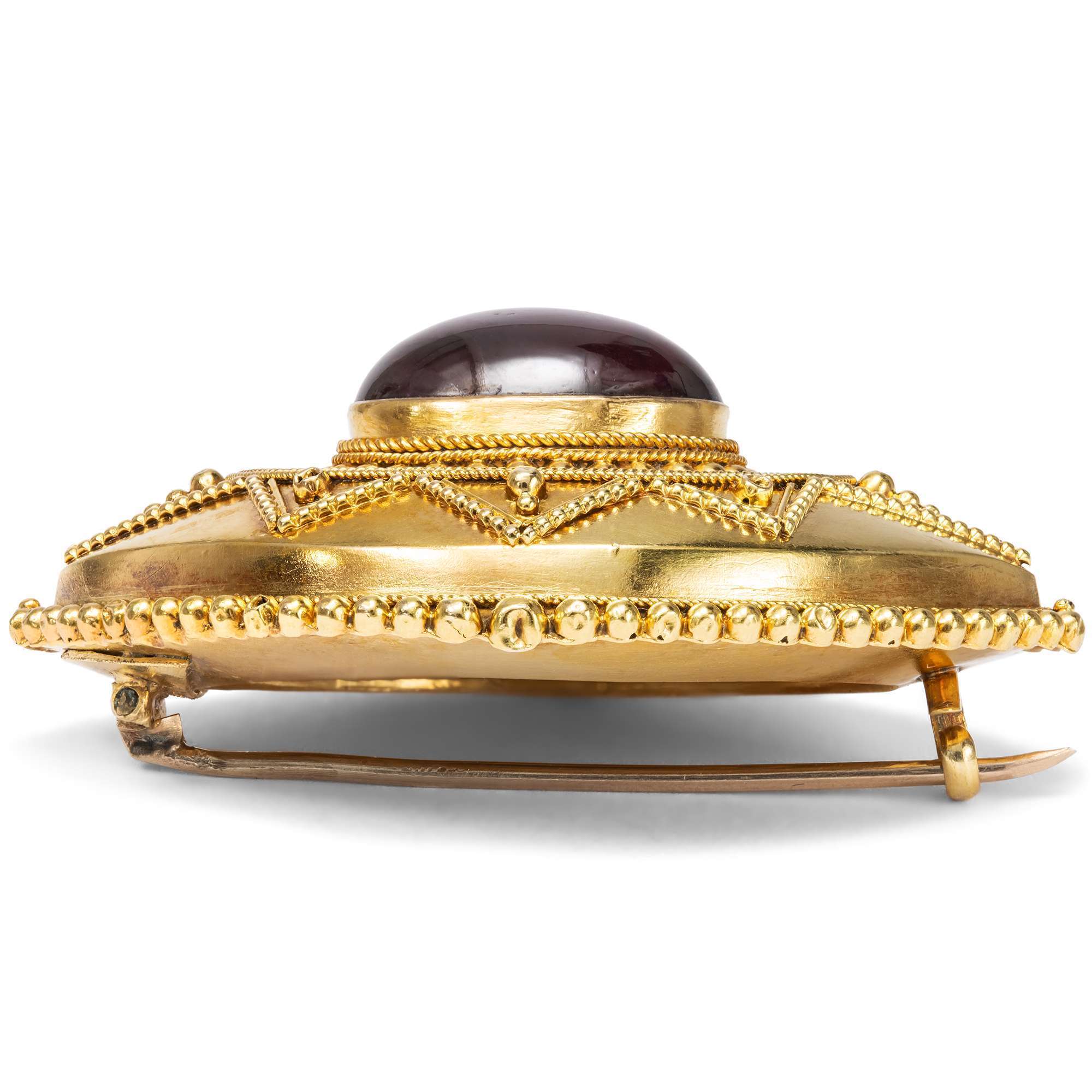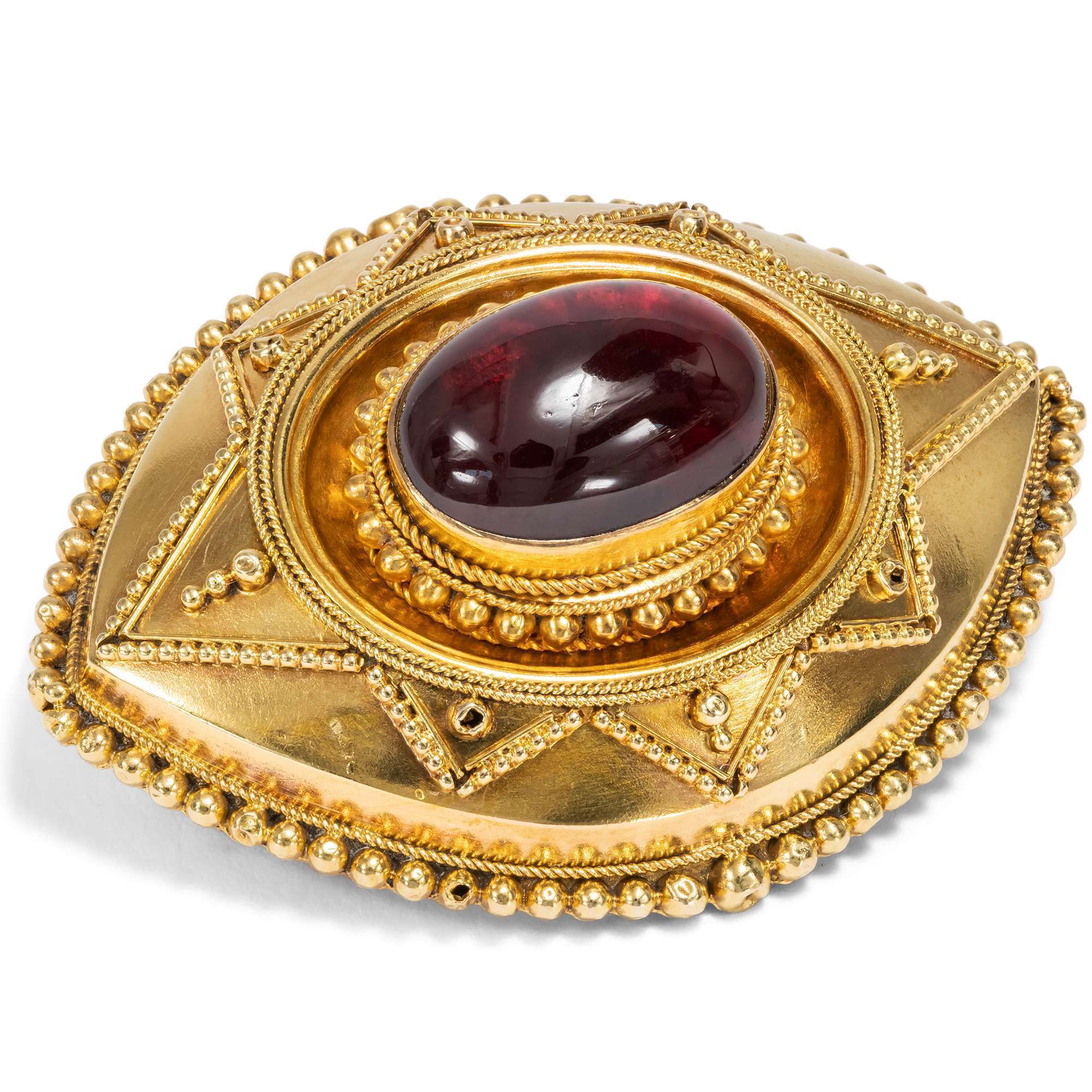 Ein großer Almandin-Granat im ovalen Cabochonschliff steht im Zentrum des Entwurfs und sitzt in einer geschlossenen Spiegelfassung, die seine wundervoll tiefrote Himbeerfarbe besonders gut zur Geltung bringt. Um den Stein herum entfaltet sich ein spitzenartiges Dekor, gebildet aus Goldkordeln und -kugeln im um 1870 herum modernen, sog. „Archäologischen Stil“. Eine zusätzliche matte Feinvergoldung – das sog. „bloomed gold“ – lässt die Brosche samtig strahlen.