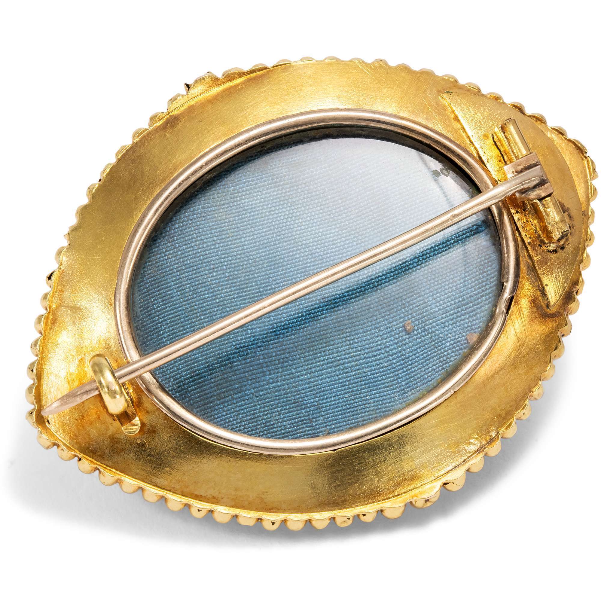 Heute kennt man das Medaillon fast nur noch als Anhänger, doch damals trat es auch durchaus in Form von Broschen und sogar an Armbändern auf. Auch die vorliegende, mandelförmige Brosche trägt rückseitig ein verglastes Fach. Das Fächlein ist heute leer, doch verbarg es ursprünglich sicher ein Erinnerungsstück an einen frohen Anlass. Denn für eine traurige Gelegenheit wäre die Brosche in den Augen der Zeitgenossen nicht geeignet gewesen, aufgrund ihres satten Goldtons und leuchtenden Edelsteinbesatzes.