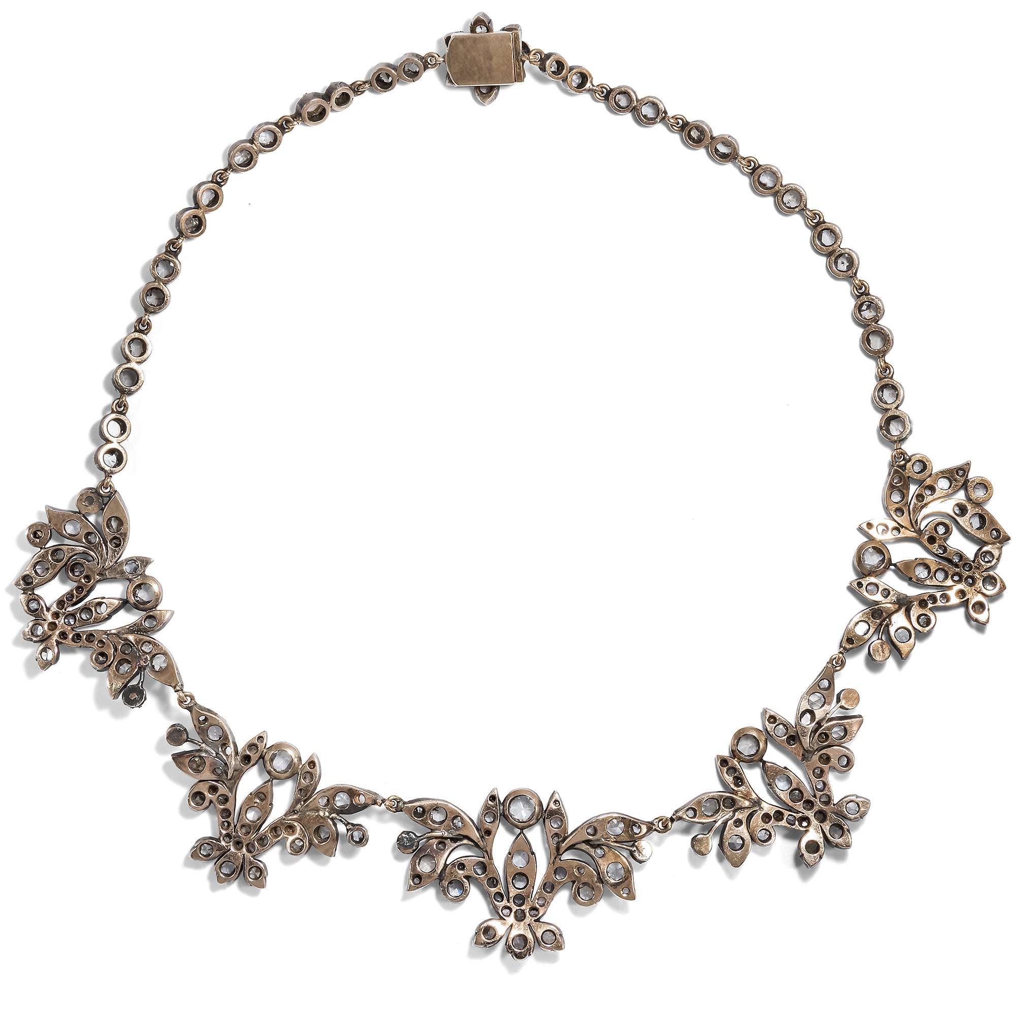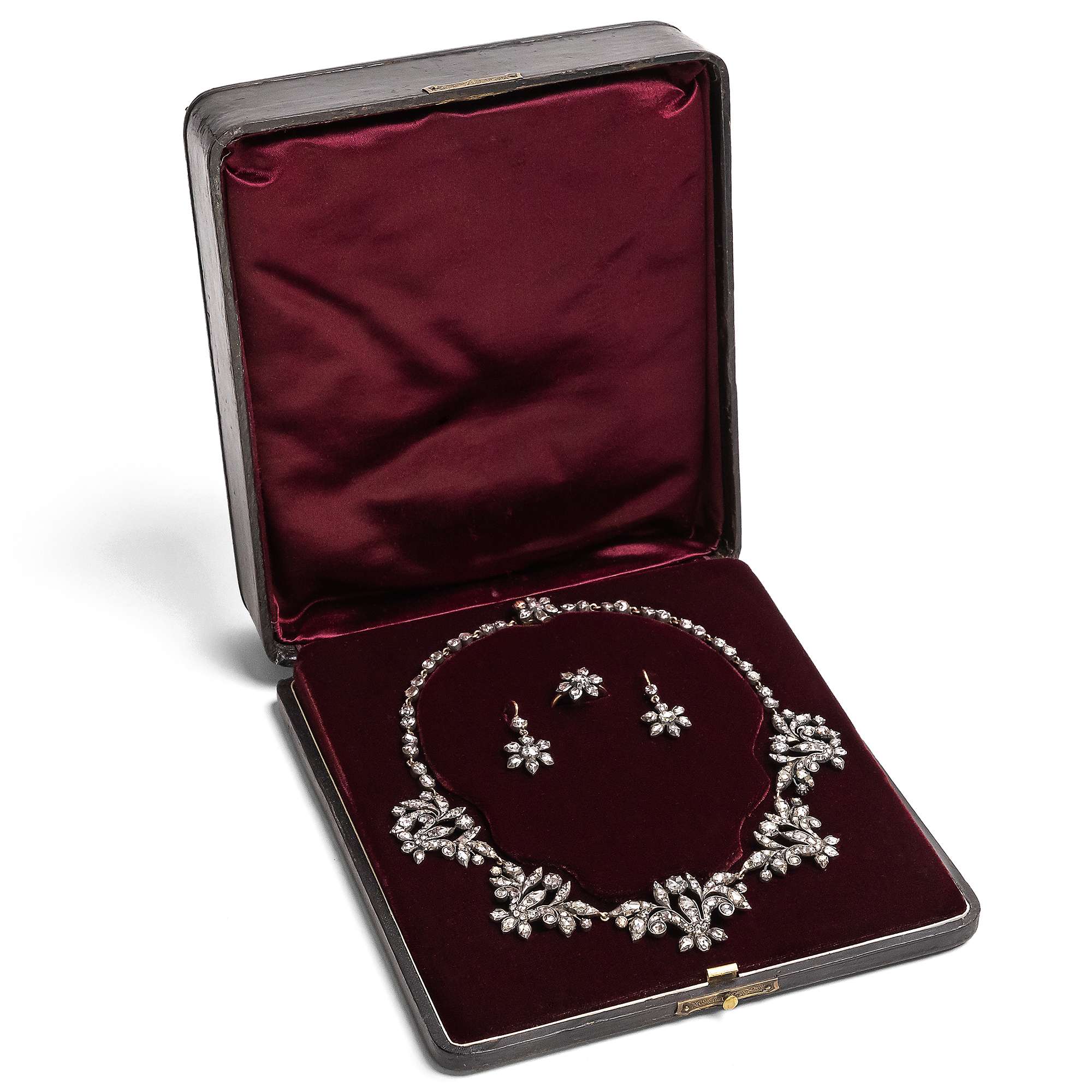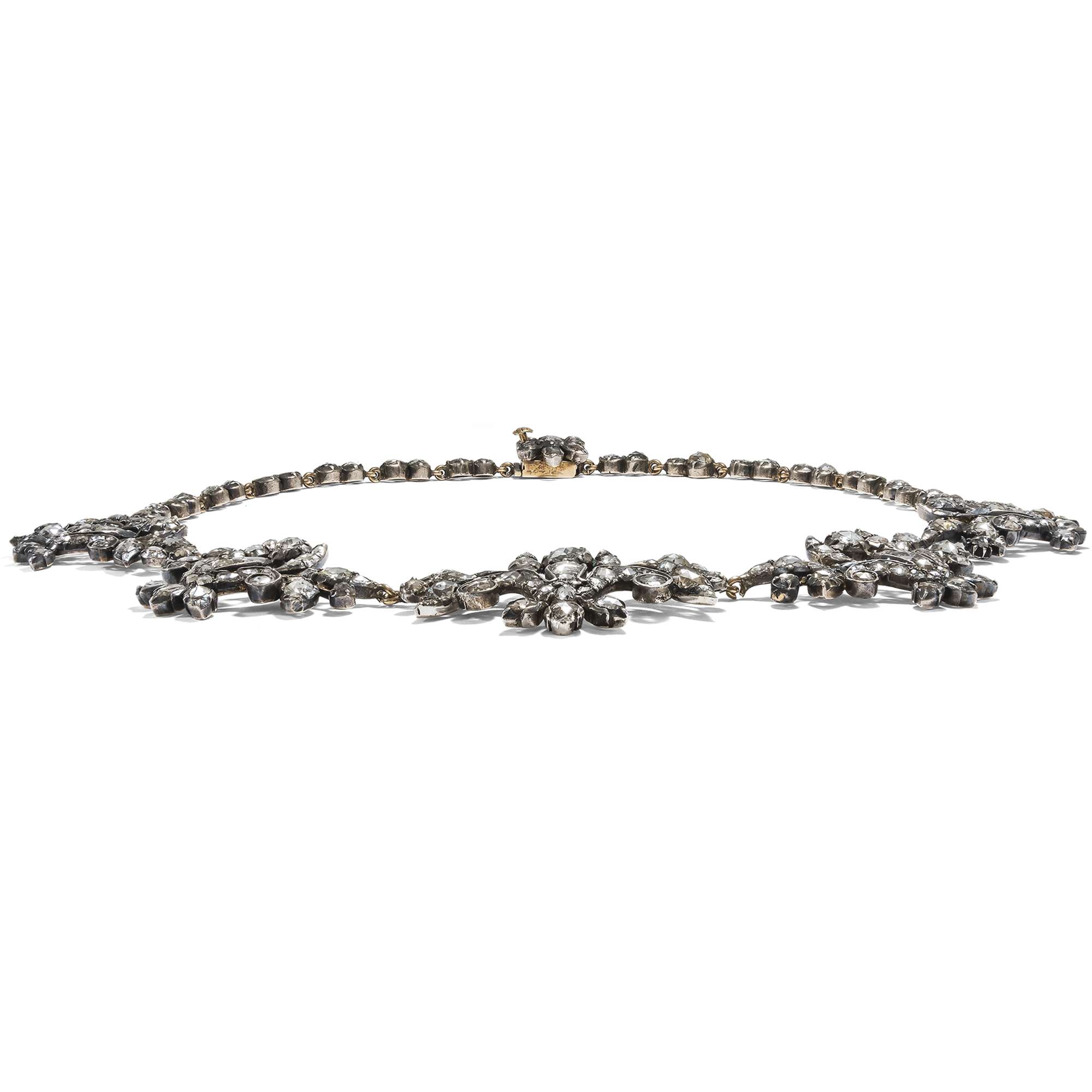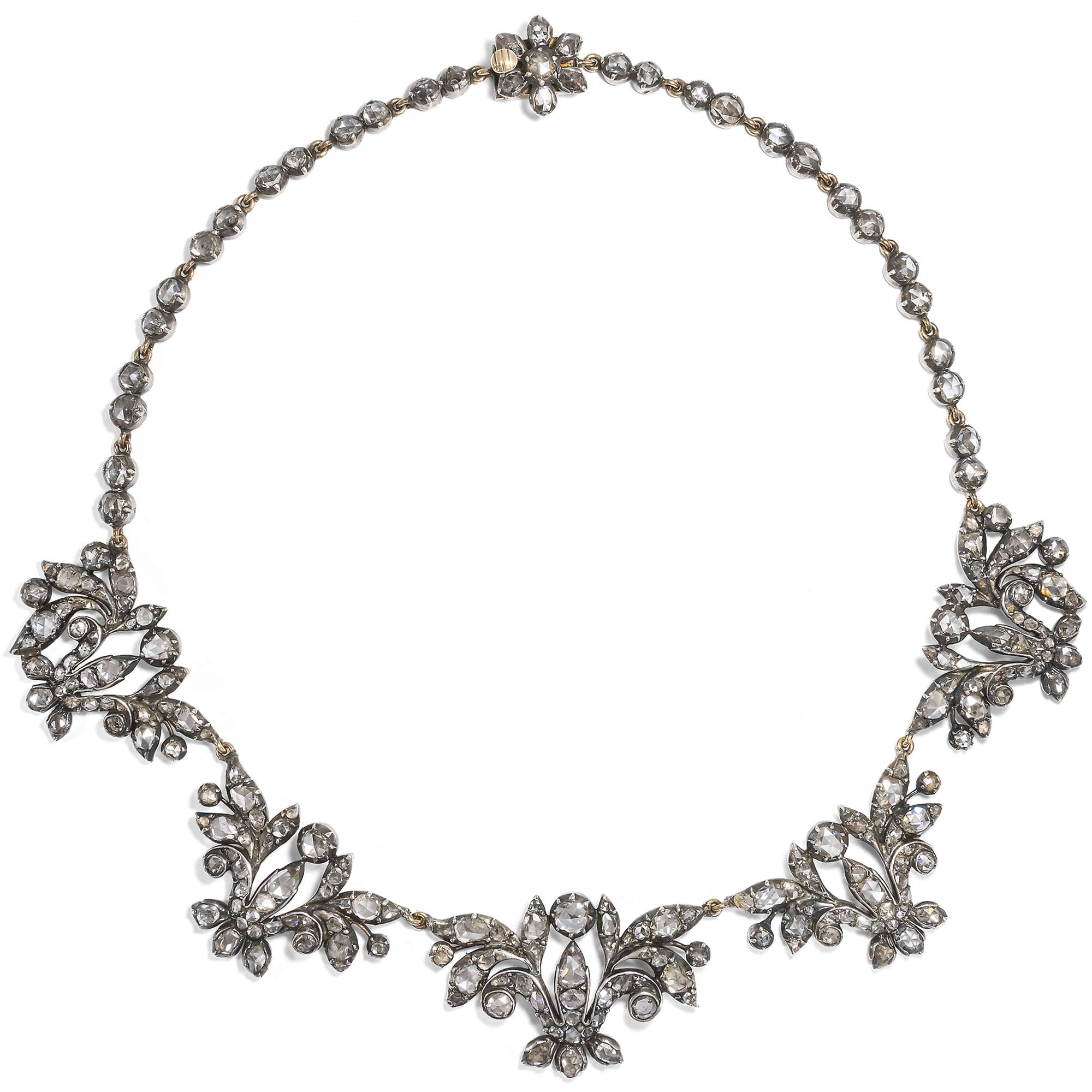 Die Blüten, aus denen die Ohrringe und der Ring in jüngerer Zeit gefertigt wurden, waren ursprünglich wohl auch Teil des Colliers. Vielleicht waren Sie an den größeren Ornamenten in der Mitte angehängt, oder sie waren Teil der Kette. Uns hat das Set so erreicht wie es hier vorliegt. Das passend eingerichtete, antike Etui schützt die Parure und bietet zugleich die Möglichkeit, das kostbare Set wunderbar zu präsentieren.Diamanten im Rosenschliff, auch „Rose couronée“, „gekrönte Rosen“ genannt, finden sich bereits bei Schmuckstücken des 16. Jahrhunderts. Zahlreiche berühmte Diamanten wie der Orloff und der Großmogul sind in diesem Rosenschliff gestaltet. Er zeichnet sich dadurch aus, dass die Oberseite des Diamanten sternförmig facettiert ist und die Unterseite flach geschliffen wurde. So entsteht ein ganz spezifischer, sanfter Schimmer, der sich sehr vom manchmal grellen Leuchten der heutigen Brillanten unterscheidet.