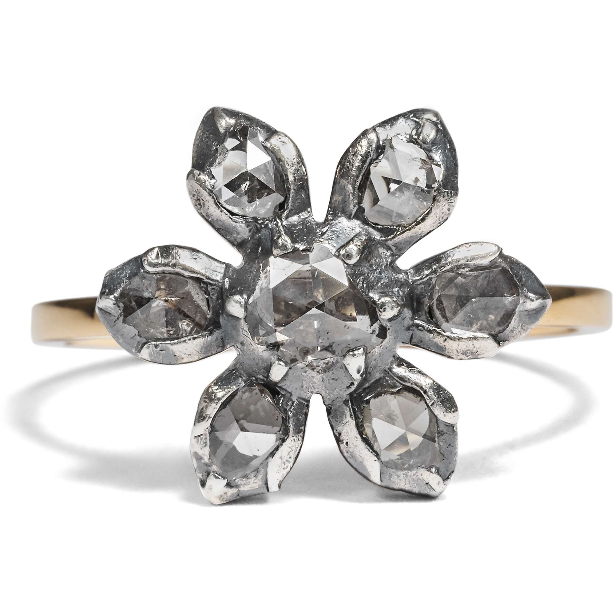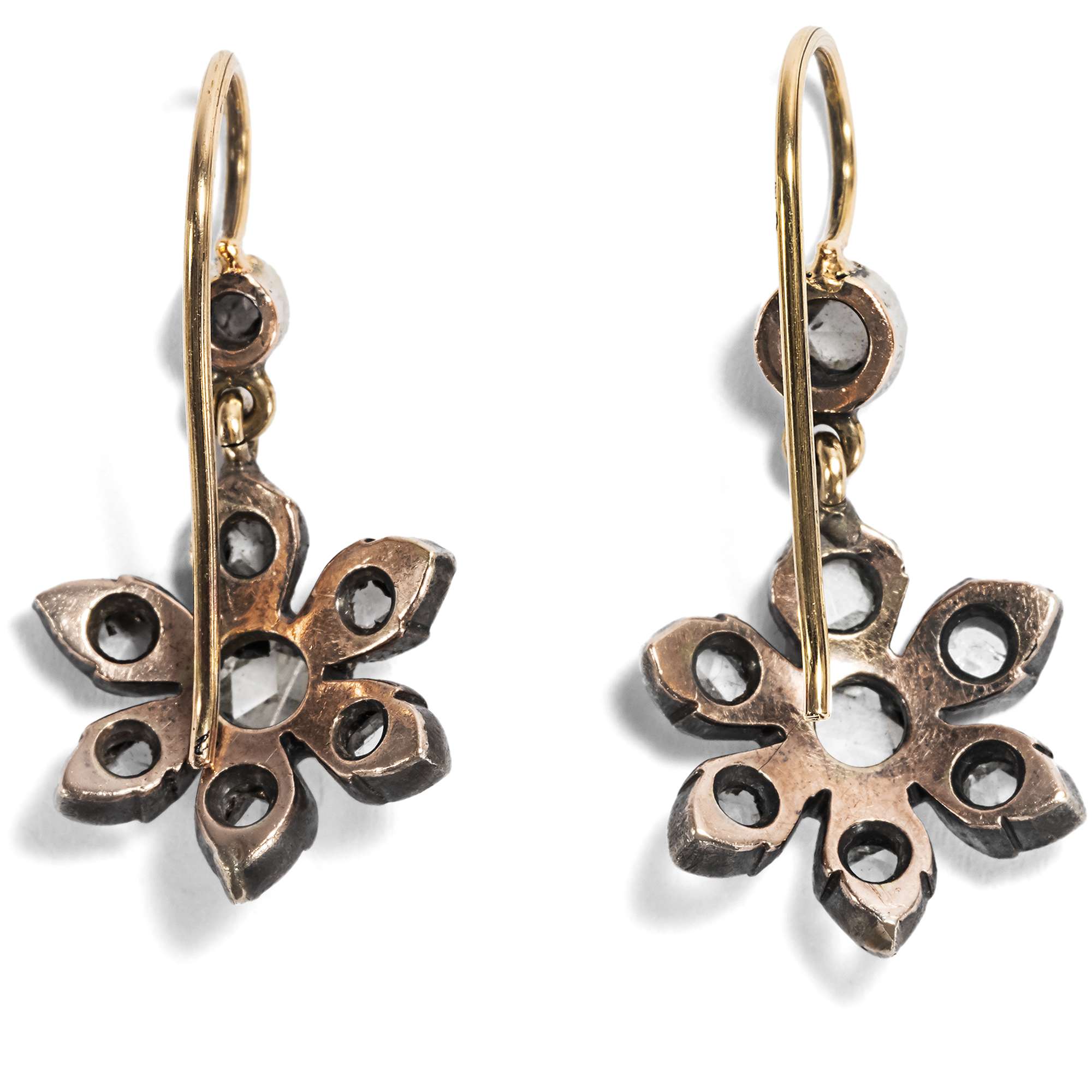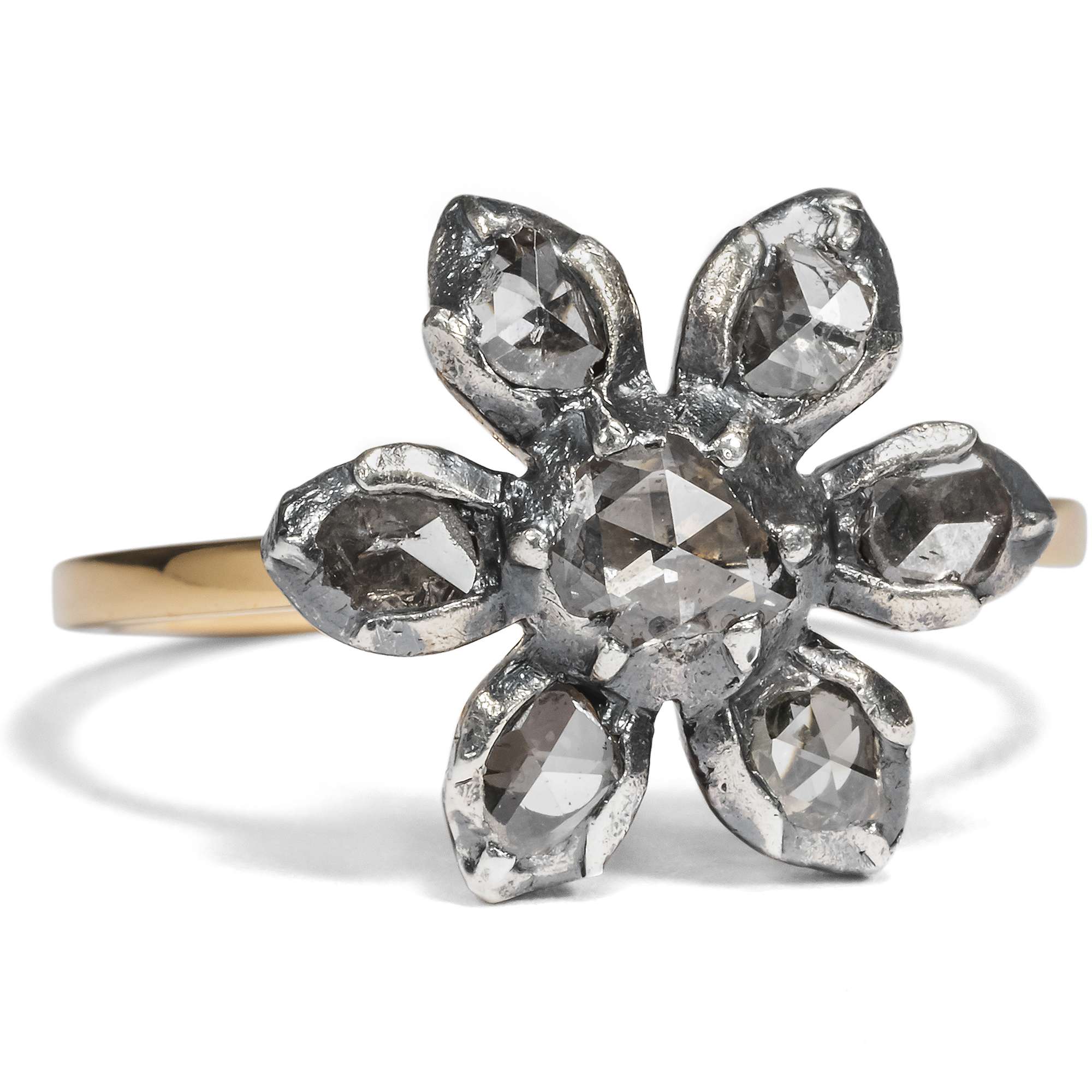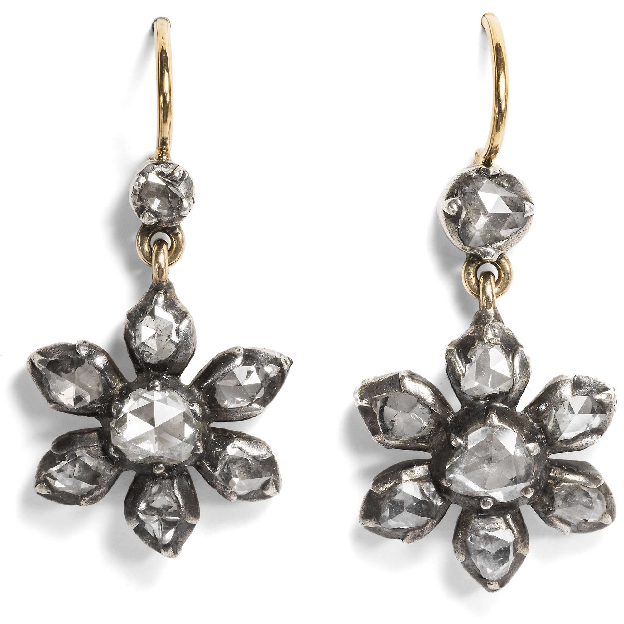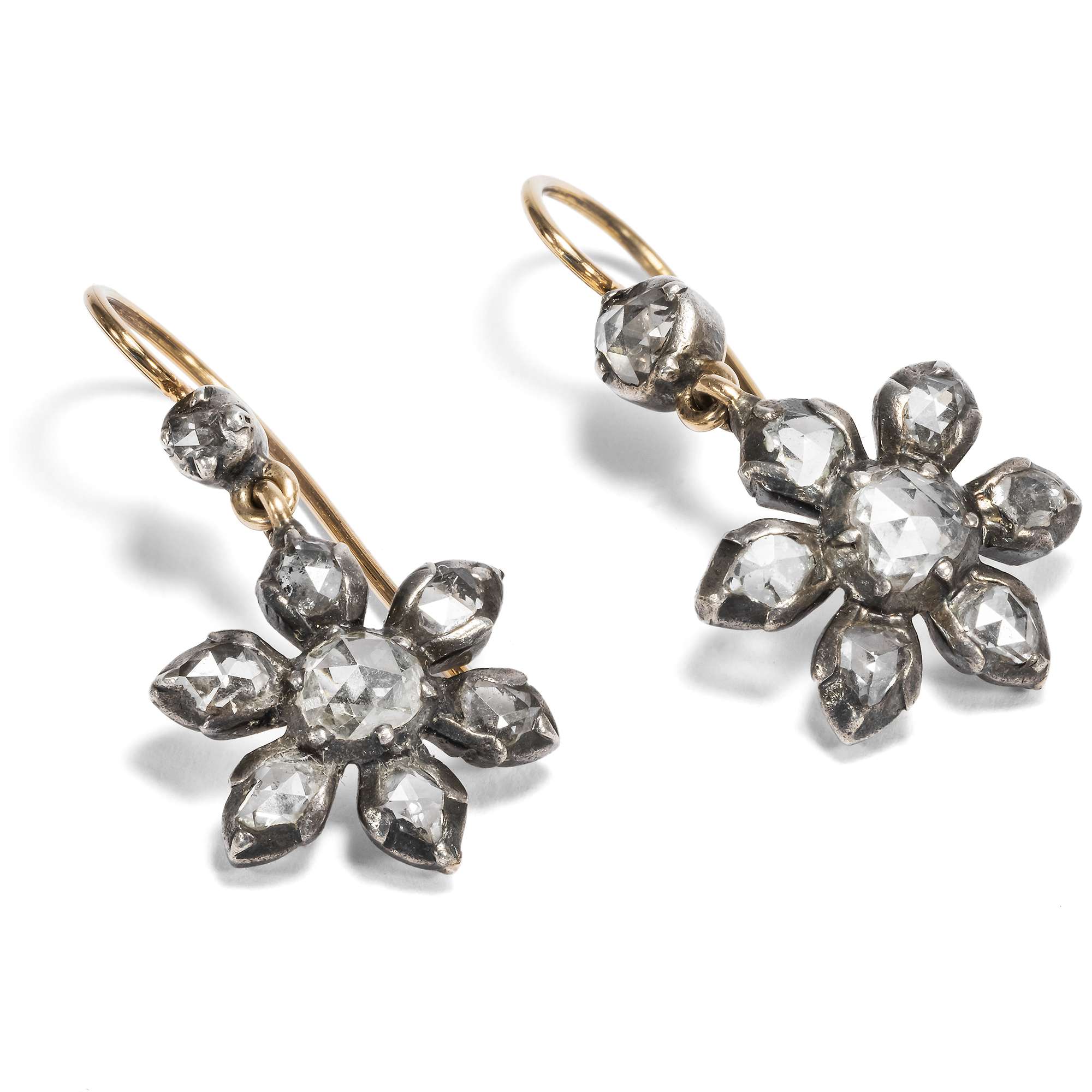 Die Blüten, aus denen die Ohrringe und der Ring in jüngerer Zeit gefertigt wurden, waren ursprünglich wohl auch Teil des Colliers. Vielleicht waren Sie an den größeren Ornamenten in der Mitte angehängt, oder sie waren Teil der Kette. Uns hat das Set so erreicht wie es hier vorliegt. Das passend eingerichtete, antike Etui schützt die Parure und bietet zugleich die Möglichkeit, das kostbare Set wunderbar zu präsentieren.Diamanten im Rosenschliff, auch „Rose couronée“, „gekrönte Rosen“ genannt, finden sich bereits bei Schmuckstücken des 16. Jahrhunderts. Zahlreiche berühmte Diamanten wie der Orloff und der Großmogul sind in diesem Rosenschliff gestaltet. Er zeichnet sich dadurch aus, dass die Oberseite des Diamanten sternförmig facettiert ist und die Unterseite flach geschliffen wurde. So entsteht ein ganz spezifischer, sanfter Schimmer, der sich sehr vom manchmal grellen Leuchten der heutigen Brillanten unterscheidet.