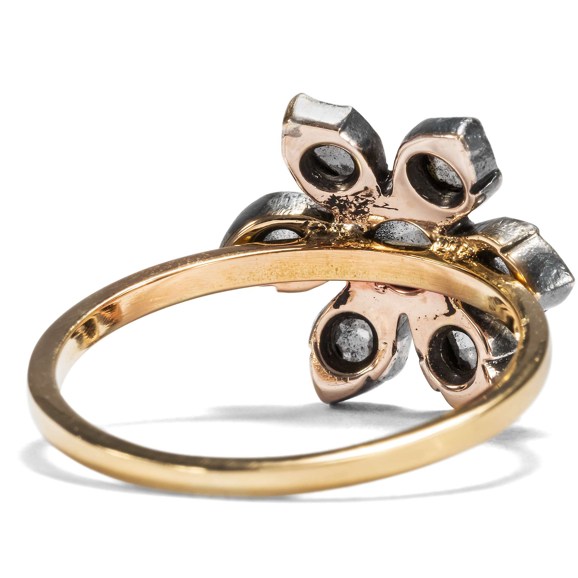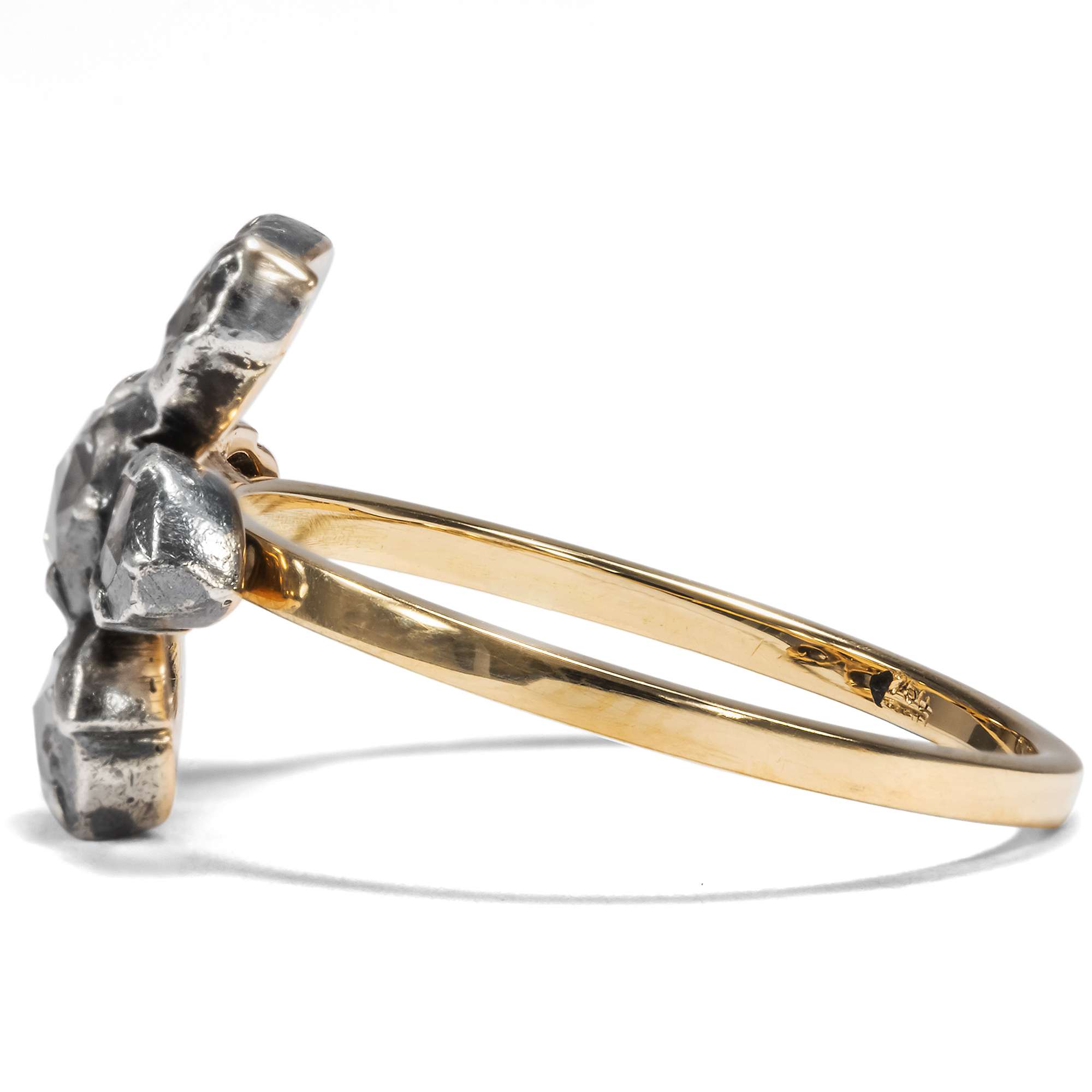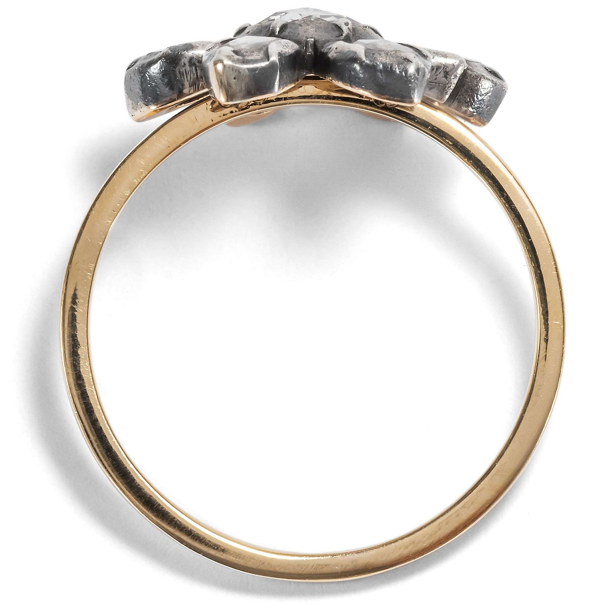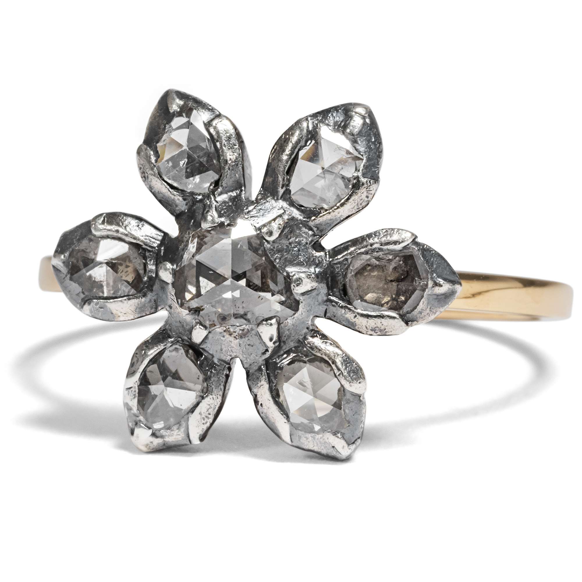 Die Blüten, aus denen die Ohrringe und der Ring in jüngerer Zeit gefertigt wurden, waren ursprünglich wohl auch Teil des Colliers. Vielleicht waren Sie an den größeren Ornamenten in der Mitte angehängt, oder sie waren Teil der Kette. Uns hat das Set so erreicht wie es hier vorliegt. Das passend eingerichtete, antike Etui schützt die Parure und bietet zugleich die Möglichkeit, das kostbare Set wunderbar zu präsentieren.Diamanten im Rosenschliff, auch „Rose couronée“, „gekrönte Rosen“ genannt, finden sich bereits bei Schmuckstücken des 16. Jahrhunderts. Zahlreiche berühmte Diamanten wie der Orloff und der Großmogul sind in diesem Rosenschliff gestaltet. Er zeichnet sich dadurch aus, dass die Oberseite des Diamanten sternförmig facettiert ist und die Unterseite flach geschliffen wurde. So entsteht ein ganz spezifischer, sanfter Schimmer, der sich sehr vom manchmal grellen Leuchten der heutigen Brillanten unterscheidet.