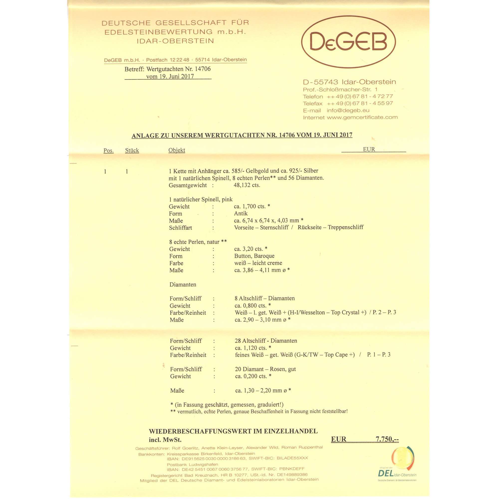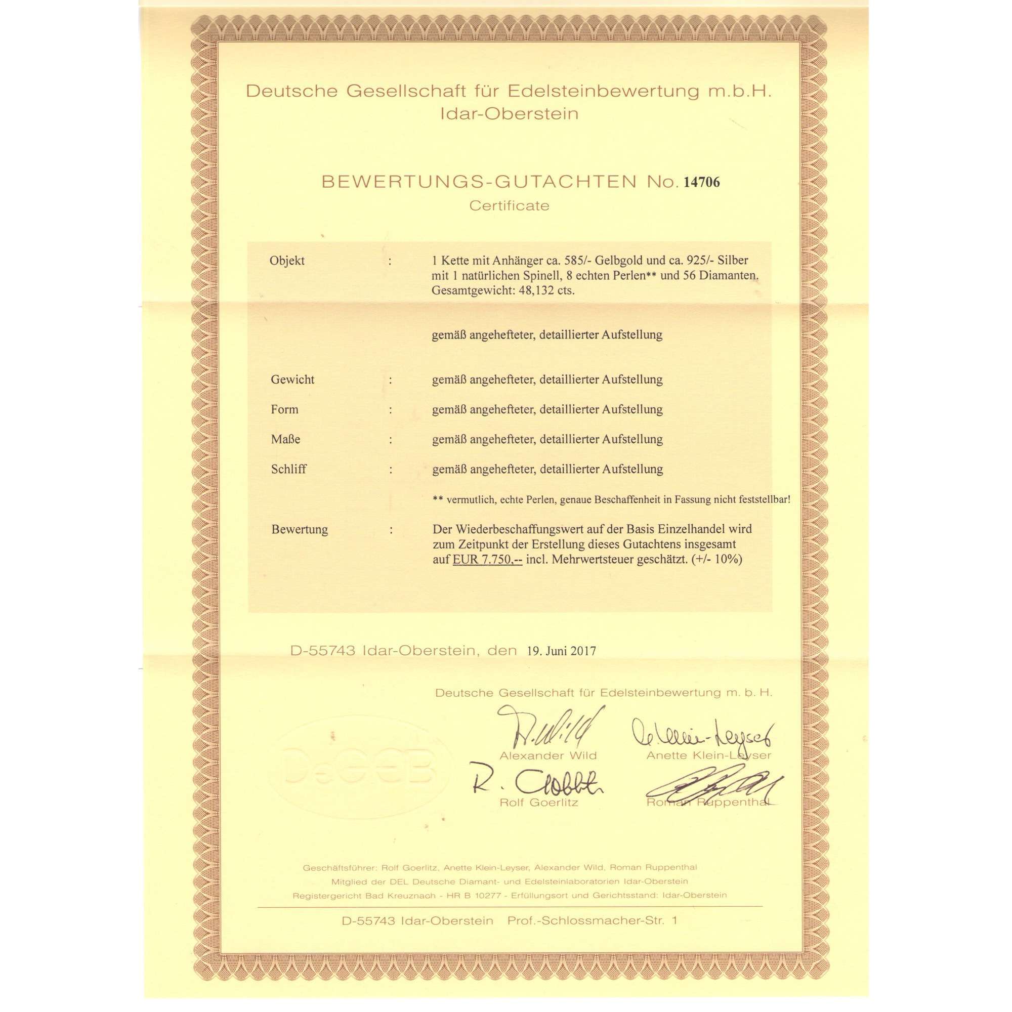Der Anhänger wurde von einem unabhängigen Labor in Idar-Oberstein auf seine Materialeigenschaften und seinen Materialwert untersucht. Das Zertifikat wird selbstverständlich mitgeliefert.