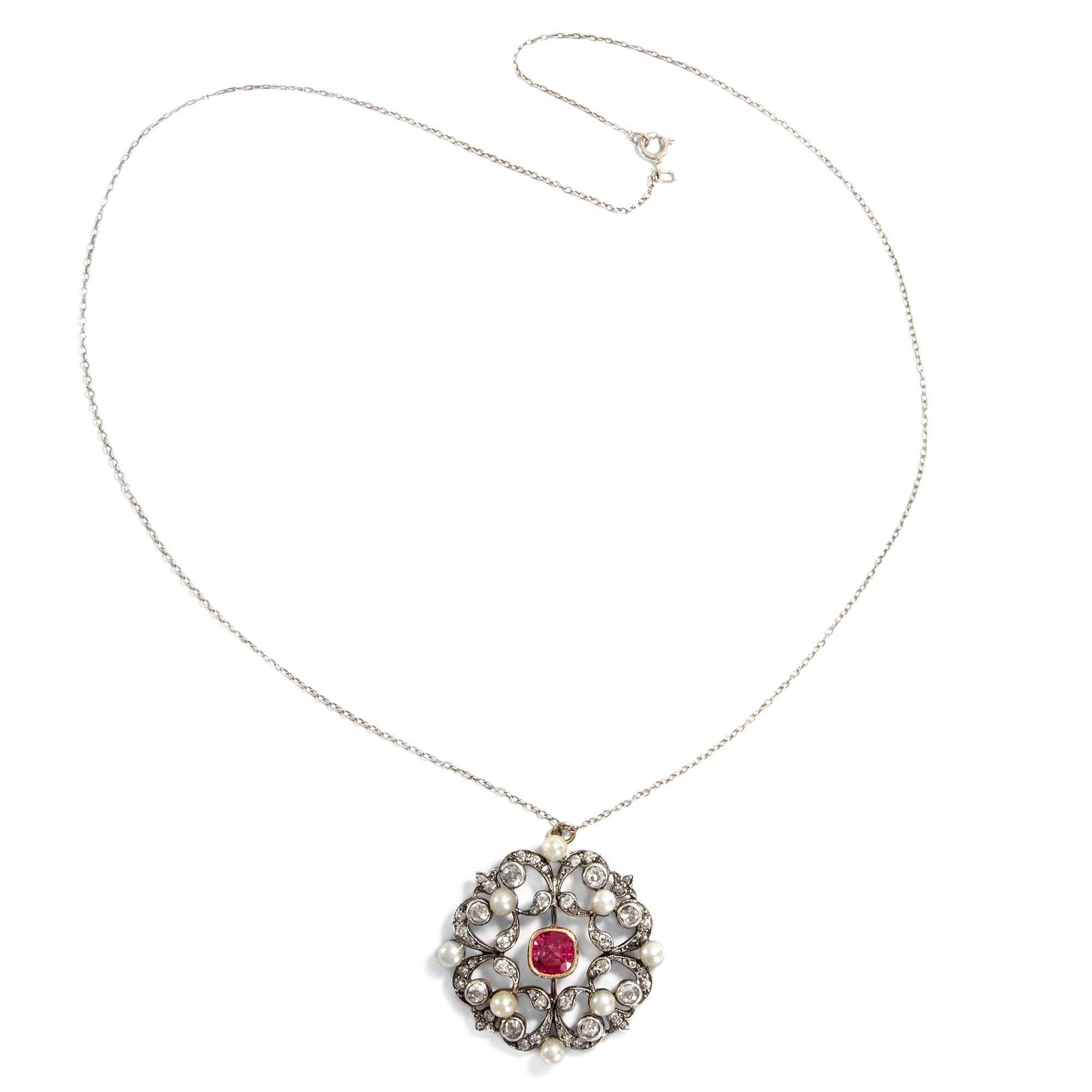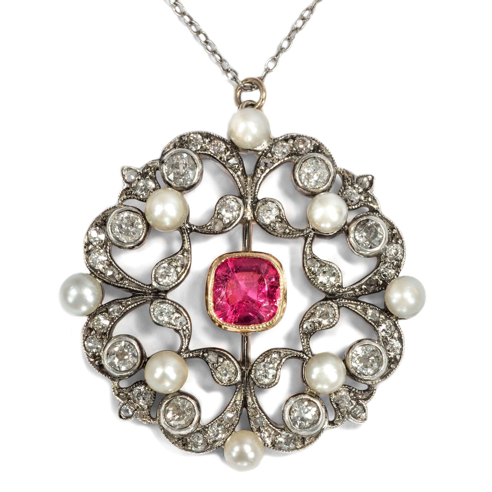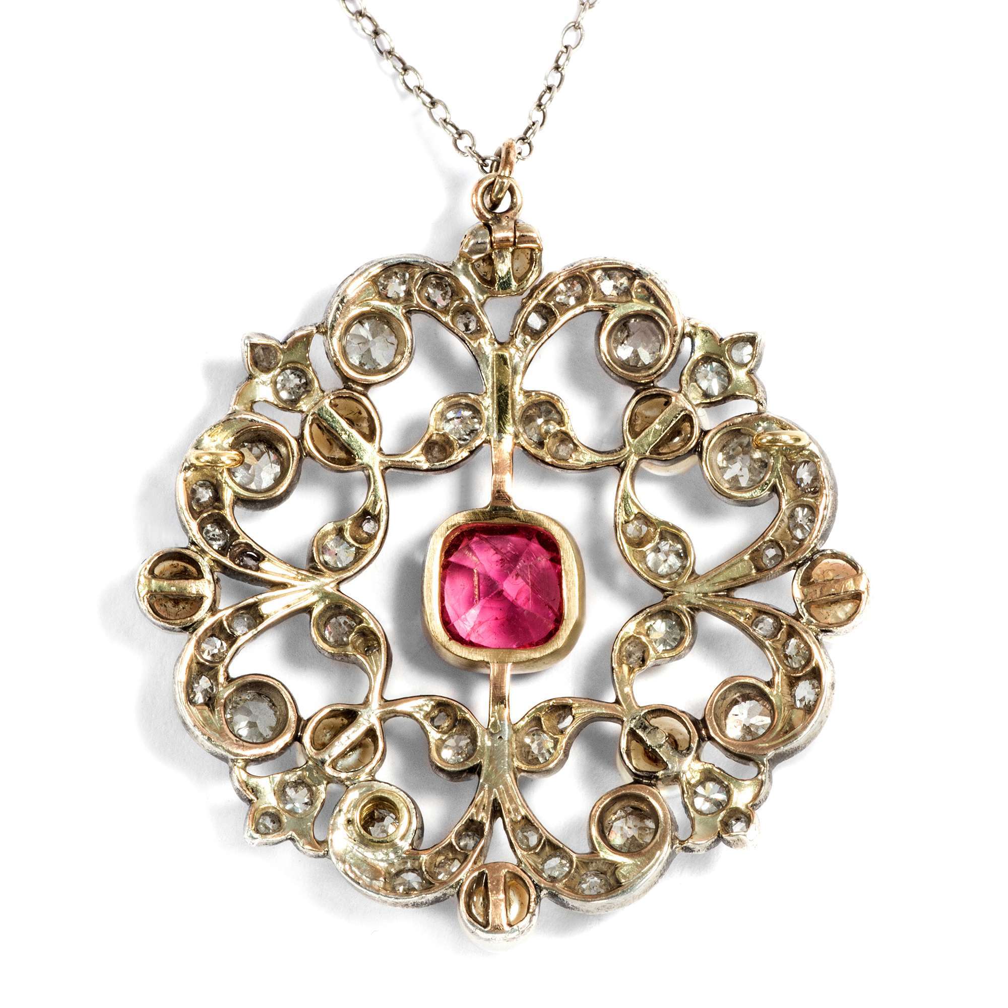 Es ist dieser neue Stil, der das Bild der Belle Époque prägen sollte – und der sich auch hier zeigt: weiß im Licht, hochwertig in der Ausstattung und perfekt verarbeitet. Der Anhänger hat sich mit einer zarten, elegant ausgewählten Silberkette erhalten. Tatsächlich besteht auch die Schauseite des Anhängers aus Silber. Platin oder Weißgold standen in den Jahren um 1890 noch nicht zur Verfügung. Um dennoch weiße Juwelen zu schaffen, nutzte man Silber – stets auf einer Unterkonstruktion aus Gold, wie auch in diesem Fall. So konnte der helle, elegante Eindruck erzeugt werden, den man suchte, ohne dass das Schmuckstück auf Haut oder Kleidung abfärbte.