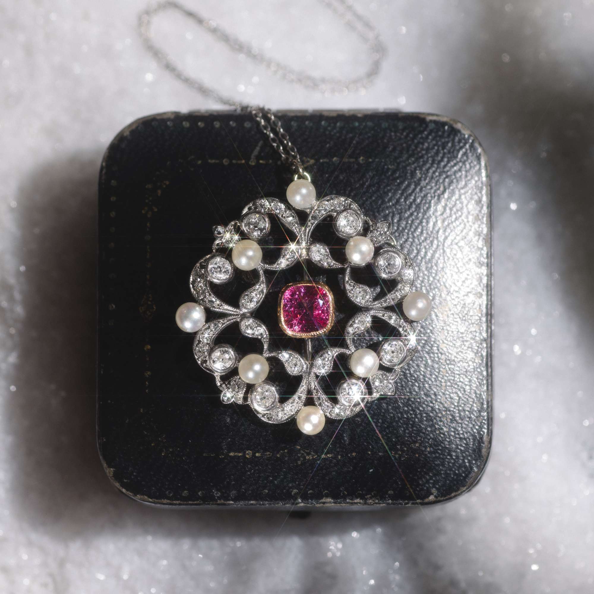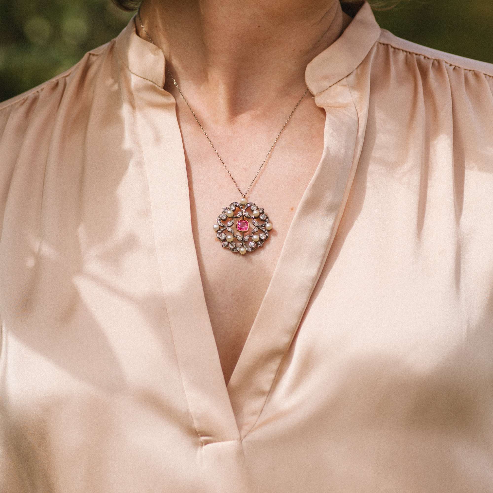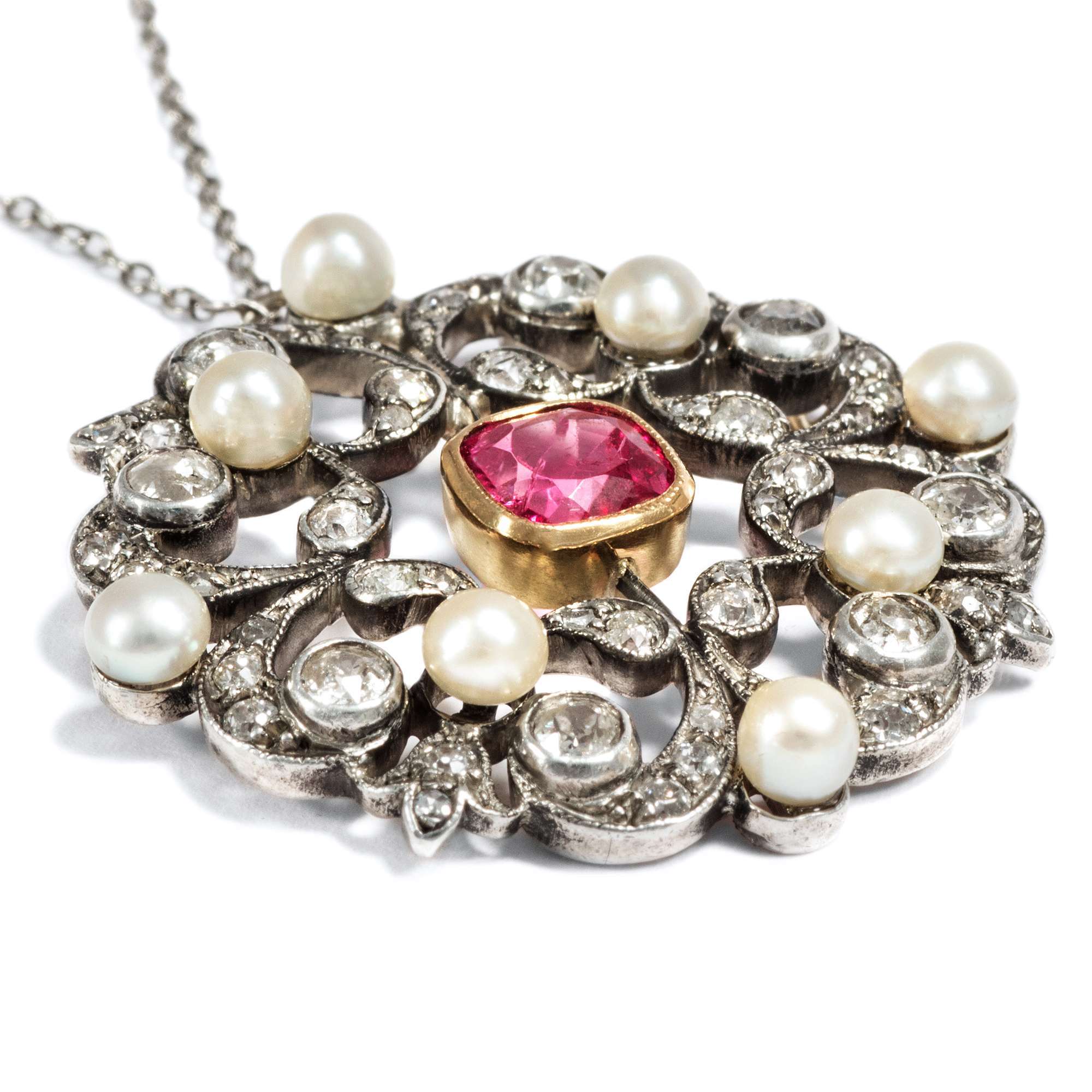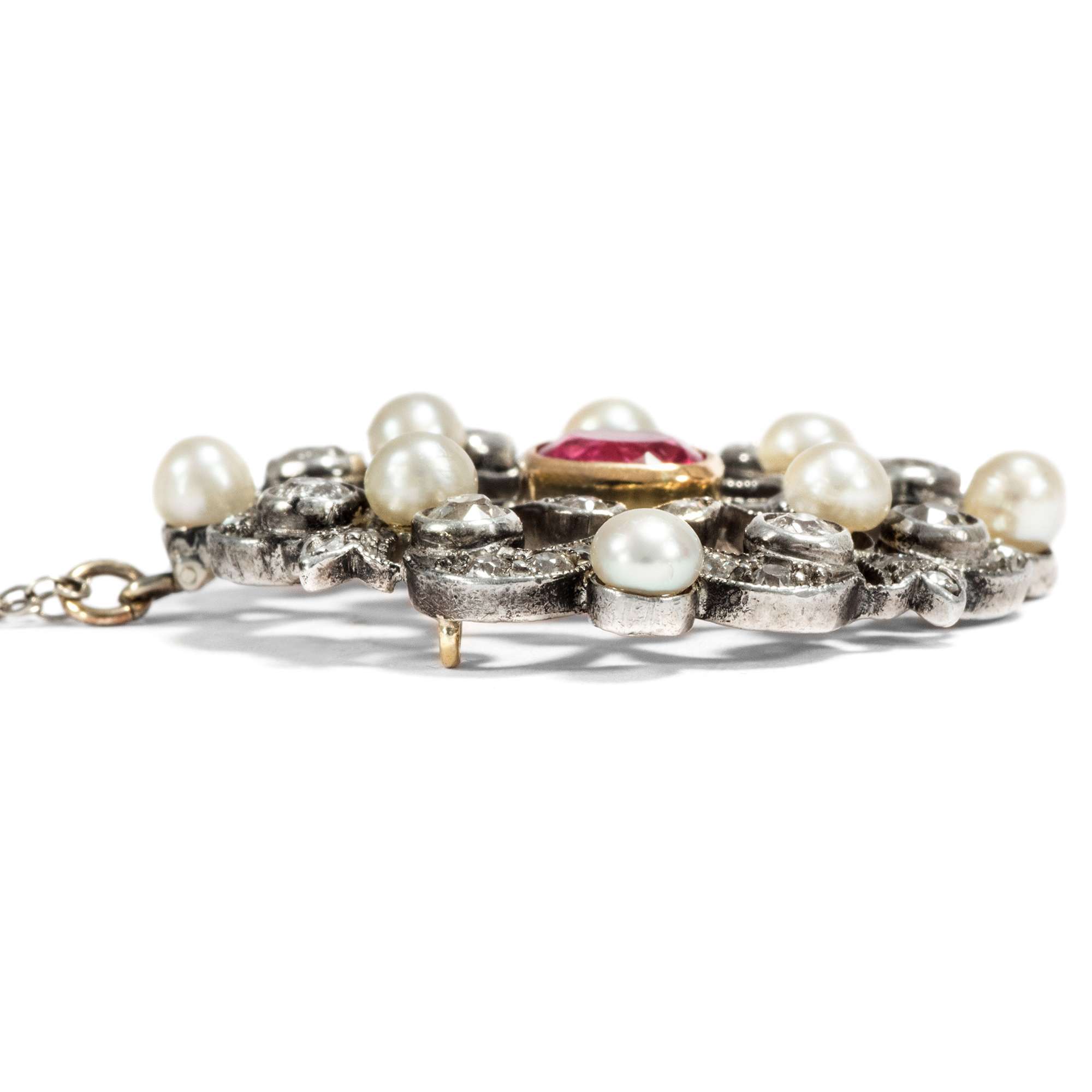Es ist dieser neue Stil, der das Bild der Belle Époque prägen sollte – und der sich auch hier zeigt: weiß im Licht, hochwertig in der Ausstattung und perfekt verarbeitet. Der Anhänger hat sich mit einer zarten, elegant ausgewählten Silberkette erhalten. Tatsächlich besteht auch die Schauseite des Anhängers aus Silber. Platin oder Weißgold standen in den Jahren um 1890 noch nicht zur Verfügung. Um dennoch weiße Juwelen zu schaffen, nutzte man Silber – stets auf einer Unterkonstruktion aus Gold, wie auch in diesem Fall. So konnte der helle, elegante Eindruck erzeugt werden, den man suchte, ohne dass das Schmuckstück auf Haut oder Kleidung abfärbte.