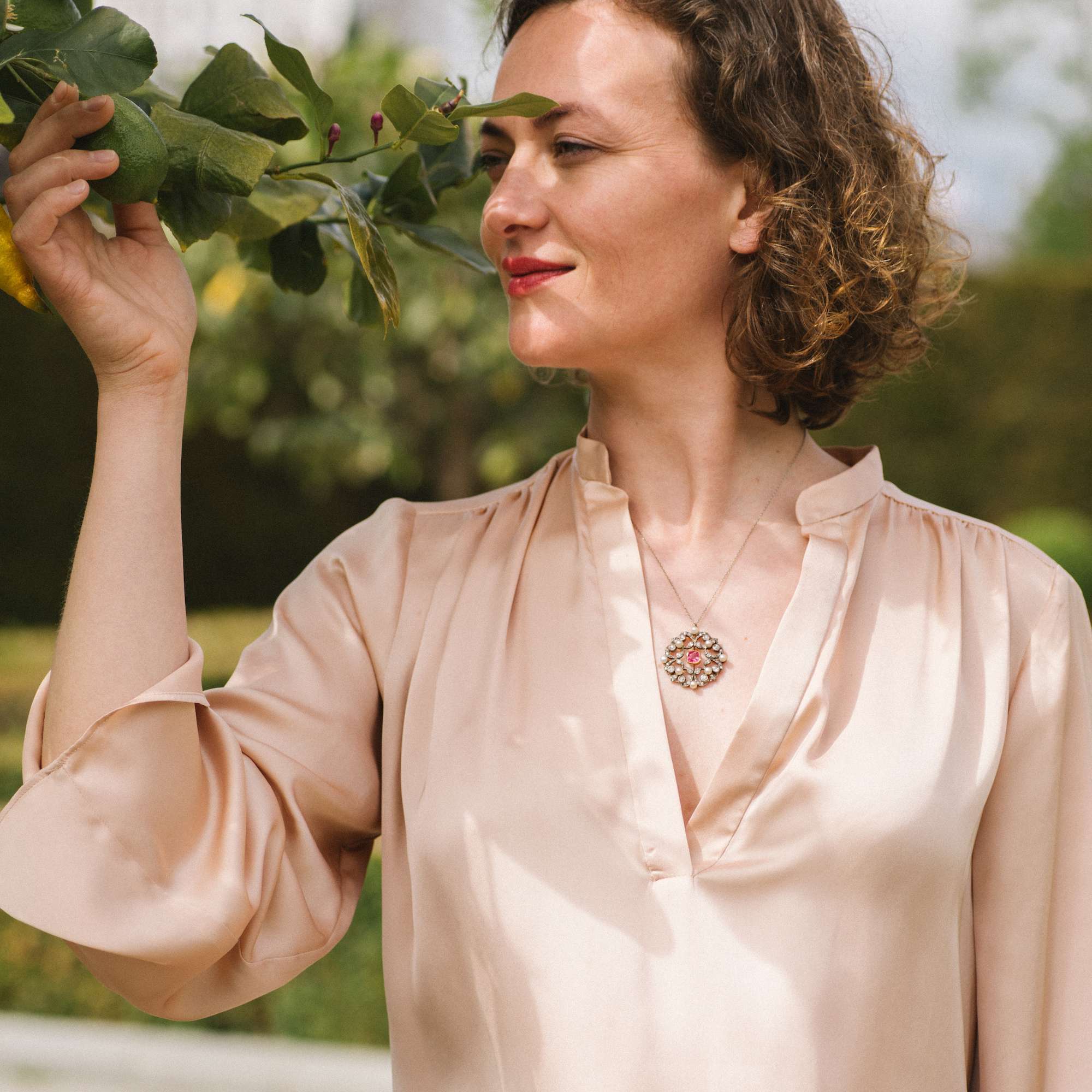 Natürlich fanden auch ausgewählte Farbsteine in den neuen Kreationen ihren Platz – so wie im hier vorliegenden Anhänger: ein erstklassiger, großer pinkfarbener Spinell, der an üppig blühende Rosen denken lässt. Der in Kissenform geschliffene Stein leuchtet intensiv in seiner zarten Fassung aus Gold. Feine Stege – sogenannte Messerdrahtstege – halten ihn an seinem Platz, eingefasst von einer breiten Rahmung aus diamantenen Blättern, reich besetzt mit Perlen.