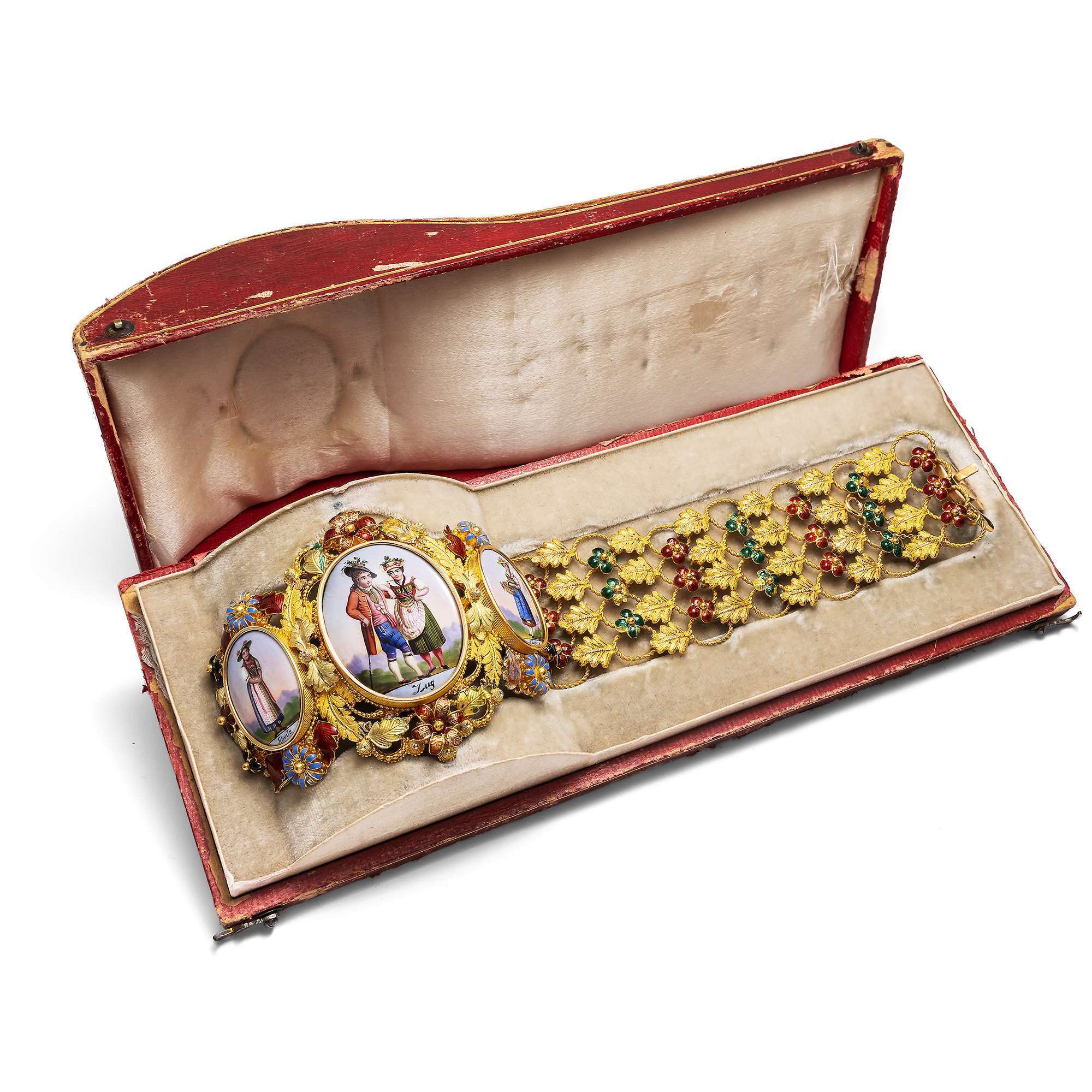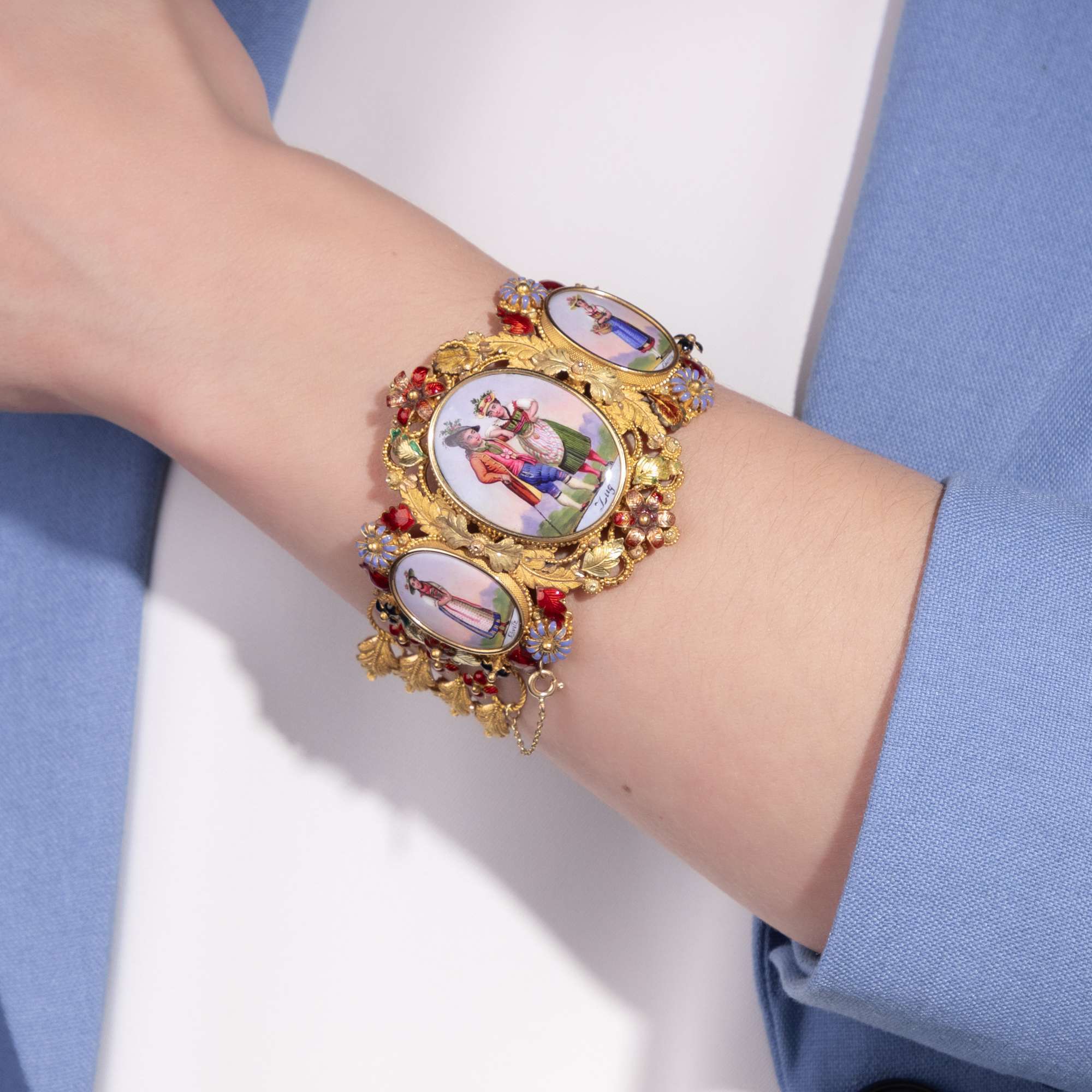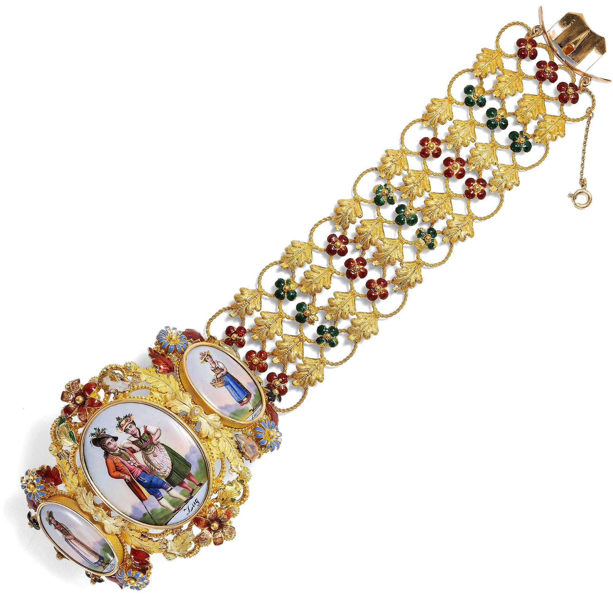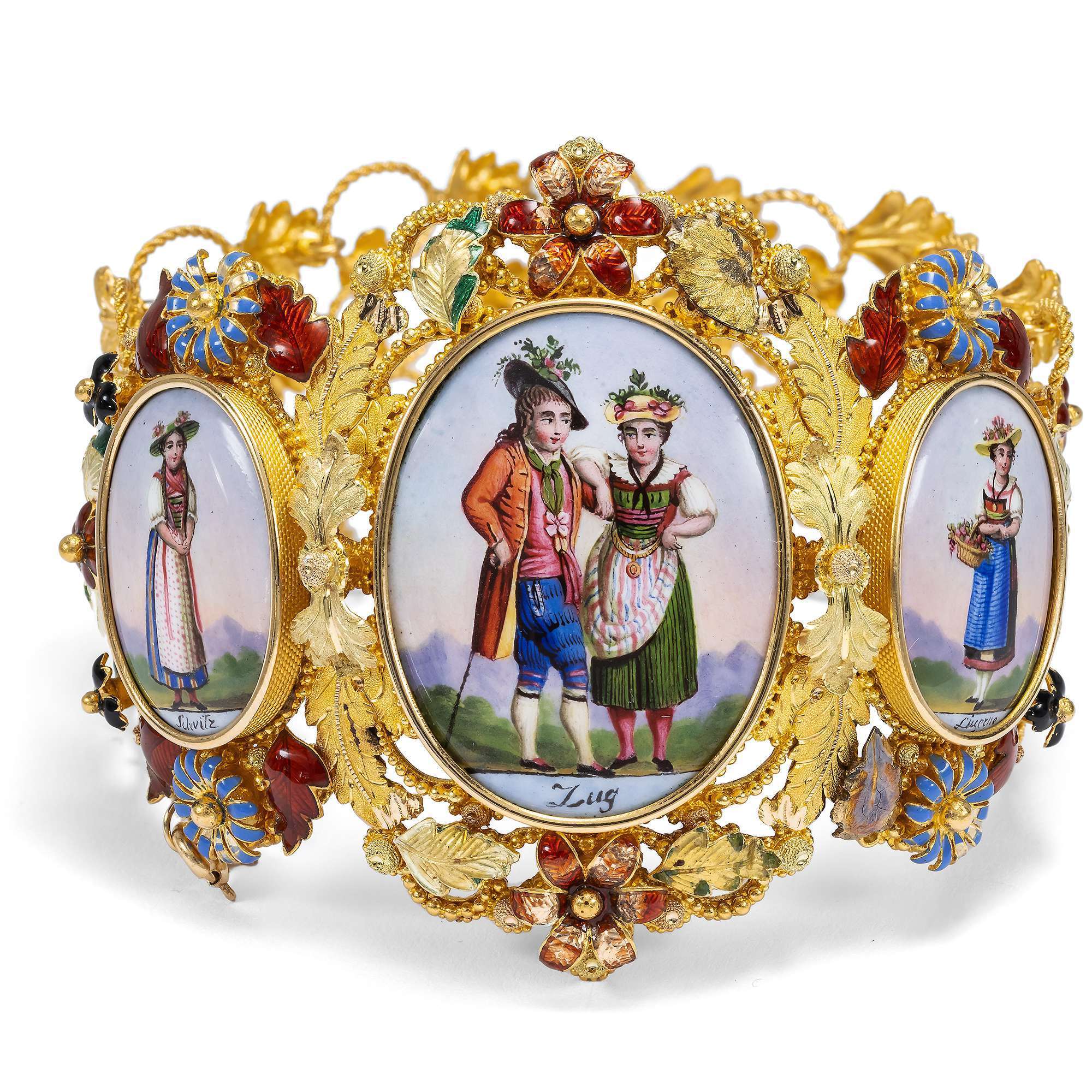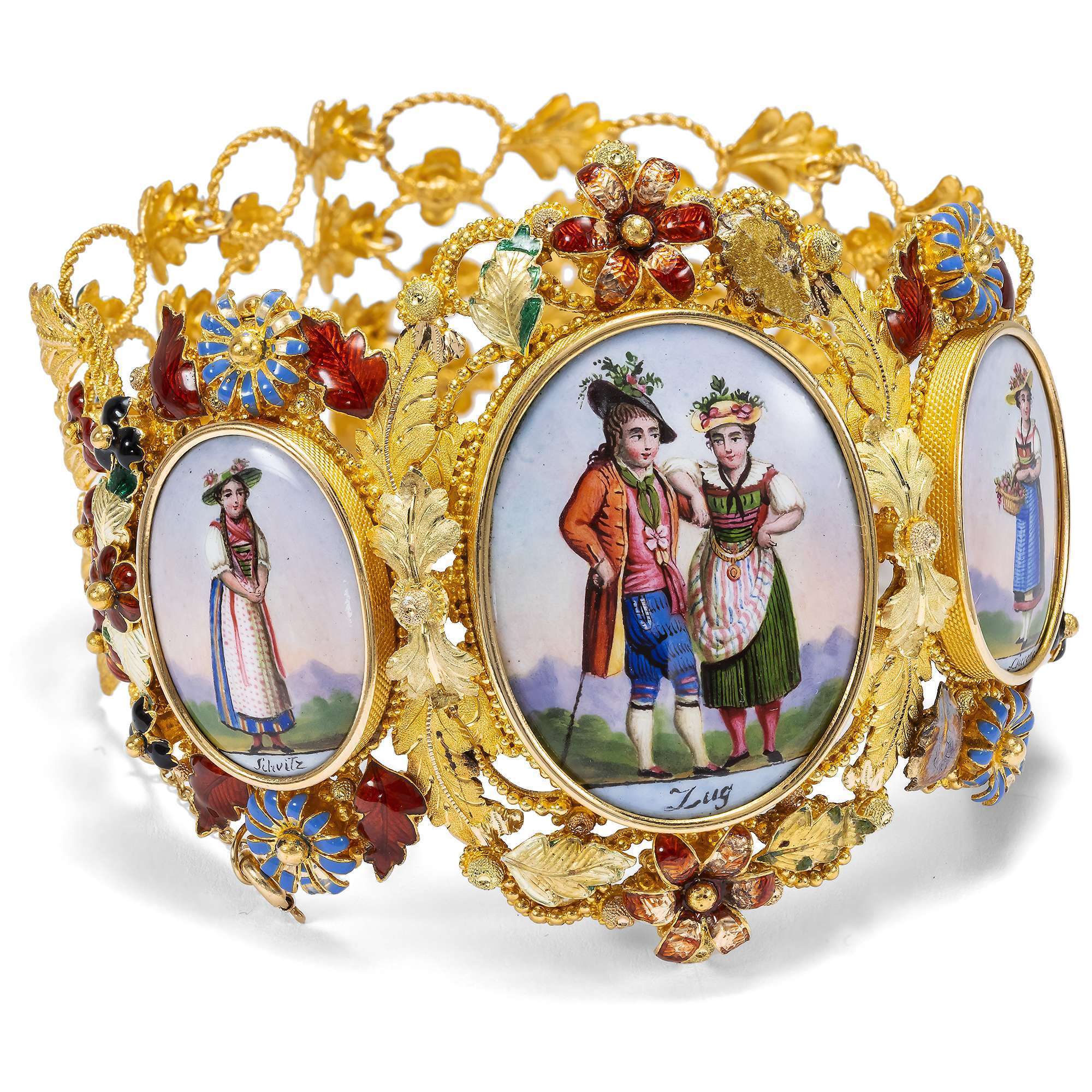 Das hier vorliegende Armband ist so ein Schweizer Erinnerungsschmuckstück, wenngleich von so reicher Ausstattung und wunderbarer Qualität, dass es wohl nur wenige der damaligen Reisenden erstehen konnten. Die große Prunkschließe präsentiert gleich drei Szenen. In der Mitte ist ein Paar in der Tracht des Kantons Zug dargestellt. Links daneben eine Dame aus dem Kanton Schwyz. Rechts ein Mädchen aus Luzern. Alle Szenen zeigen die Dargestellten stark vergrößert am Ufer eines Sees, unter einem glühenden Himmel und vor einer Bergkette: Es ist die Rigi, die imposant über dem Zuger See thront, an den alle drei Kantone grenzen.