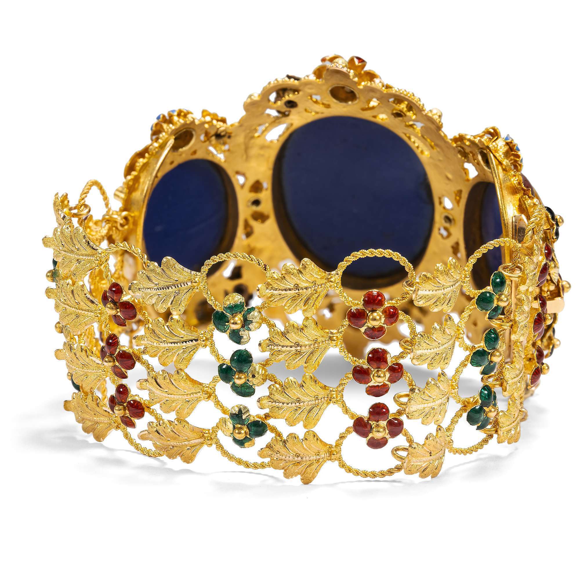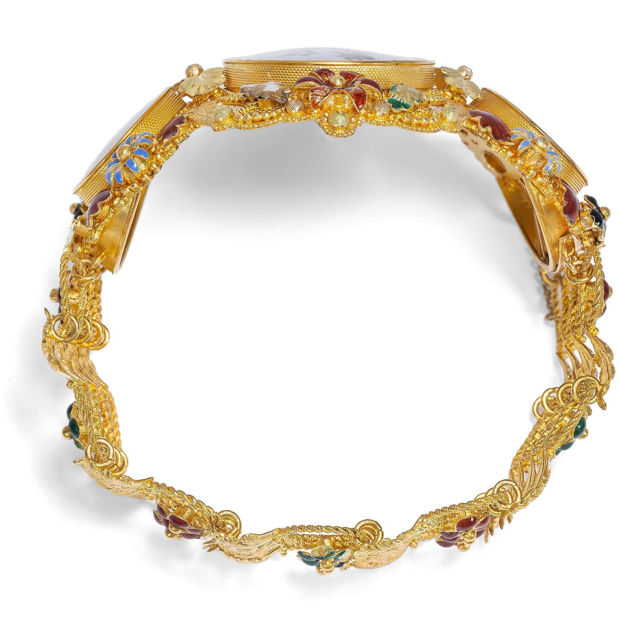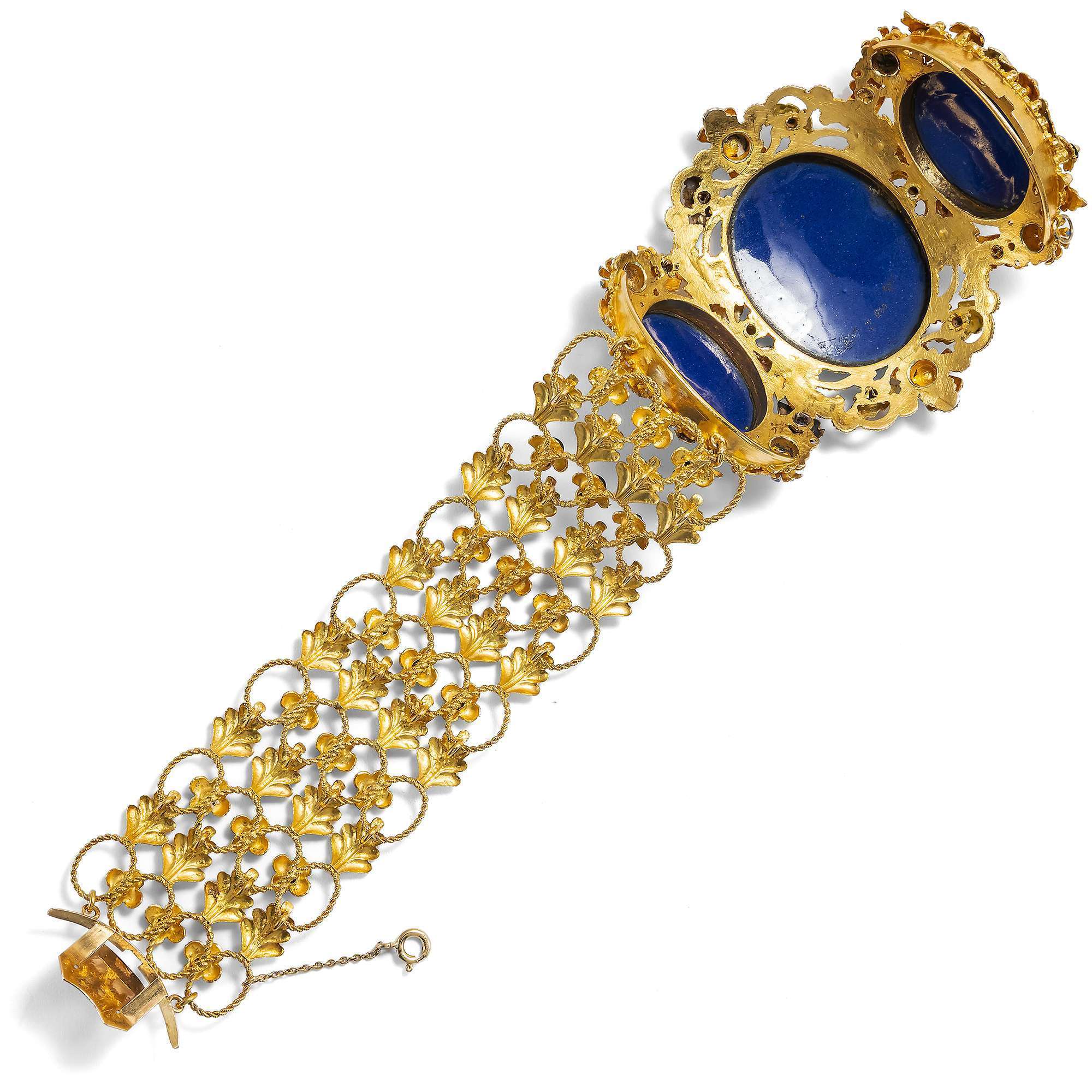 Die mit feinsten Details gemalten Szenen werden von einer Rahmung in Gelbgold mit bunten Emaillierungen gefasst. Blumen, Blätter und elegante Schwünge beleben jeden Teil der Oberfläche der Schließe. Die Blätter zwischen den drei Szenen sind zudem aus leicht grünlichem bzw. rötlichem Gold gefertigt, was die Arbeit noch einmal reicher wirken lässt. Das eigentliche Armband besteht dann aus vier Reihen Blättern mit bunten Blüten dazwischen.