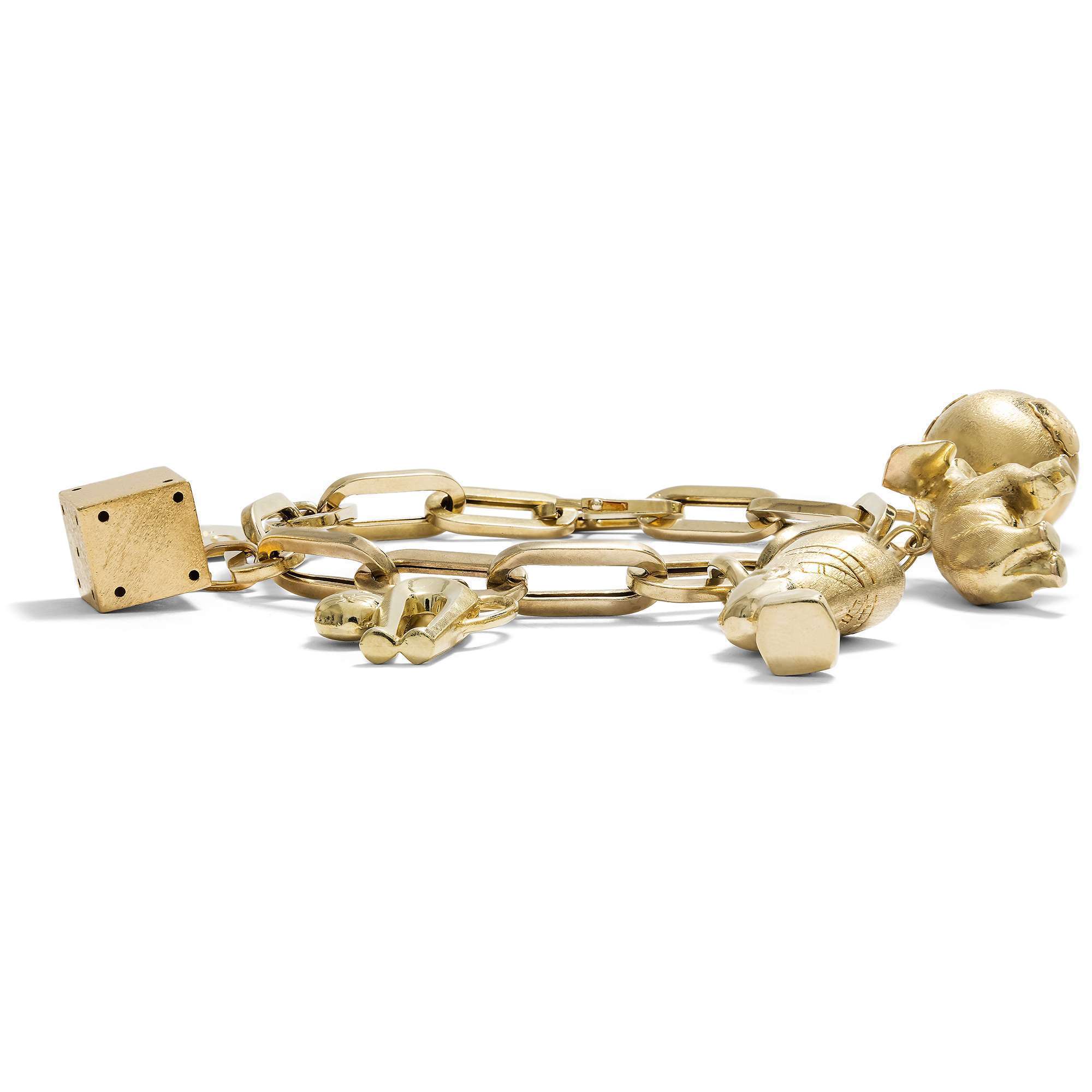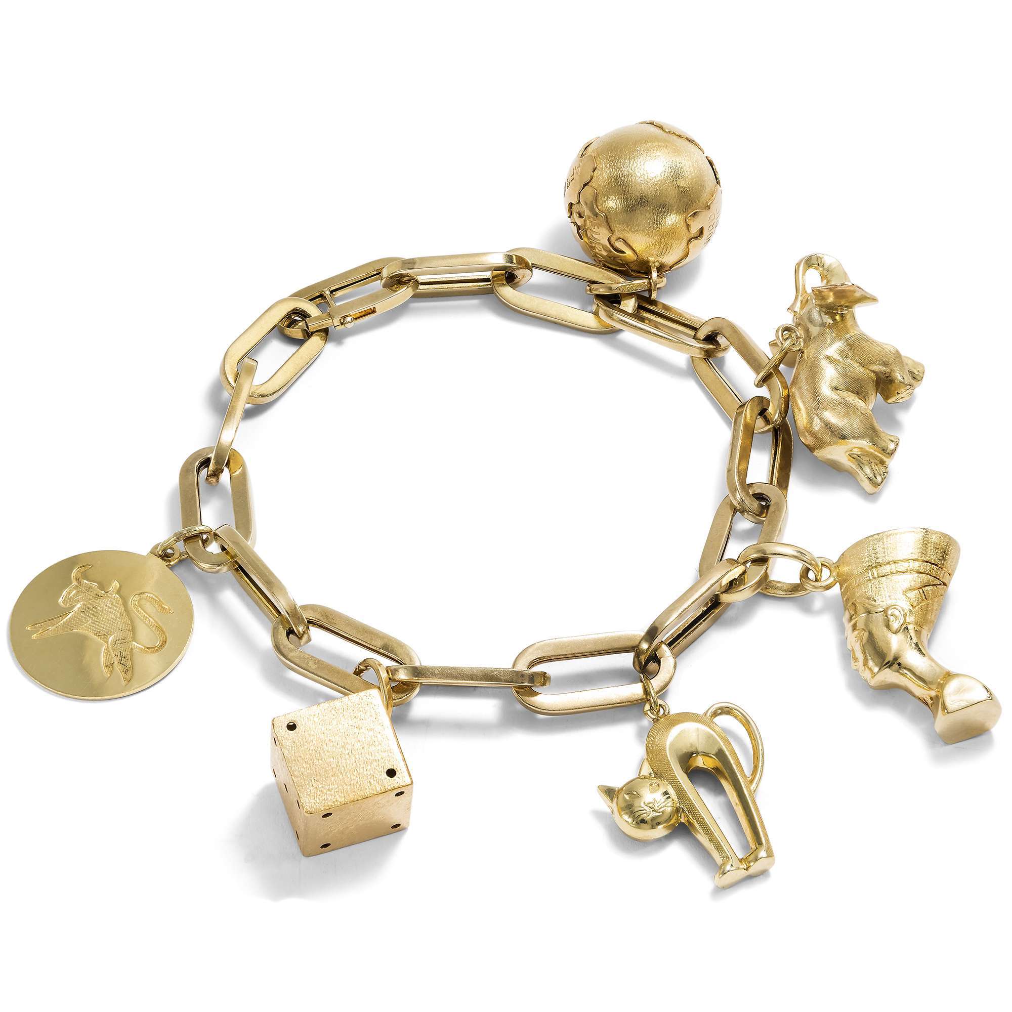 Die sechs kleinen Glücksbringer des hier vorliegenden, kostbaren Armbandes sind ganz verschiedenartiger Natur. Allesamt aus Gold hergestellt und an eine Ankerkette aus Gold gelegt, finden wir eine reiche Fülle von Motiven. So finden sich eine Weltkugel, ein Eelefant, die Büste der Nofretete, eine Katze, ein Würfel sowie eine runde Plakette mit dem Sternzeichen Stier.