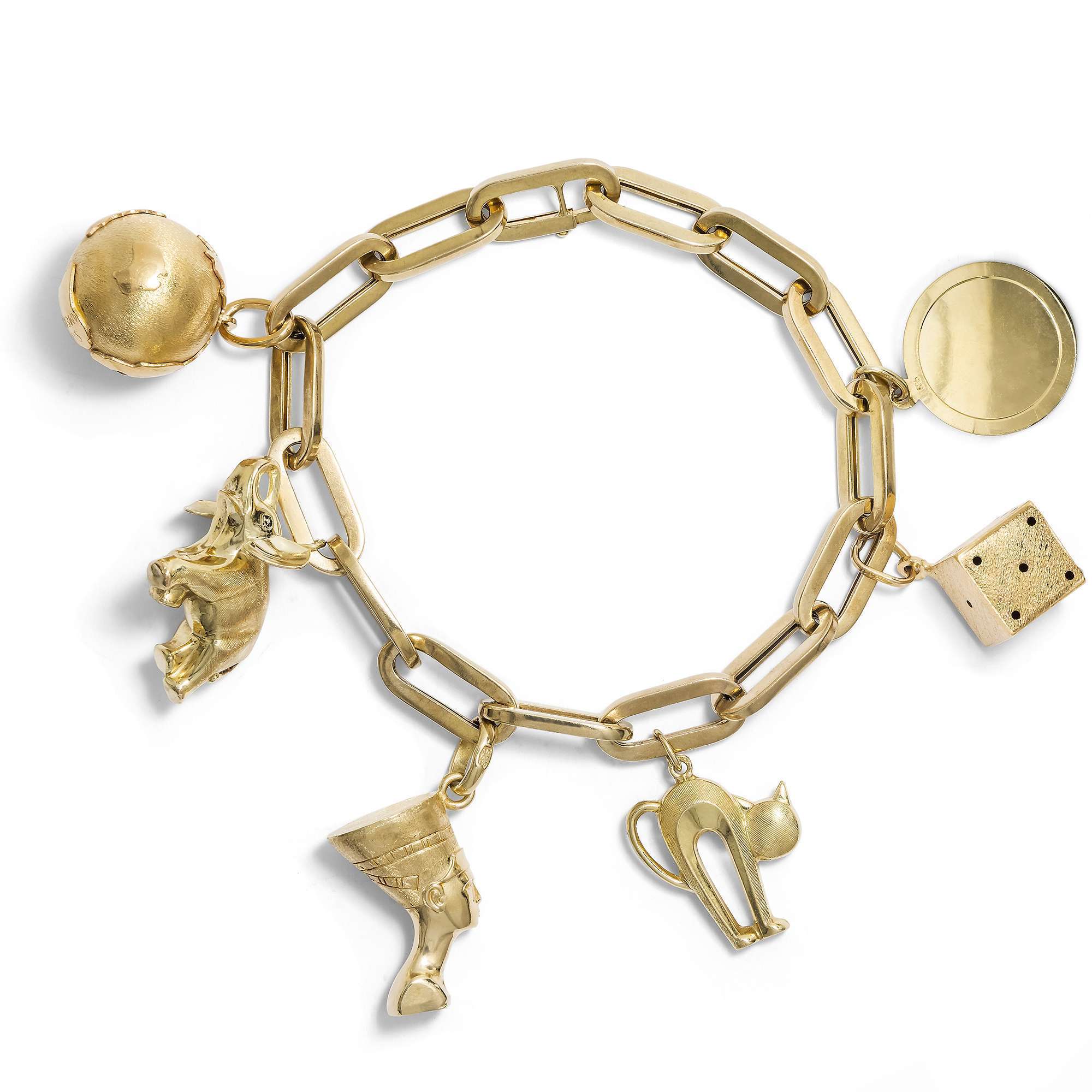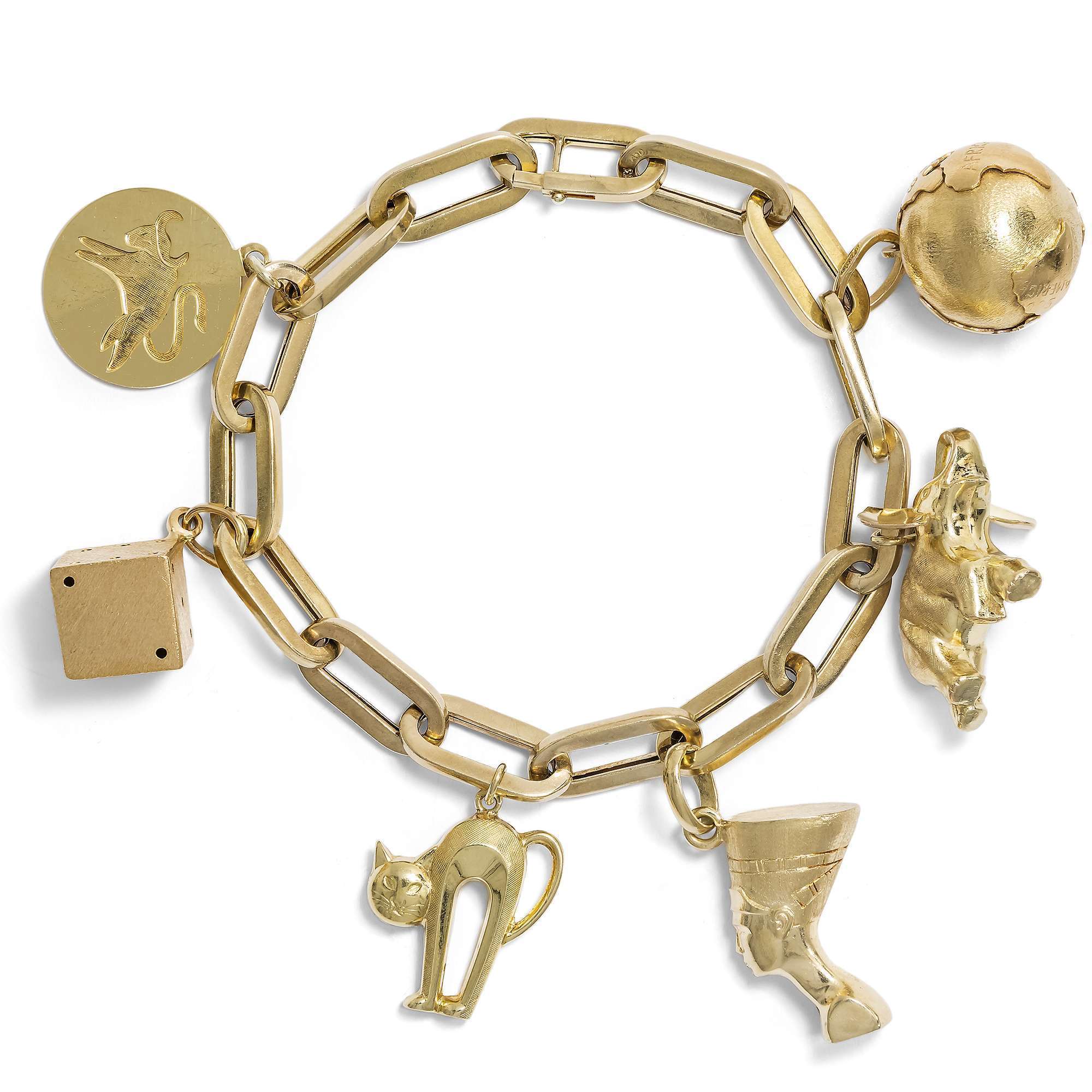 Das Armband selbst besteht aus 14-karätigem Gold und die Anhänger datieren in die Jahre um 1960. Das Schmuckstück fand hier in Berlin zu uns.
