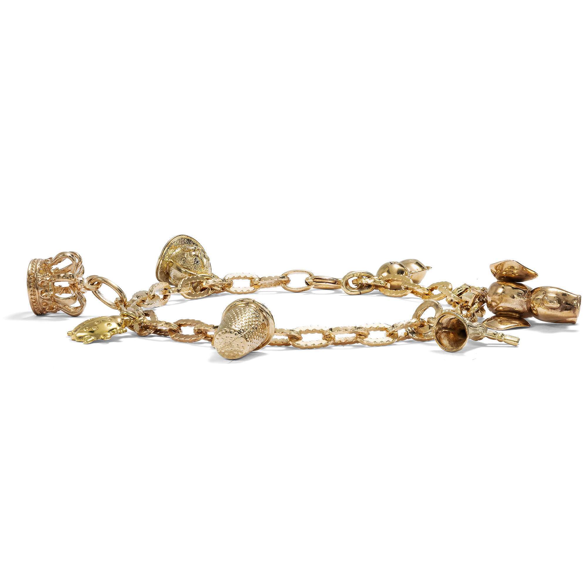 Dieses charmante Bettelarmband aus den 1960er Jahren ist ein individuell zusammengestelltes Schmuckstück. Das fein gearbeitete Gliederarmband aus Gold trägt acht detailreiche Anhänger mit ganz unterschiedlichen Motiven.