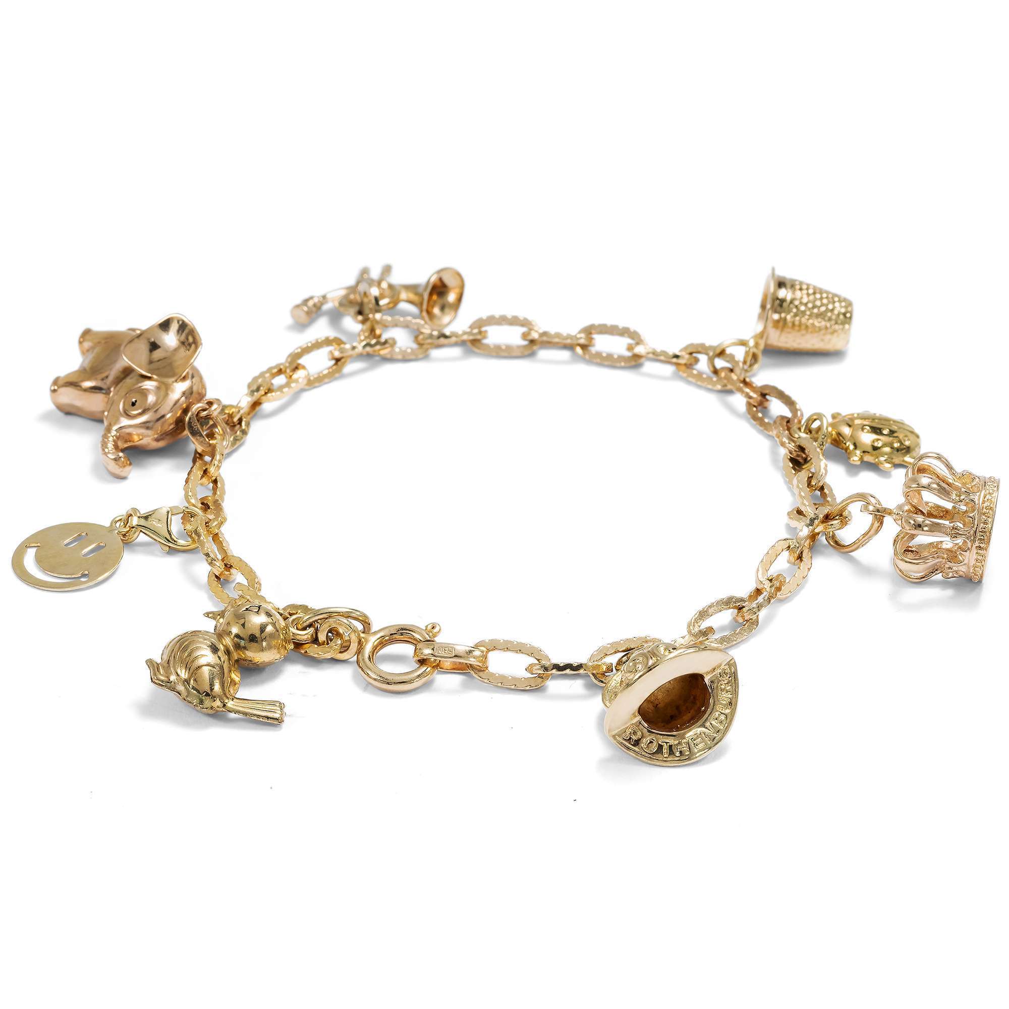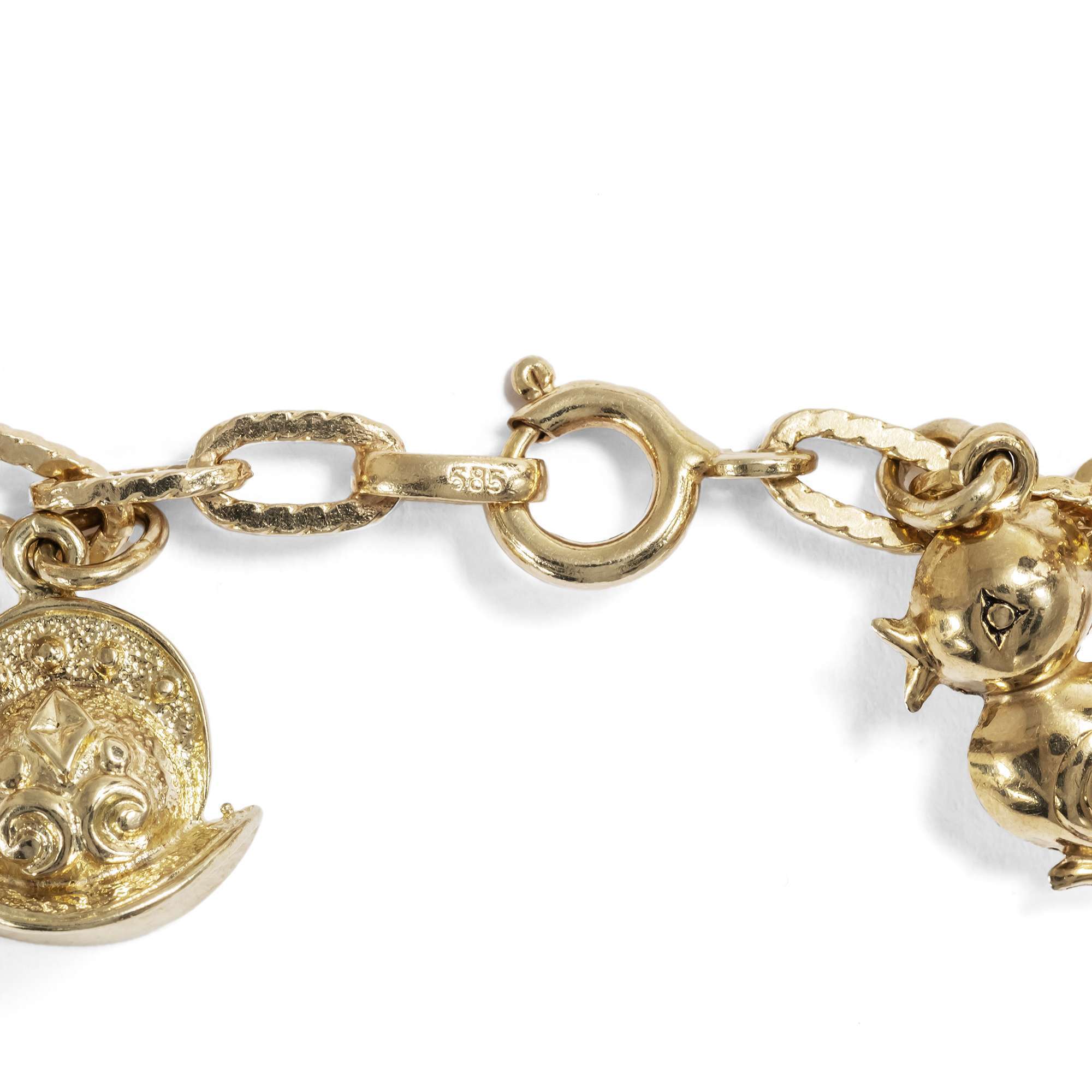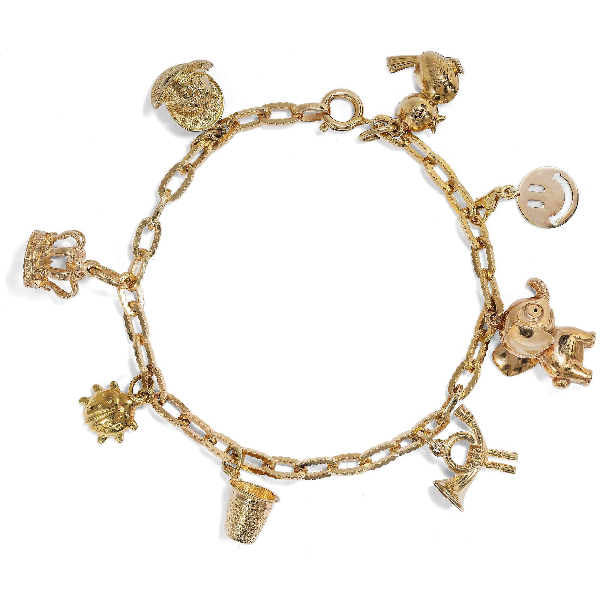 Witziges Bettelarmband aus Gold mit acht Anhängern, Deutschland um 1965 und später