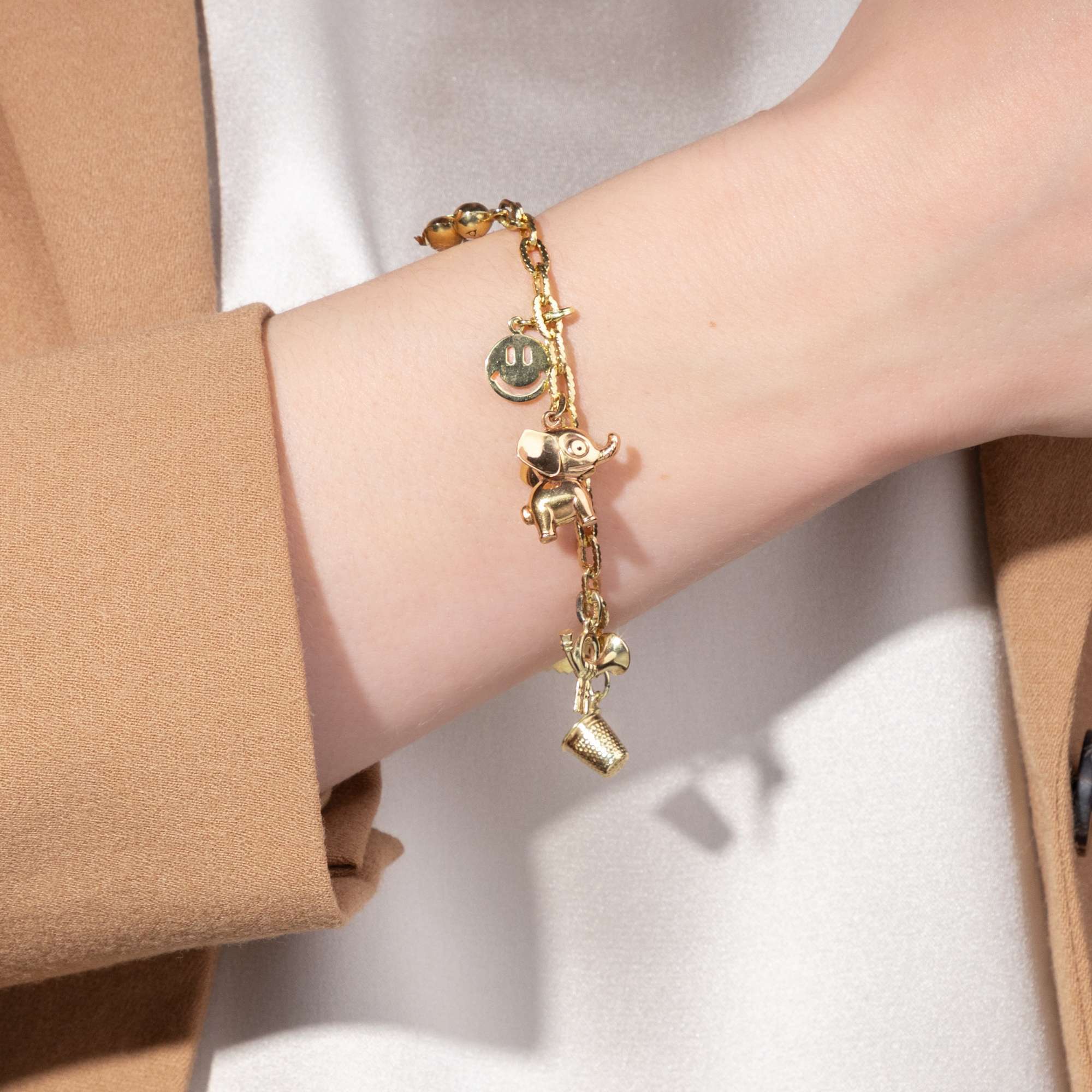 Jeder der kleinen Anhänger erzählt seine eigene Geschichte: eine fröhliche Ente, ein kleiner Elefant, ein Smiley, ein nostalgisches Posthorn, ein Fingerhut, ein glücksbringender Marienkäfer, eine Krone sowie ein Helm mit der Aufschrift „Rothenburg“ – sie ergänzen das verspielte Ensemble in verschiedenen Goldlegierungen. Die feine Verarbeitung und die Vielfalt der Motive spiegeln den Zeitgeist der 1960er Jahre wider, als Bettelarmbänder besonders beliebt waren und oft über Jahre hinweg mit persönlichen Anhängern erweitert wurden.