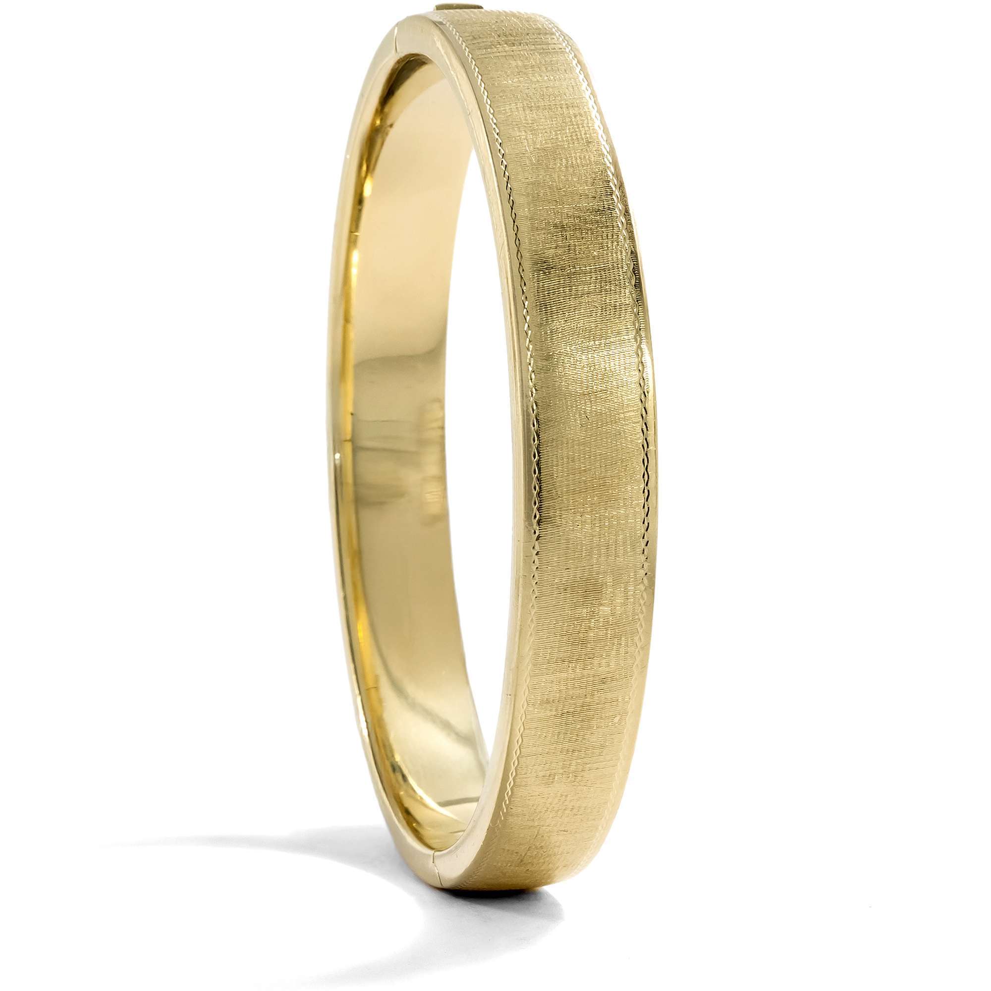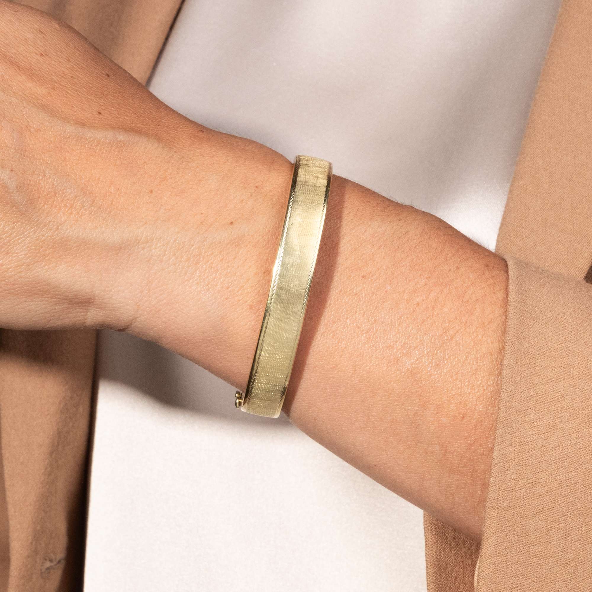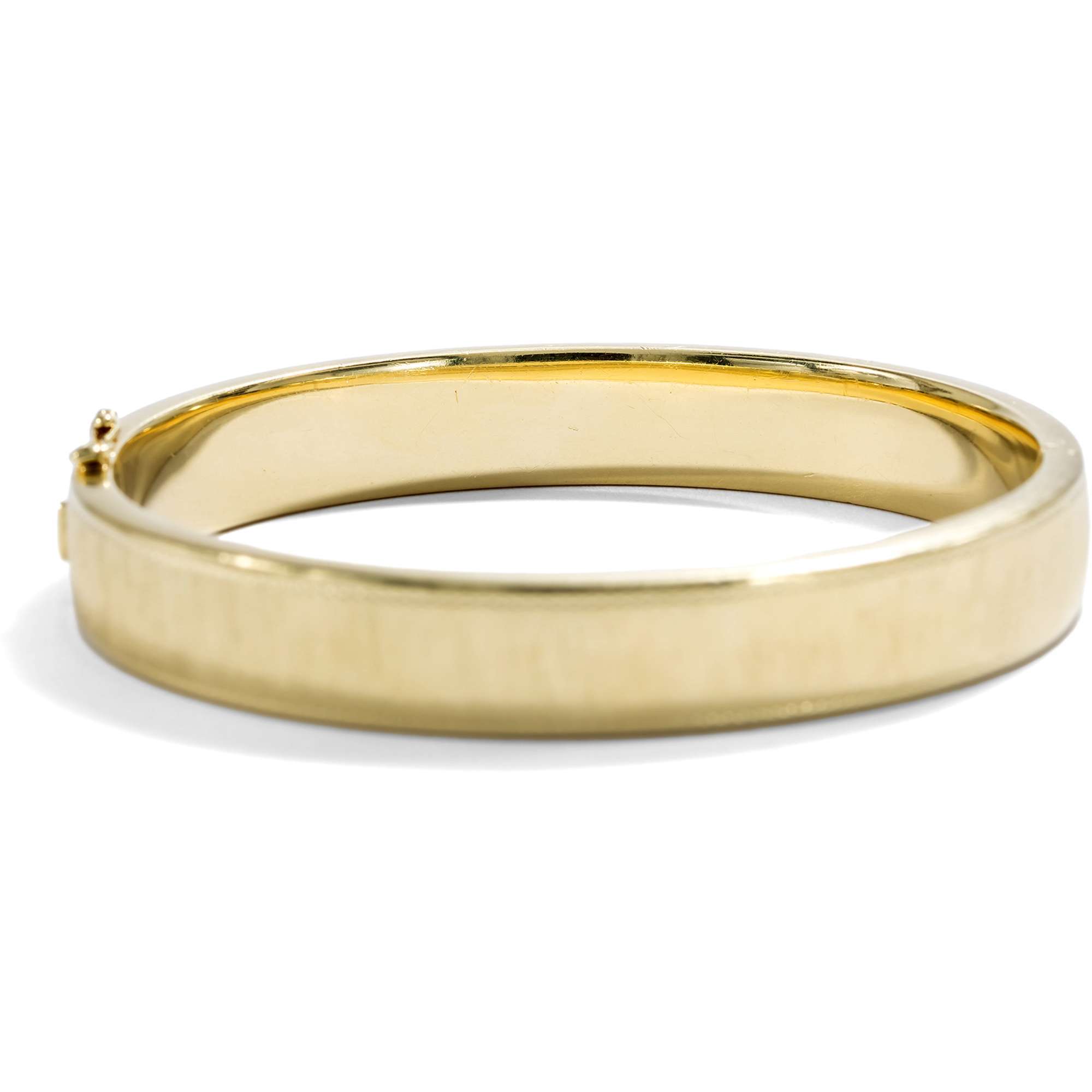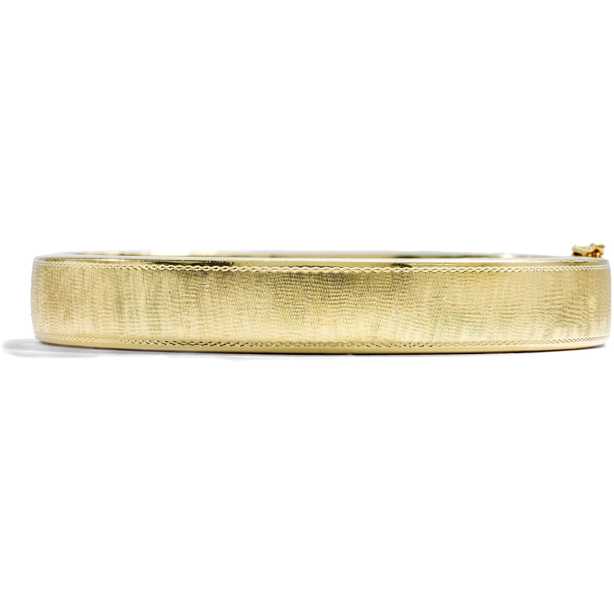 Ein besonders beliebtes Statussymbol dieser Jahre war leuchtender Goldschmuck. In dieser Tradition steht auch der hier vorliegende Armreif aus Gold. Er ist mit rechteckigem Querschnitt entworfen und zeigt auf seiner Oberfläche ein zeittypisches Dekor aus feinen Gravuren. Das seidig matt schimmernde Mittelfeld wird von feinen Wellenlinien gerahmt.