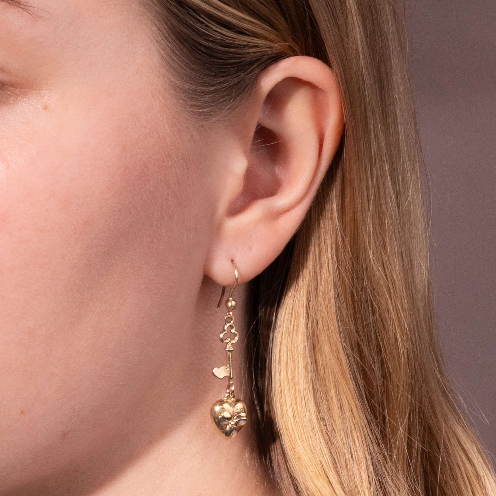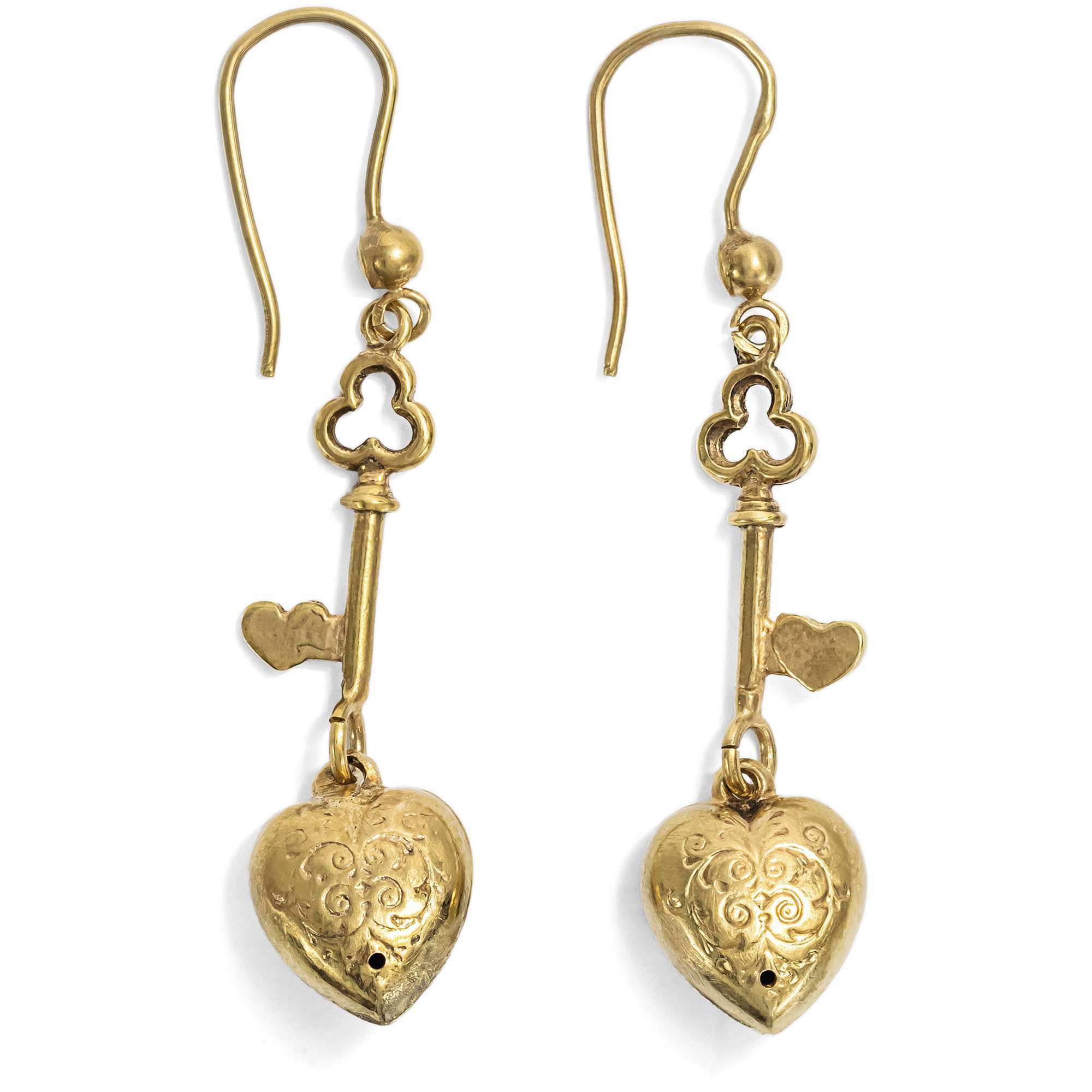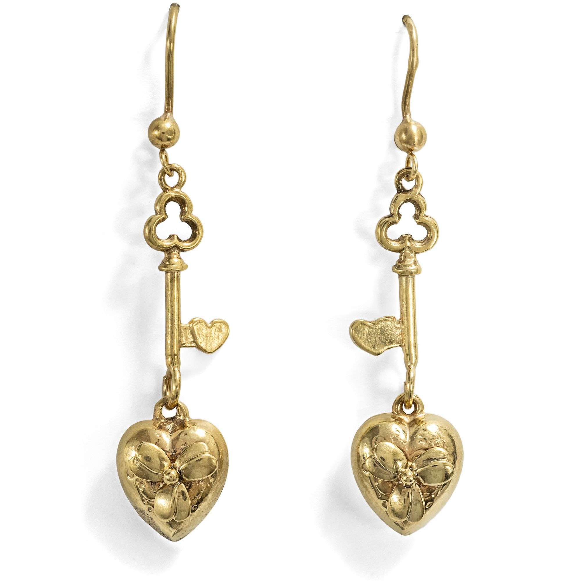 Unter bequem anzulegenden Bügeln befindet sich je ein längliches Zierelement in Form eines niedlichen Schlüssels, dessen Bart die Form eines Herzens hat. Darunter befinden sich zwei weitere sprichwörtliche Herzen aus Gold, die die Blicke auf sich ziehen. Ihre Oberfläche ziert ein appliziertes Kleeblatt, das zudem das Liebesglück versinnbildlicht.