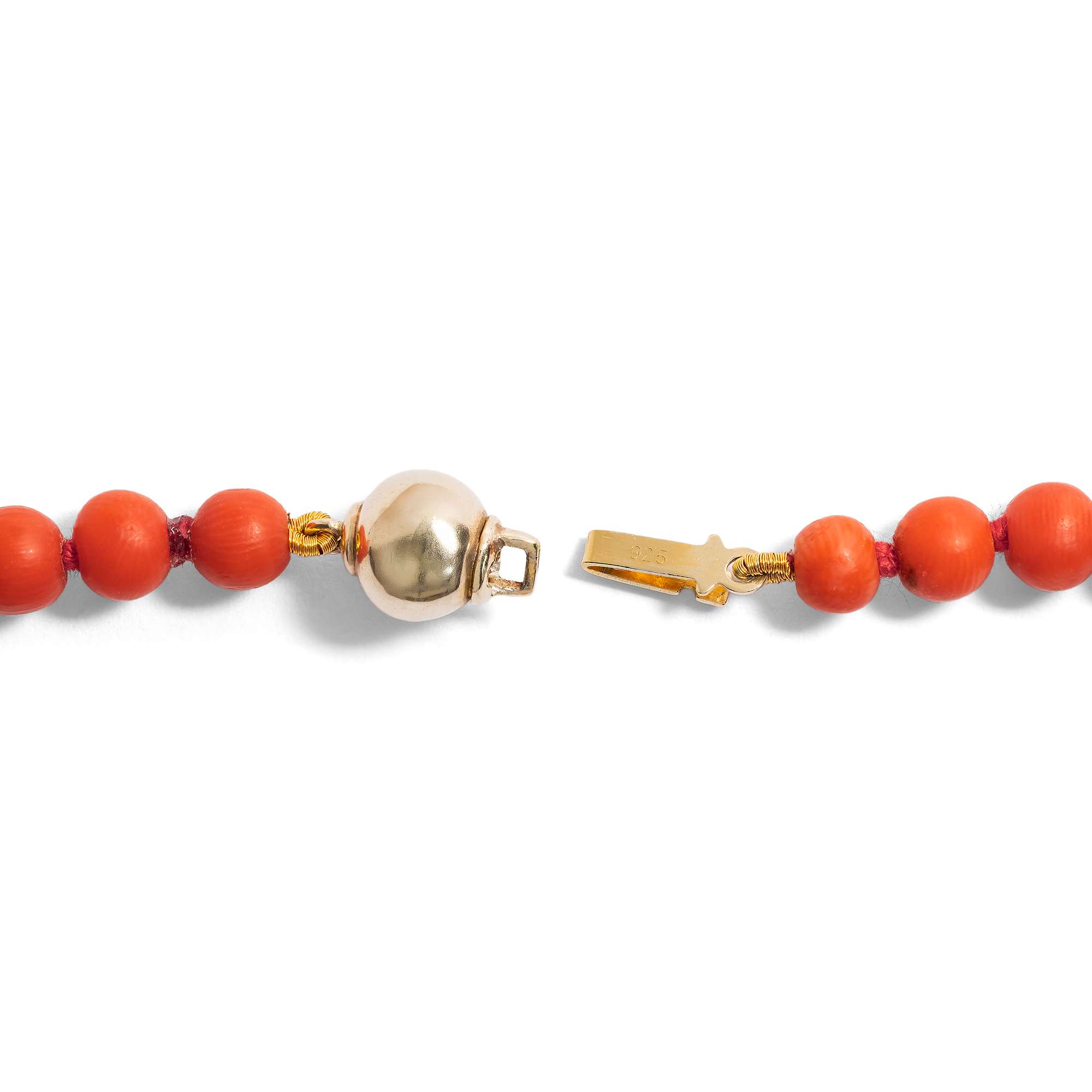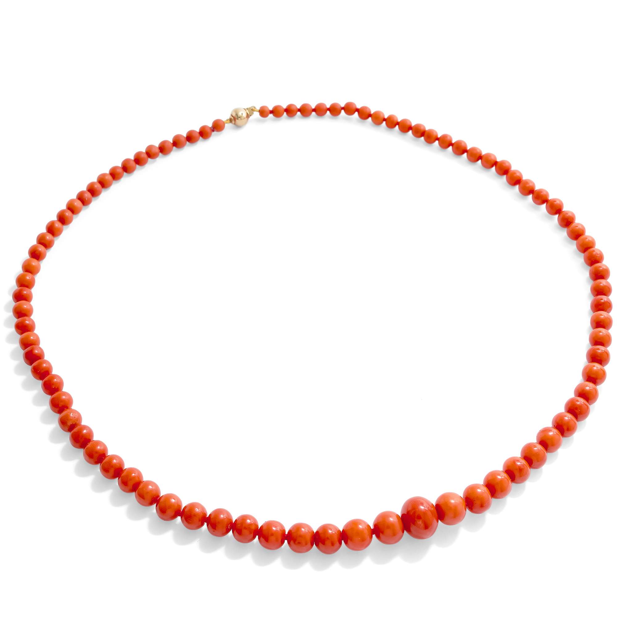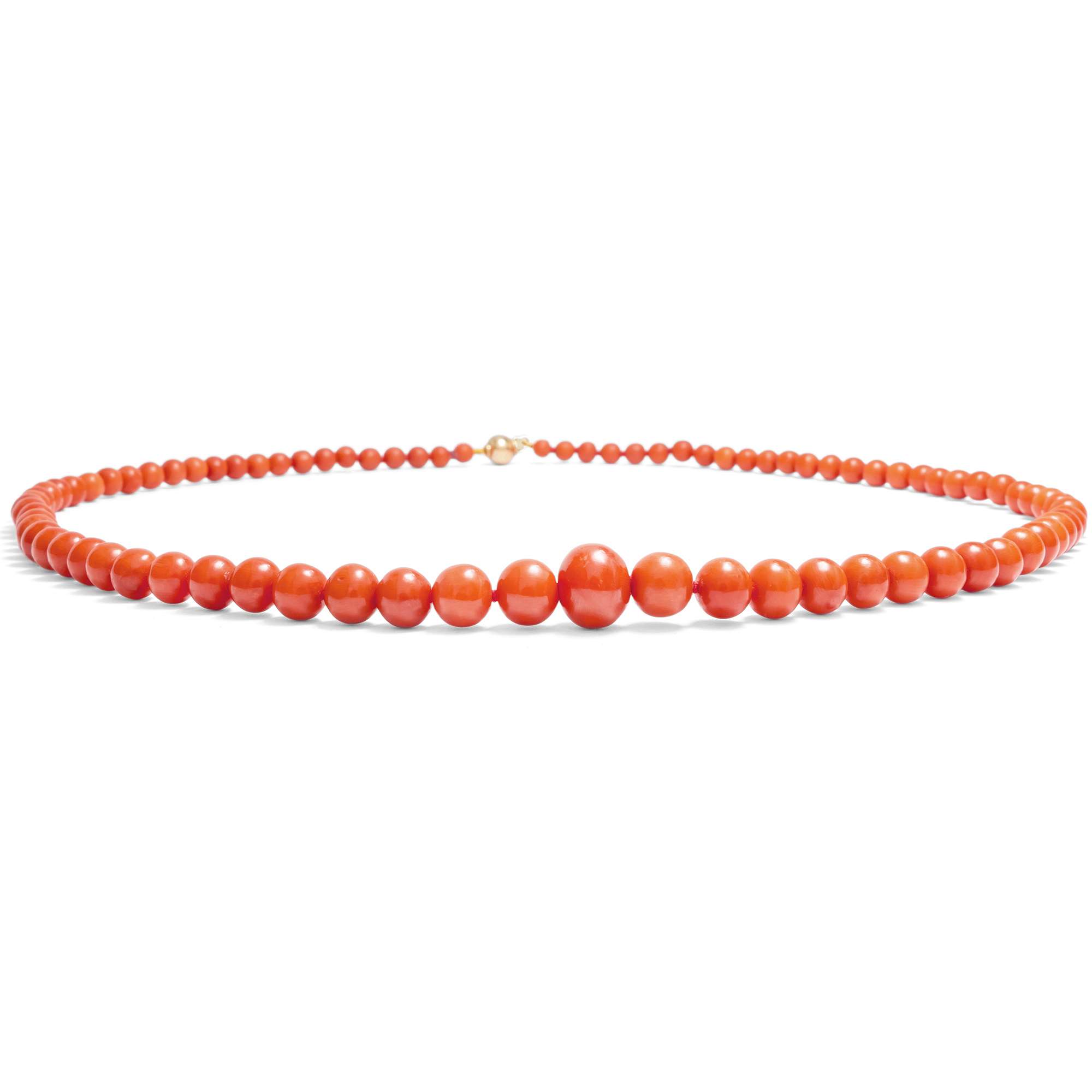 Material: 85 Kugeln aus roter Edelkoralle aus dem Mittelmeer (Corallium Rubrum), 4,6 - 11,2 mm Durchmesser Silber, 925/000, vergoldet