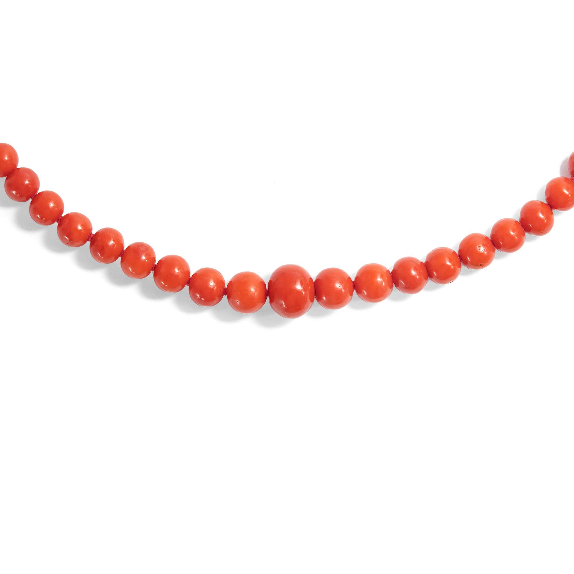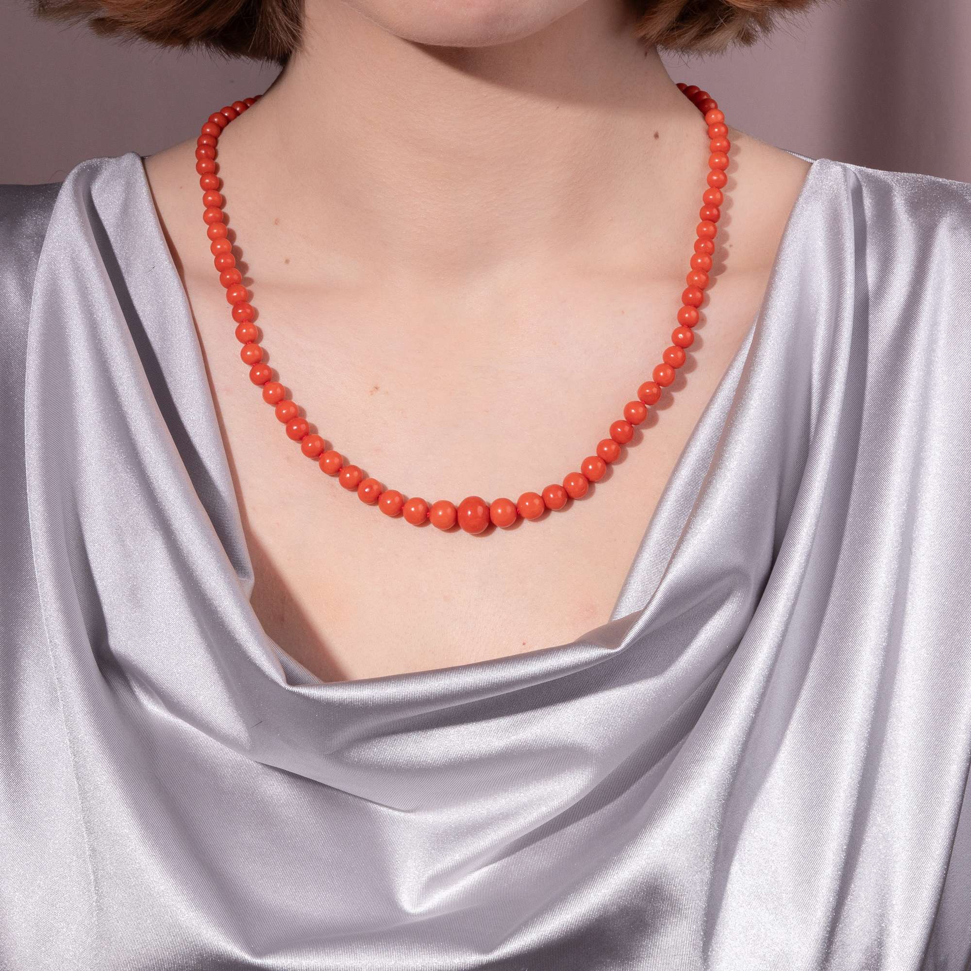 Die Kette der Jahre um 1960 aus besonders schönen, dunkelroten Mittelmeerkorallen besteht aus einem langen Strang perfekt geschliffener Perlen, die einzeln geknotet aufgezogen sind. Die großen, runden Korallen haben eine besonders einheitliche Farbe und sind im Verlauf aufgereiht.