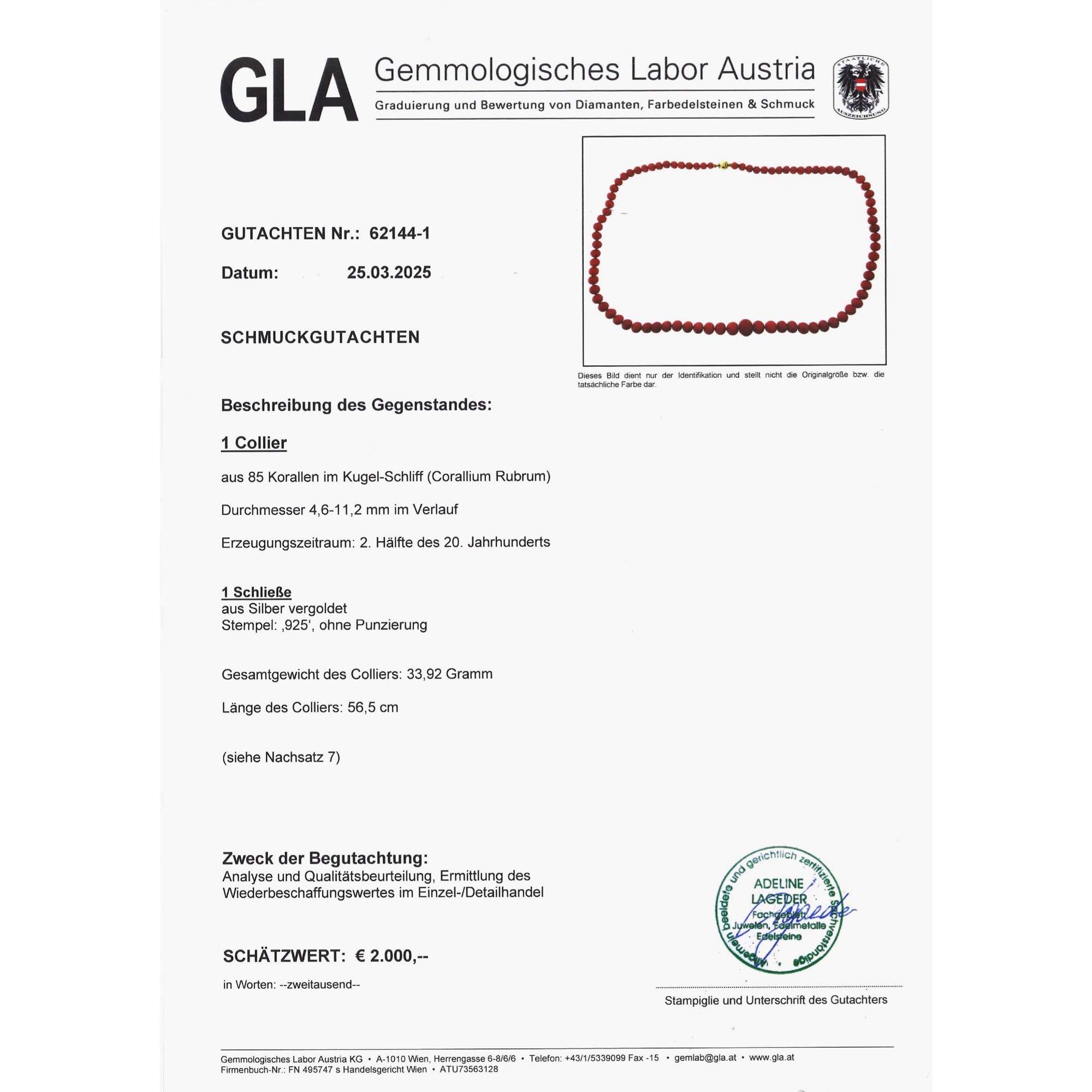 Wir haben die Kette neu aufziehen lassen und die Perlseide erneuern lassen und dazu ein Gutachten beauftragt, das die Wertigkeit der Koralle belegt.